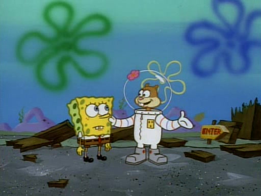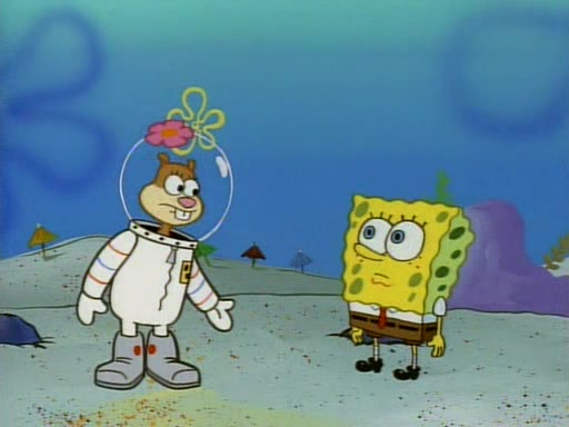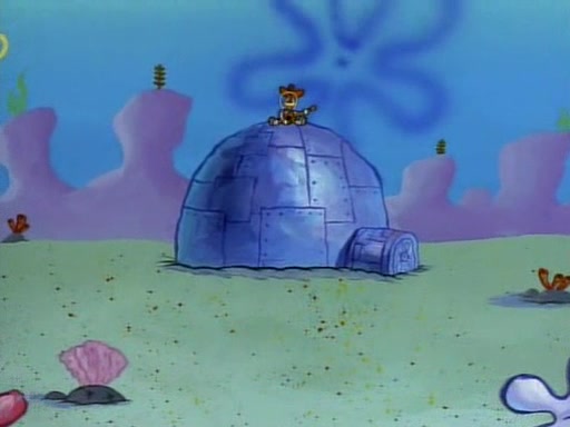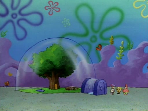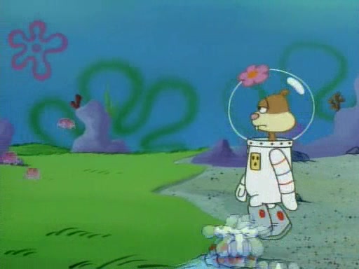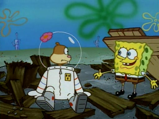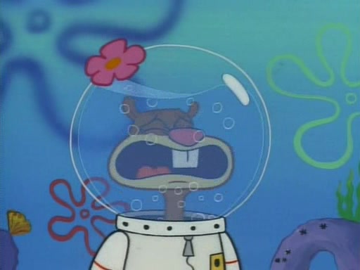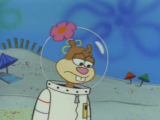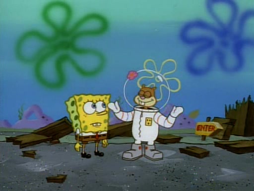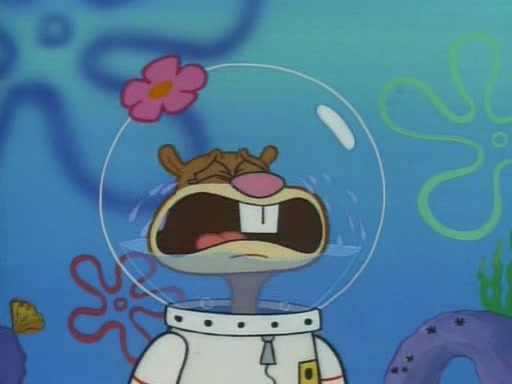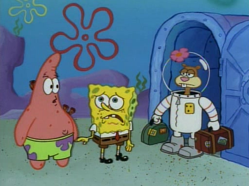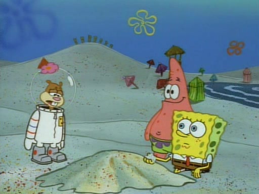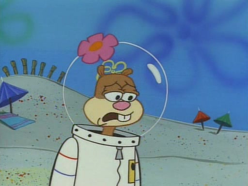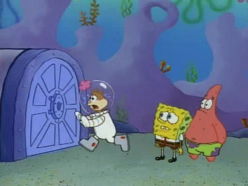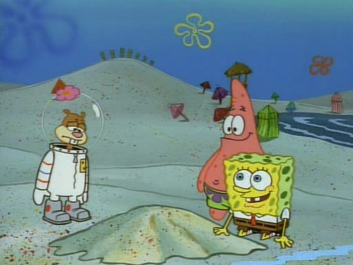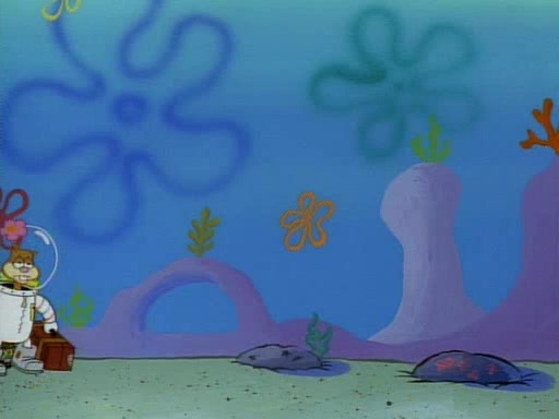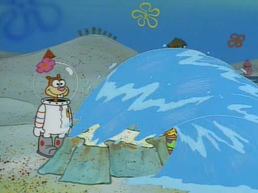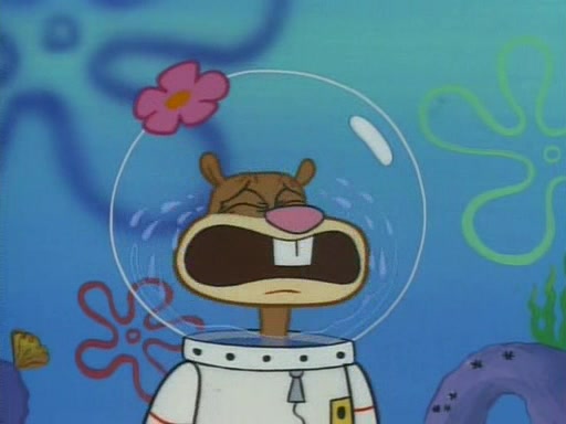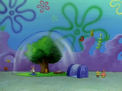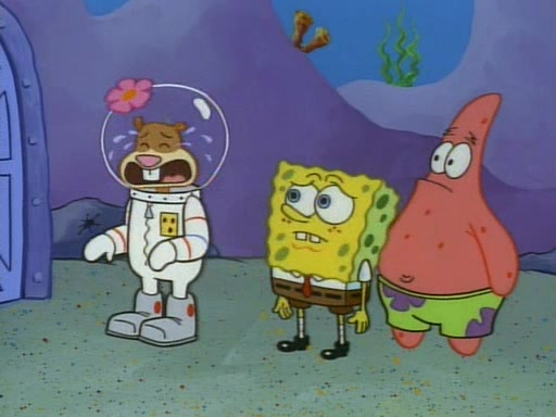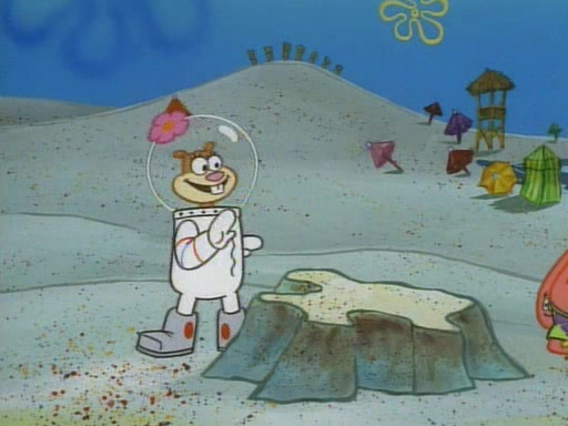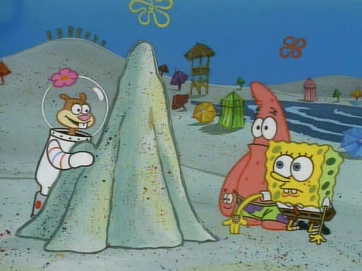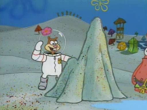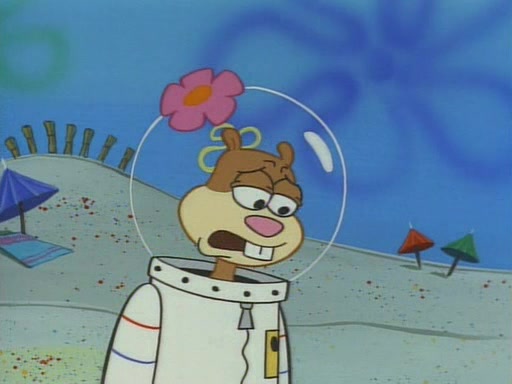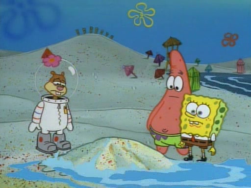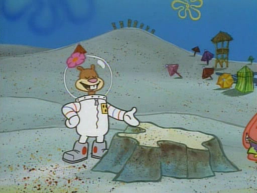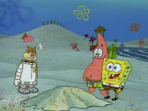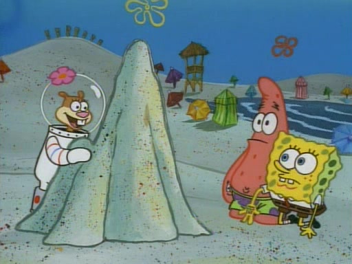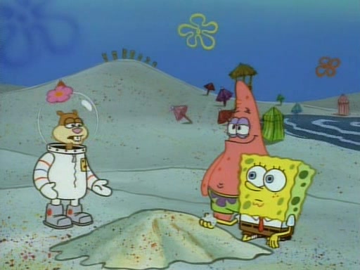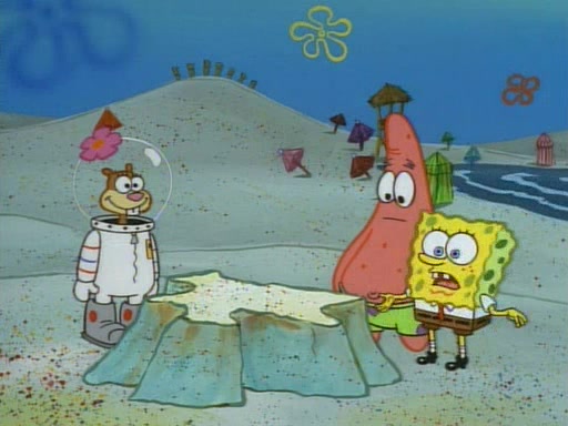 SpongeBob, Patrick and Sandy are playing in the sand at Goo Lagoon. Sandy makes some sand in the shape of Texas, which is soon destroyed by the tide. She walks off sadly, while SpongeBob tries to cheer her up and offers to play with her, but Sandy explains that she is just feeling a little homesick. SpongeBob and Patrick then blindfold her and take her to her treedome, which only adds to Sandy's depression. She begins crying, and runs off.