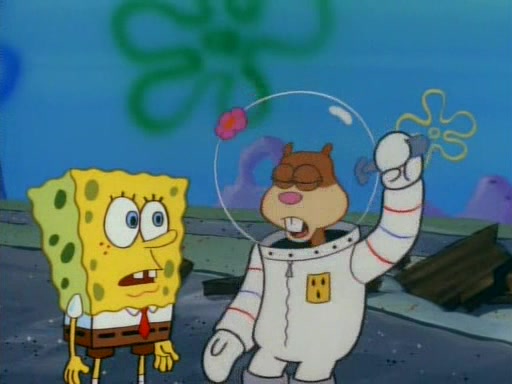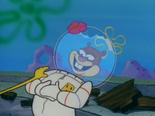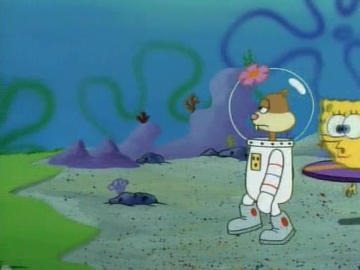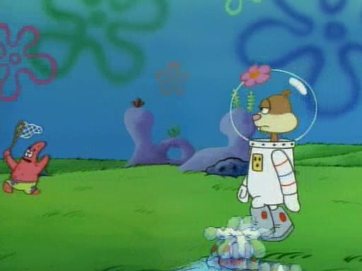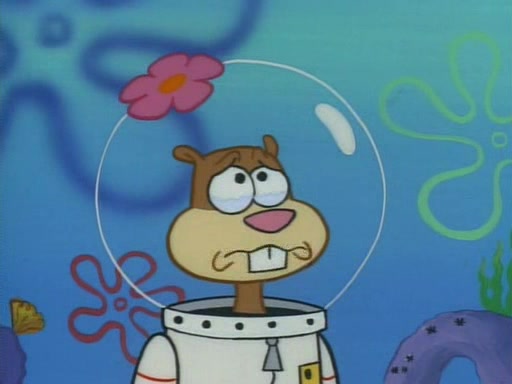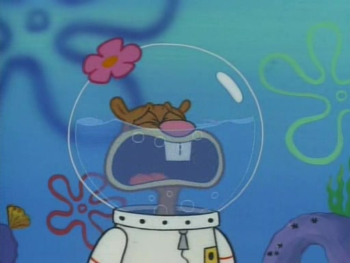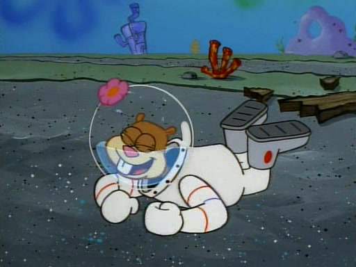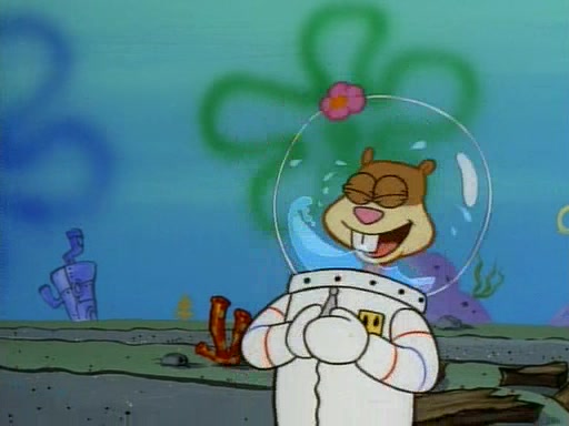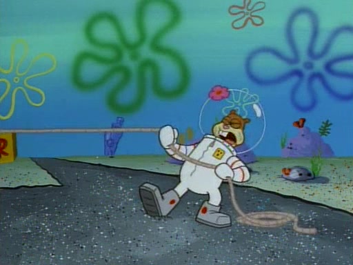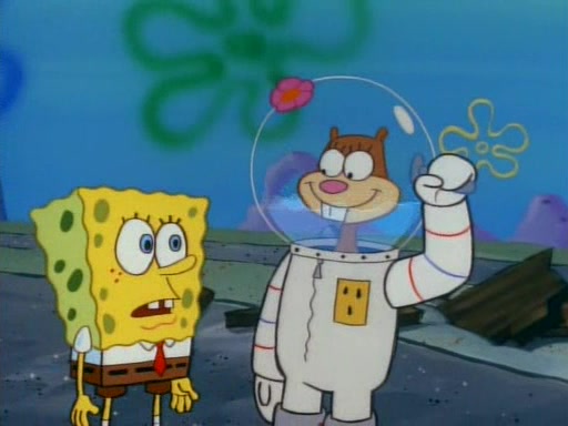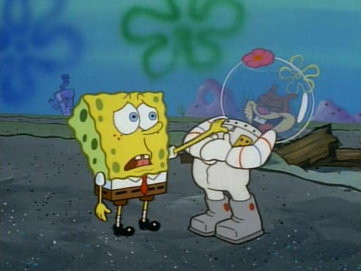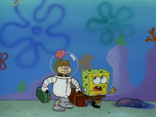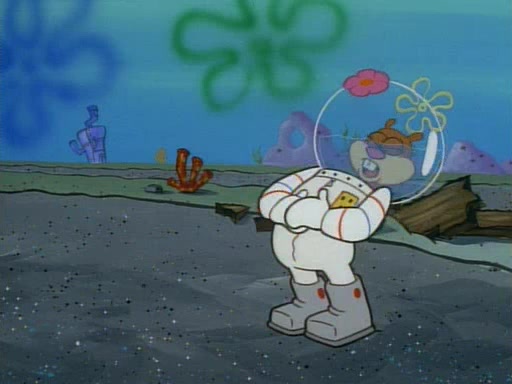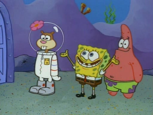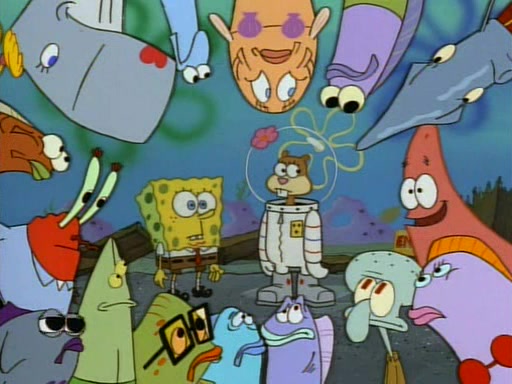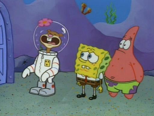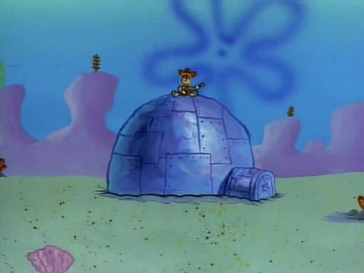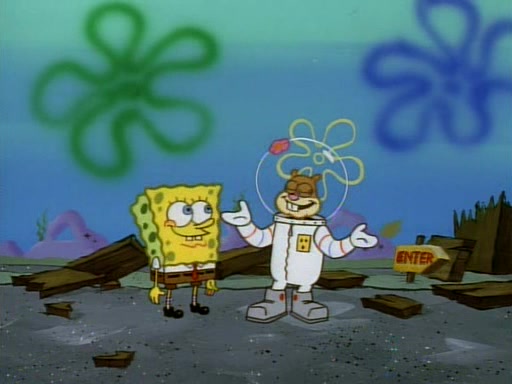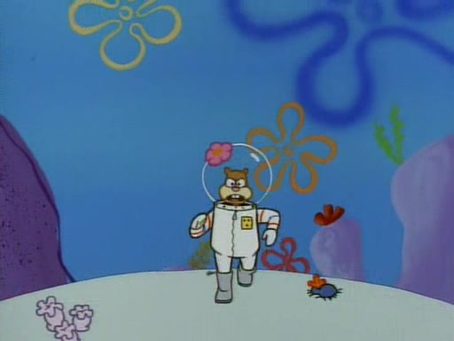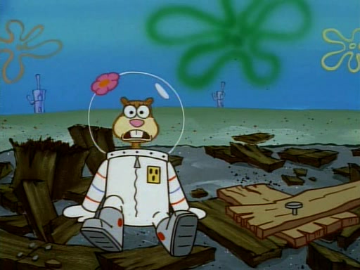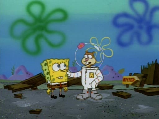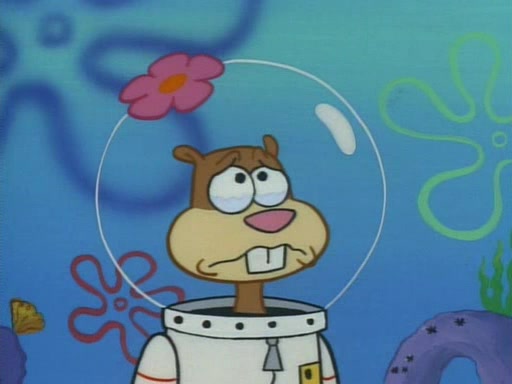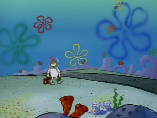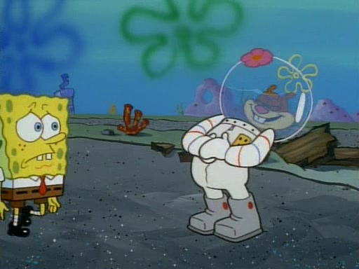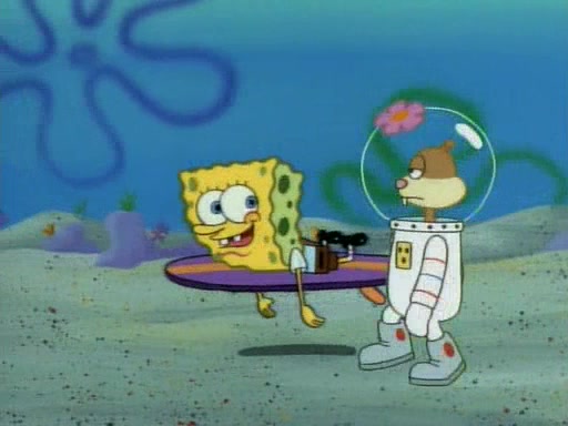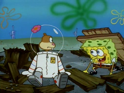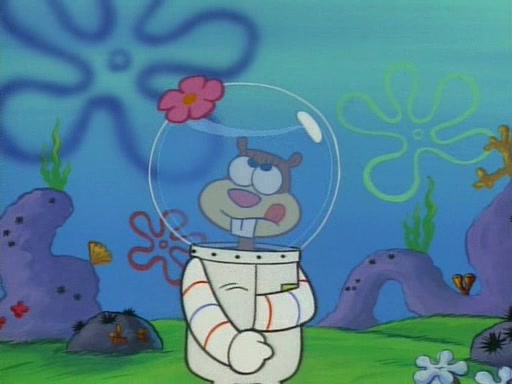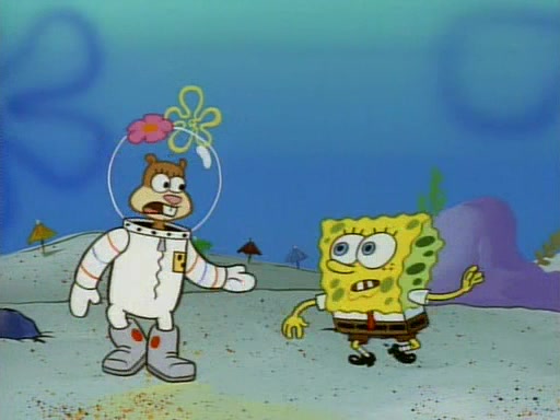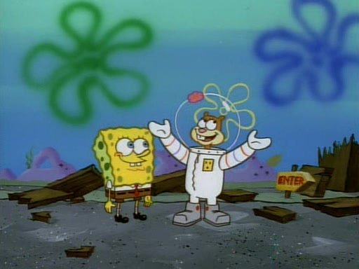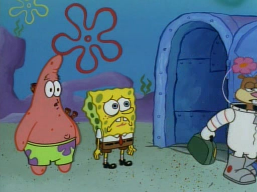 SpongeBob, Patrick and Sandy are playing in the sand at Goo Lagoon. Sandy makes some sand in the shape of Texas, which is soon destroyed by the tide. She walks off sadly, while SpongeBob tries to cheer her up and offers to play with her, but Sandy explains that she is just feeling a little homesick. SpongeBob and Patrick then blindfold her and take her to her treedome, which only adds to Sandy's depression. She begins crying, and runs off.