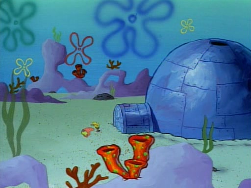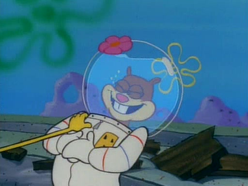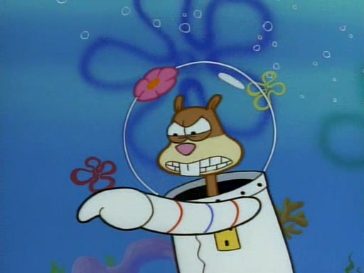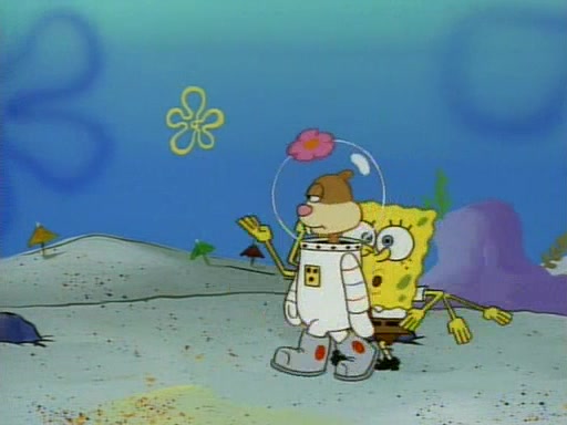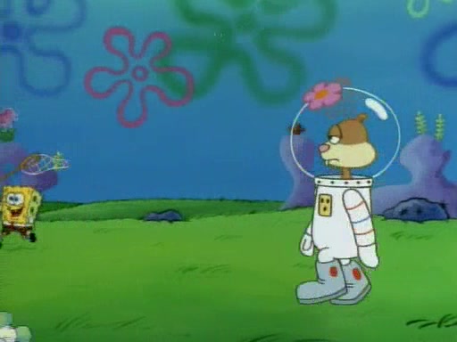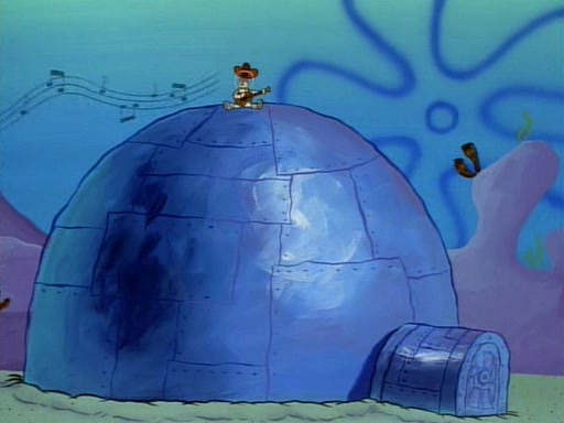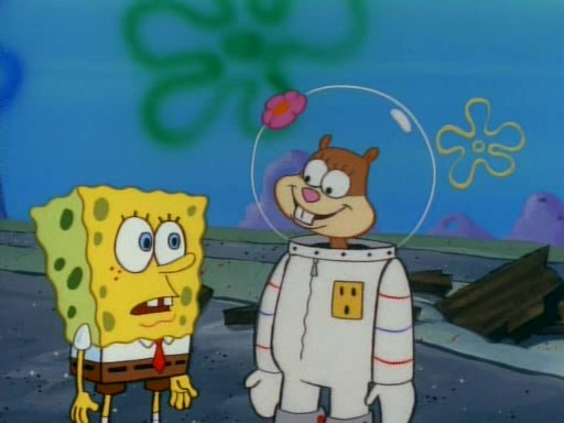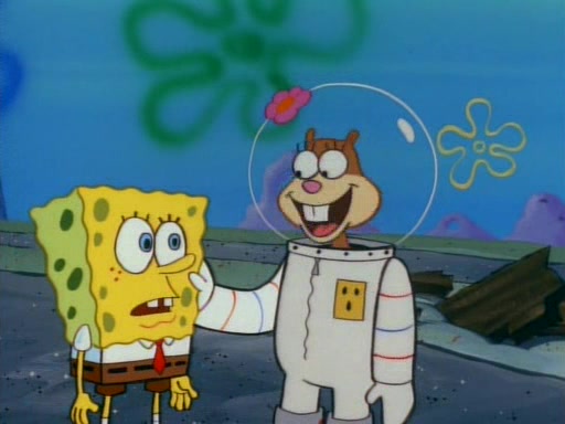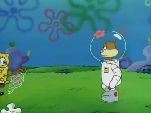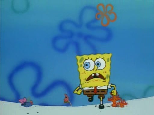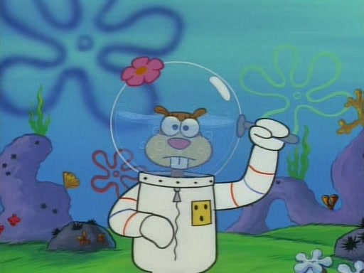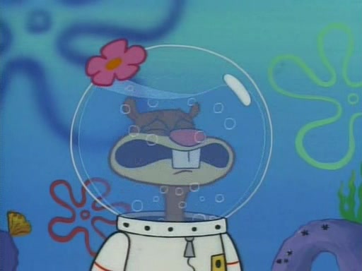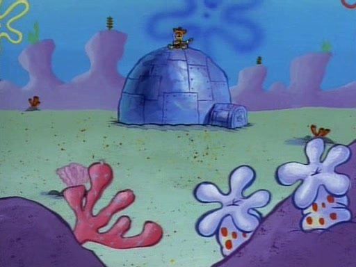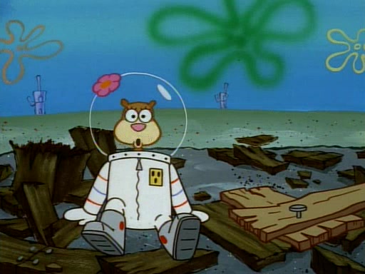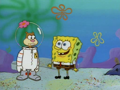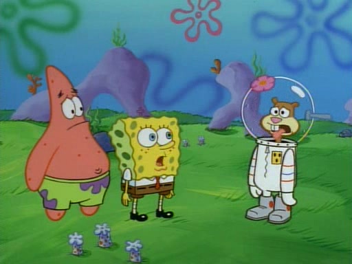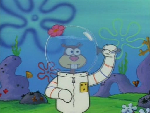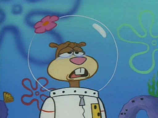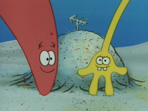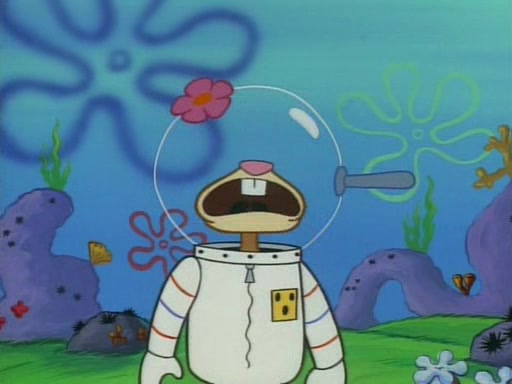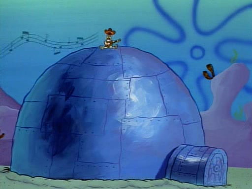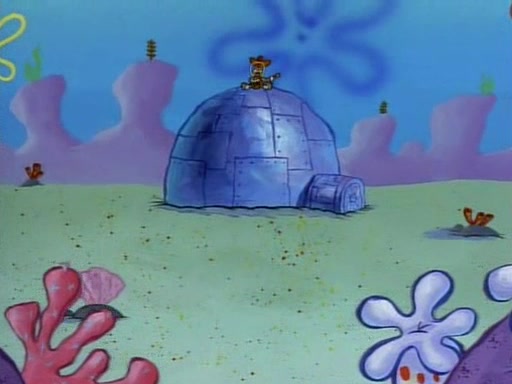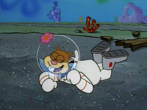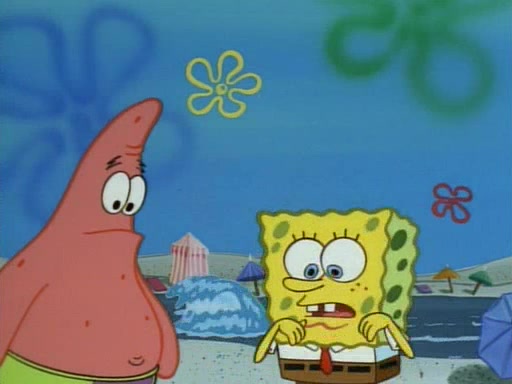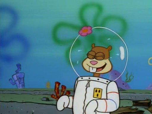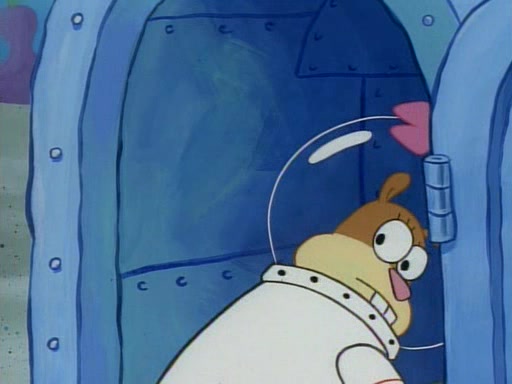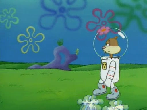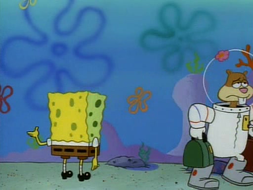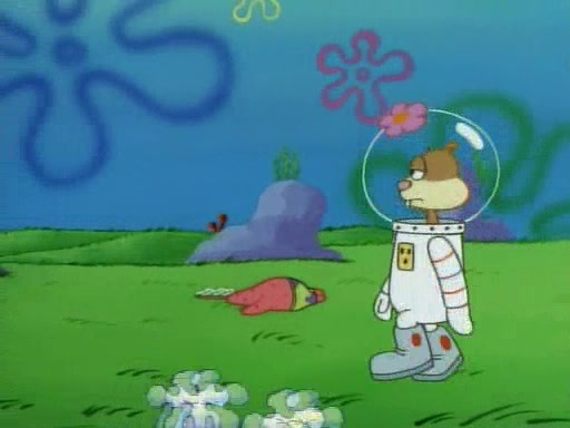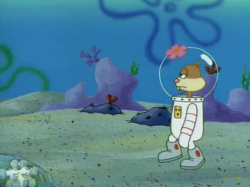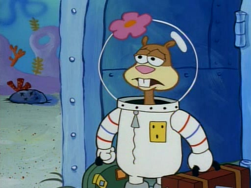 SpongeBob, Patrick and Sandy are playing in the sand at Goo Lagoon. Sandy makes some sand in the shape of Texas, which is soon destroyed by the tide. She walks off sadly, while SpongeBob tries to cheer her up and offers to play with her, but Sandy explains that she is just feeling a little homesick. SpongeBob and Patrick then blindfold her and take her to her treedome, which only adds to Sandy's depression. She begins crying, and runs off.