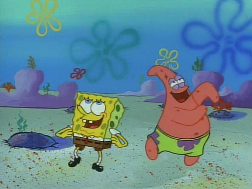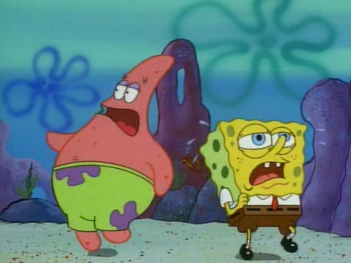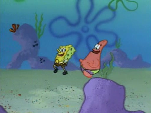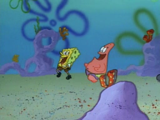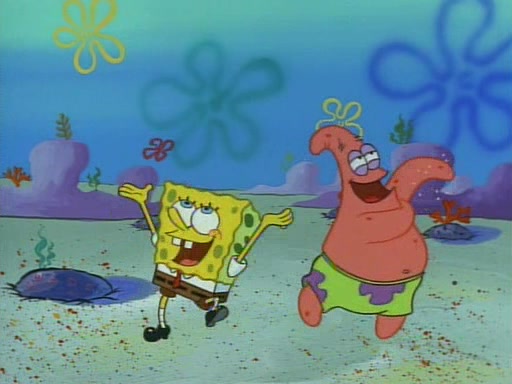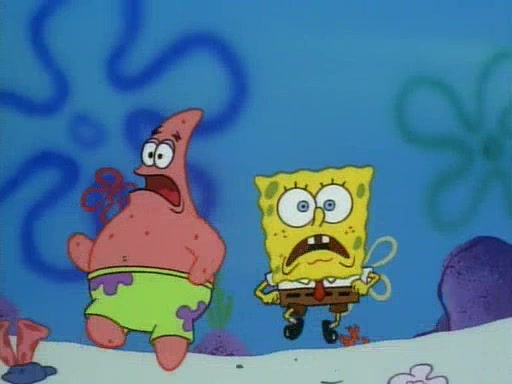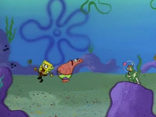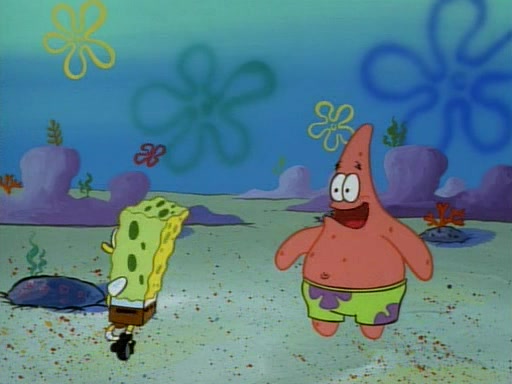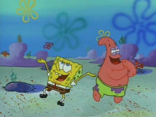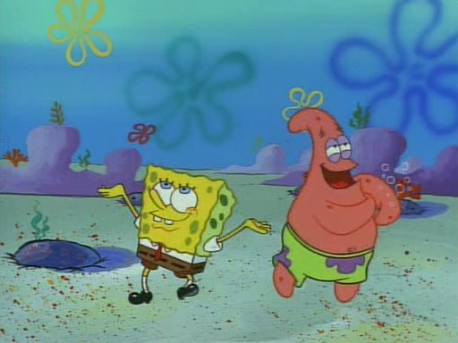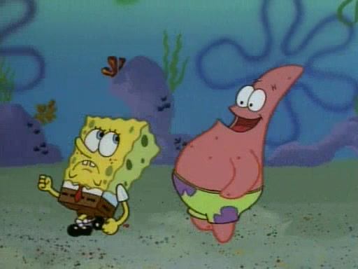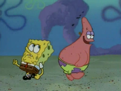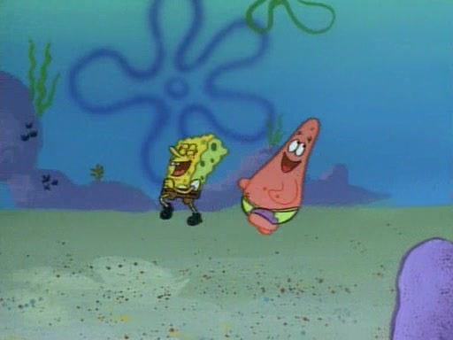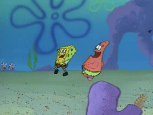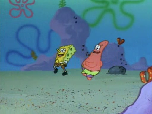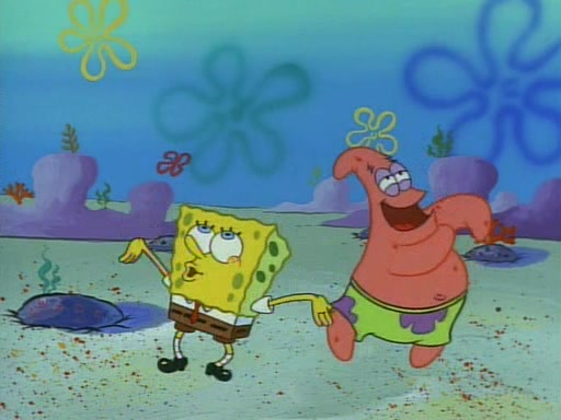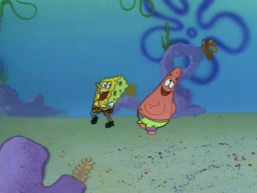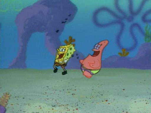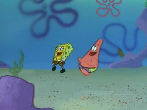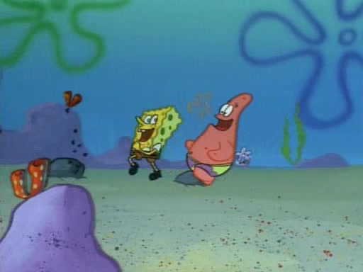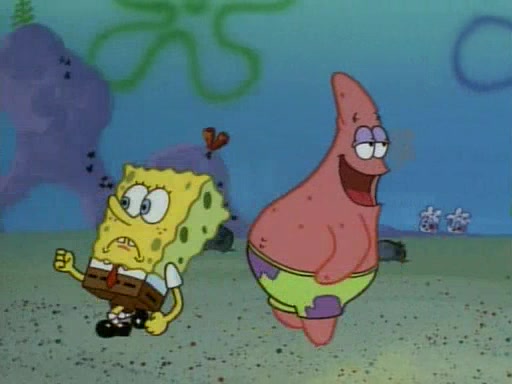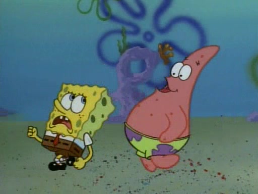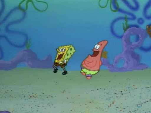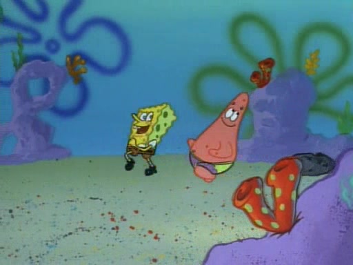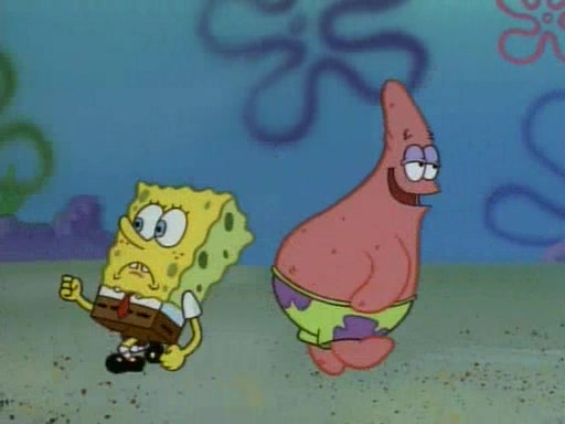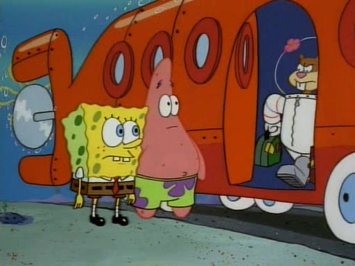 Suddenly, the bus comes back and Sandy returns, offended by Patrick's remark. Patrick then asks if he can say that people from Texas are dumb, which angers her even further. This gives SpongeBob an idea to lure Sandy to the Krusty Krab. He and Patrick continue insulting Texas, and Sandy begins chasing them. They intend to lead Sandy to her surprise party at the Krusty Krab. Patrick continuously insults Texas, thinking Sandy is too slow to catch up to them, only to soon realize that she is catching up to them.
