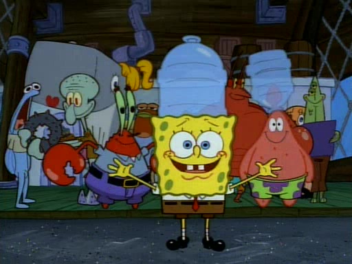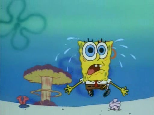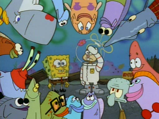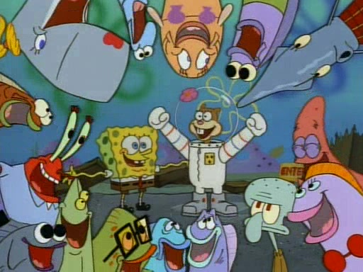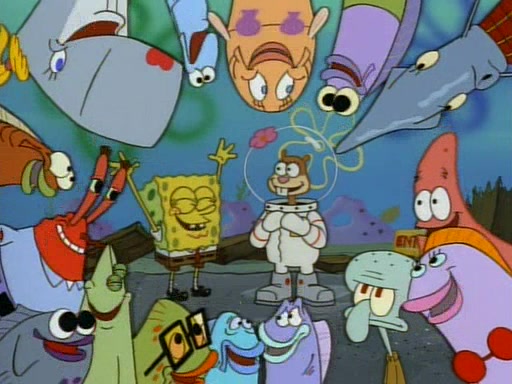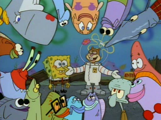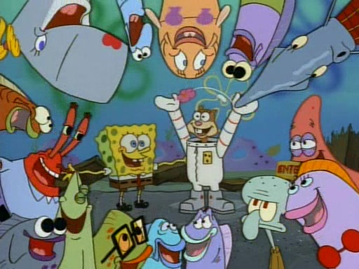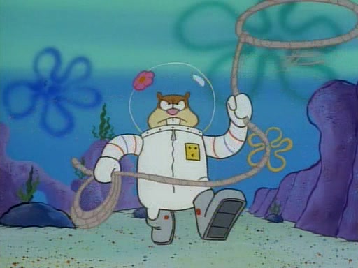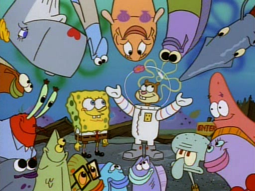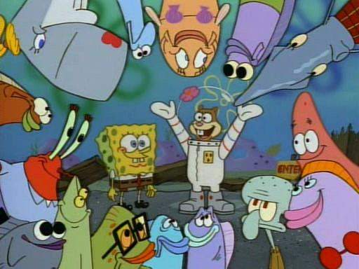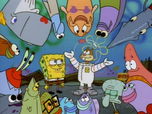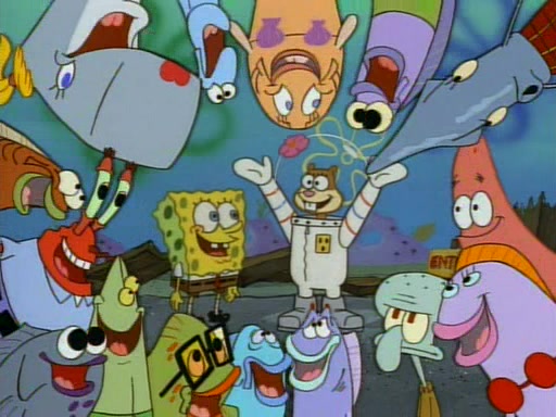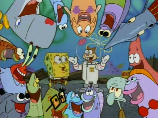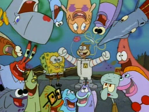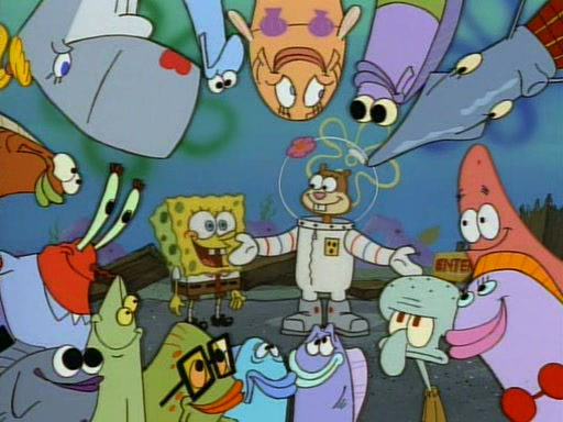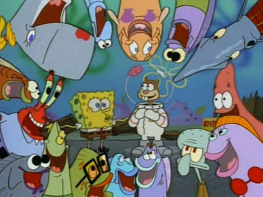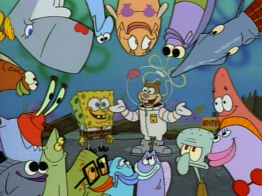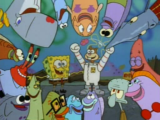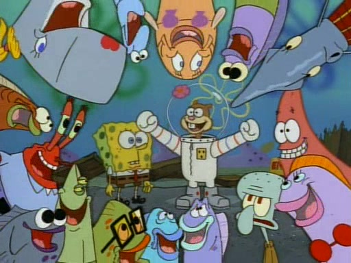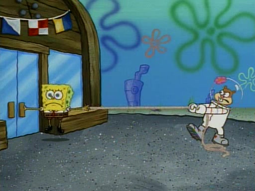 Sandy lassos Patrick and pulls him to her, and a nuclear explosion is shown in the background as he disappears. SpongeBob, still hoping to reach the Krusty Krab, begins screaming as he runs as fast as he can. Sandy's lasso reaches SpongeBob the instant he reaches the door of the Krusty Krab, and she attempts to pull him to her as he holds the door with one hand. Eventually, this causes the front of the building to be torn off, revealing the party inside. Sandy realizes how much her underwater friends care about her, and that Bikini Bottom has become her true home, and decides to stay. The crowd, except Squidward cheers at this, and Patrick says "Yeah, who needs dumb old Texas?" Sandy gets angry once again, and Patrick asks "Should I start running now?" as the episode ends.