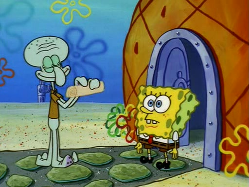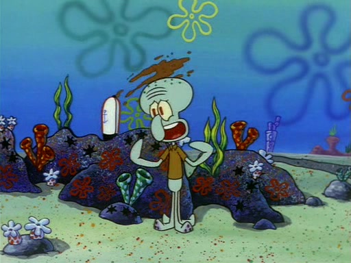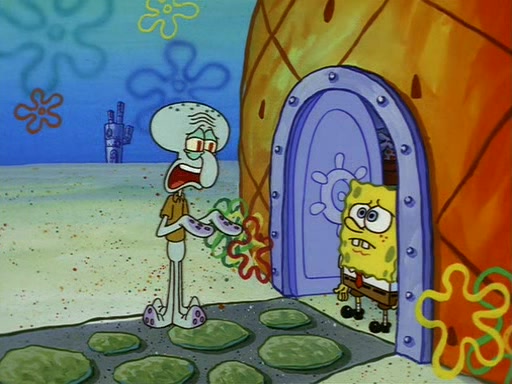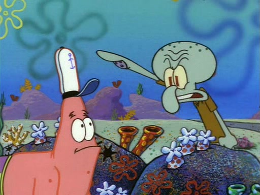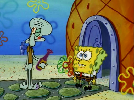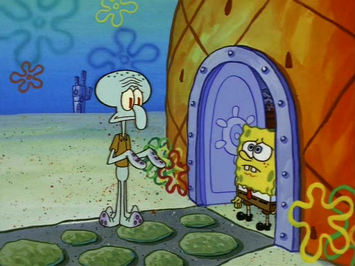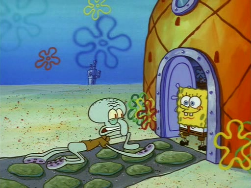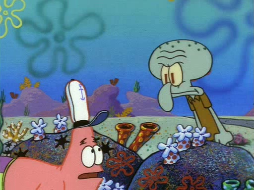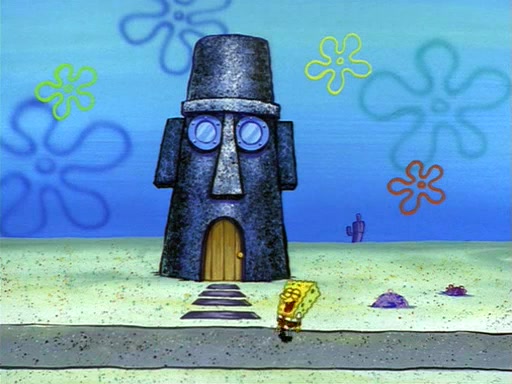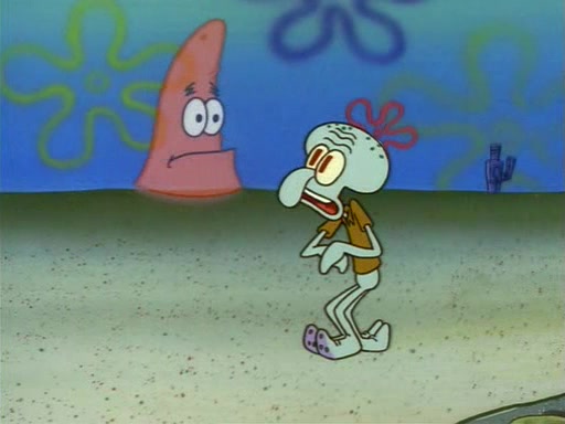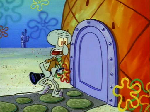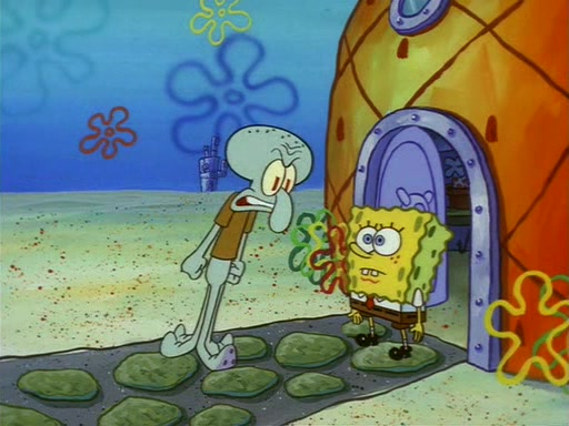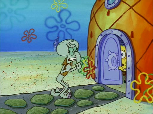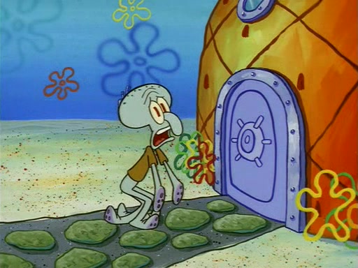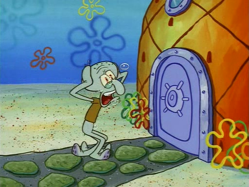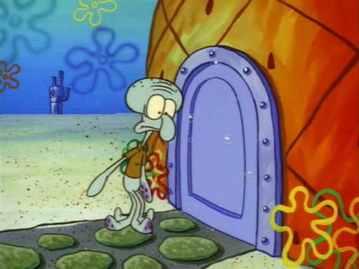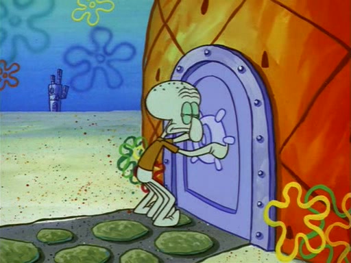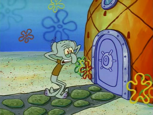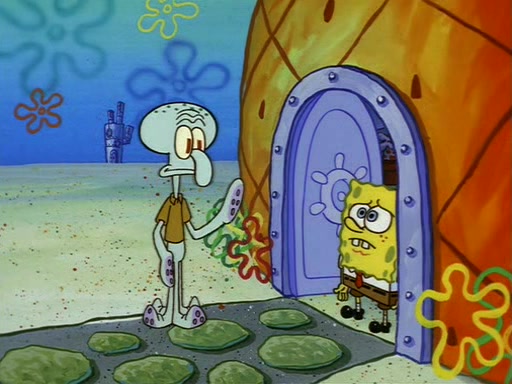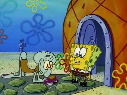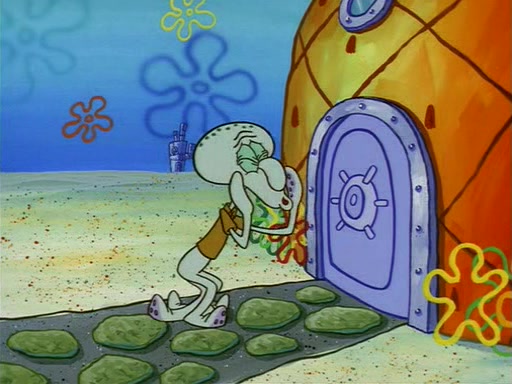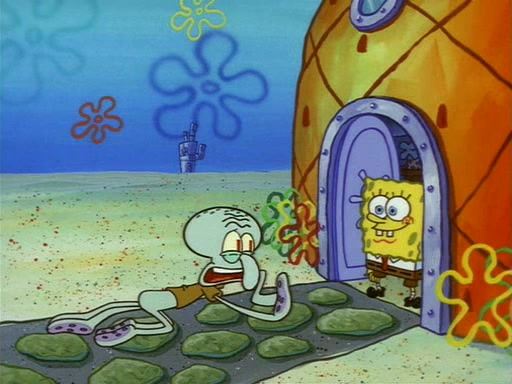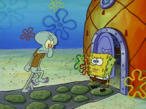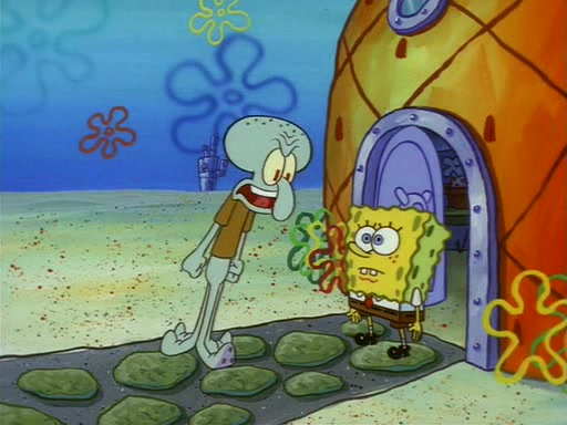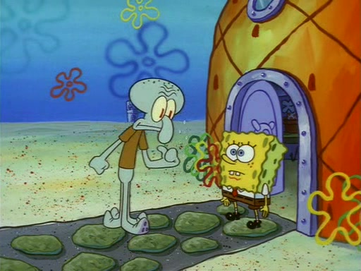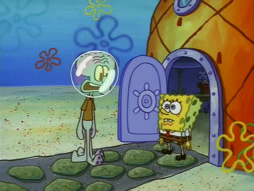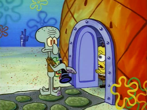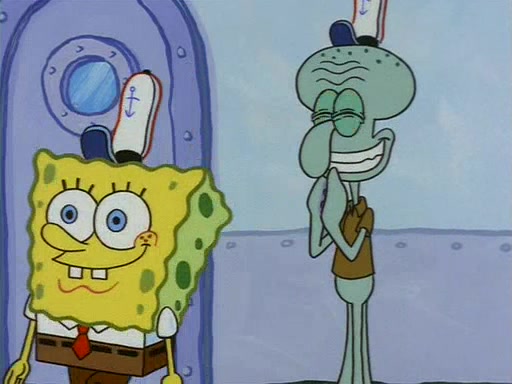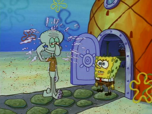 Squidward goes to SpongeBob's house and sees SpongeBob's hat behind a rock. Assuming it's SpongeBob, he goes over to apologize, but then sees that it's just Patrick wearing the hat and digging. Squidward asks where SpongeBob is and Patrick tells Squidward that SpongeBob is in the house "impressed" (instead of depressed) and was crying a lot. Squidward feels even worse and attempts to apologize when SpongeBob answers the door, but since apologizing to others isn't something he normally does, he initially finds himself to be physically incapable of simply saying "I'm sorry" to him.