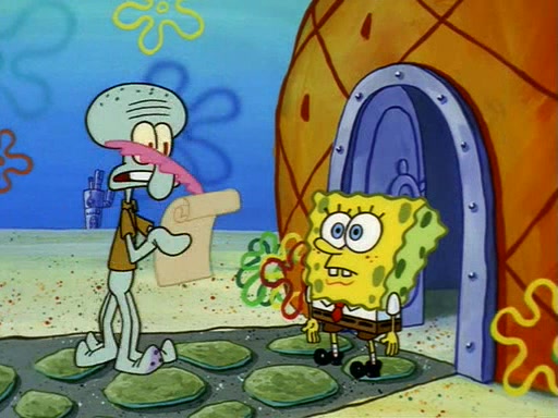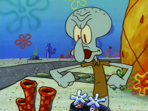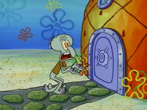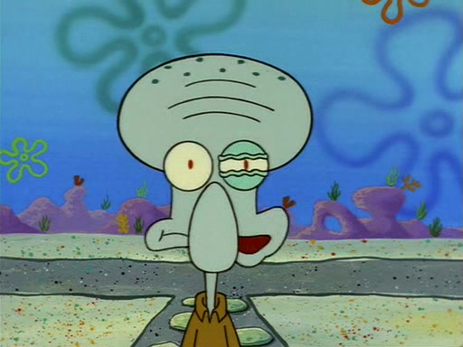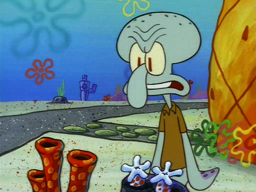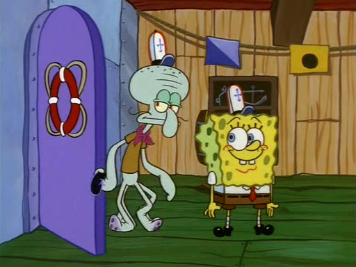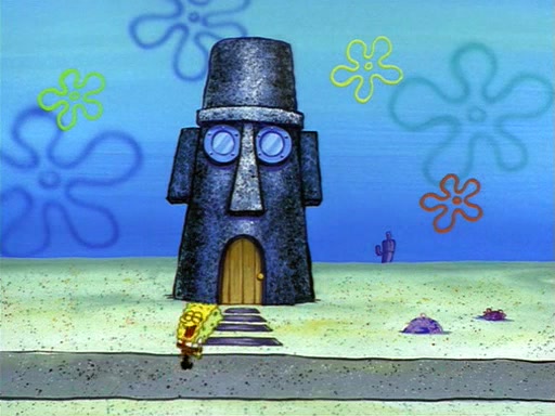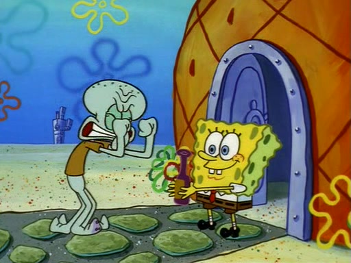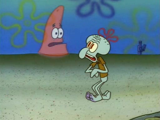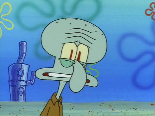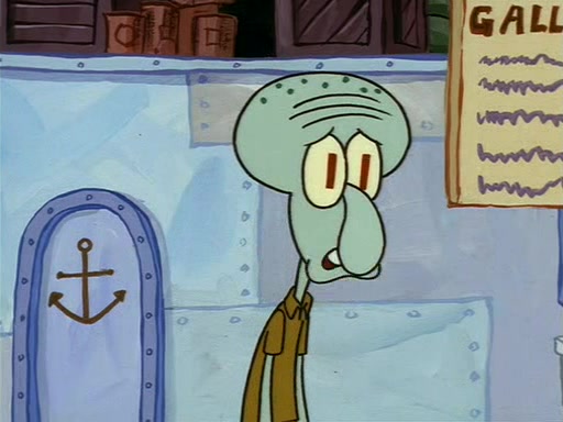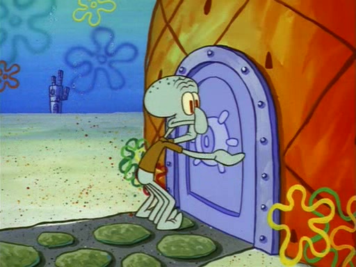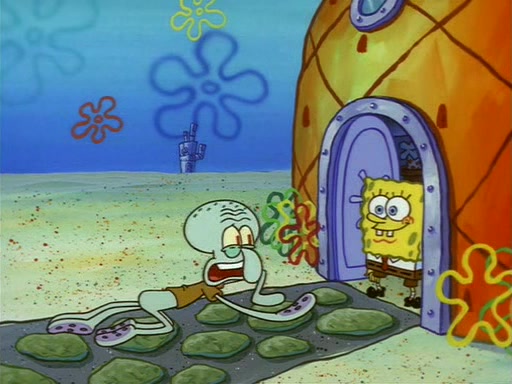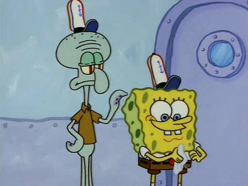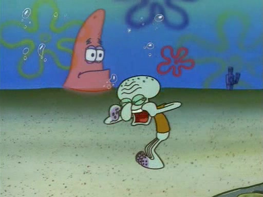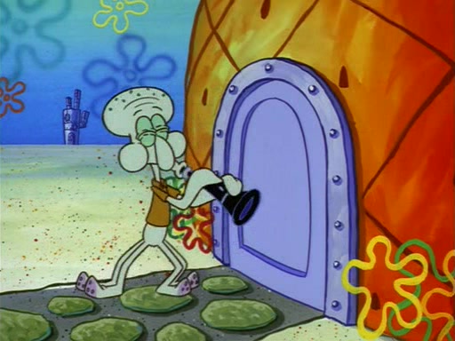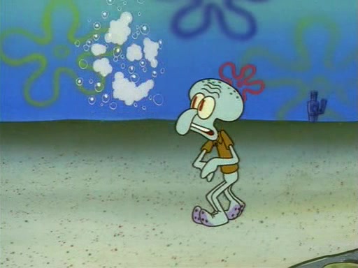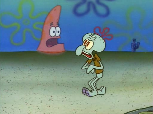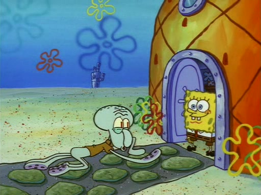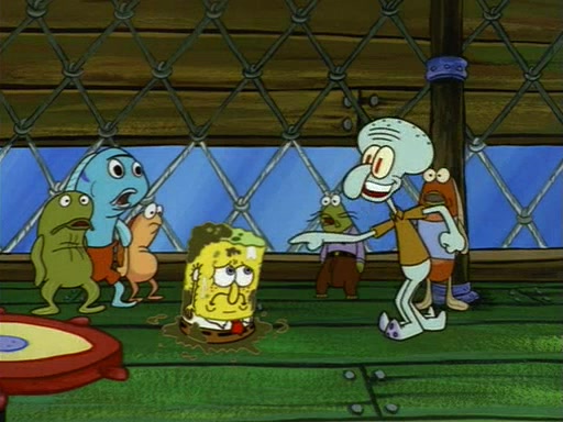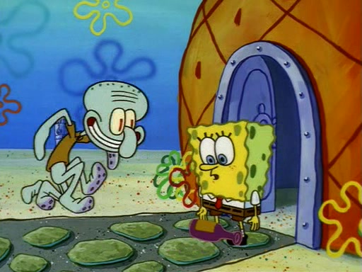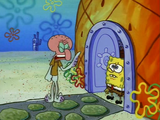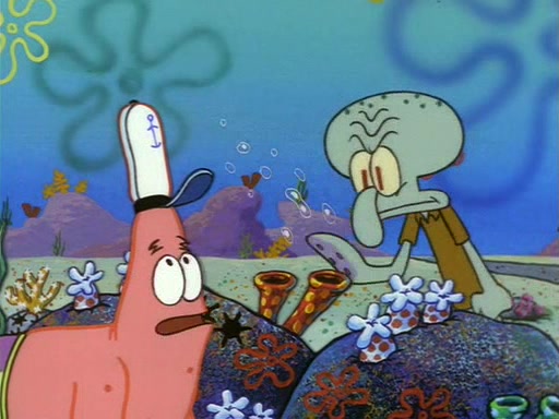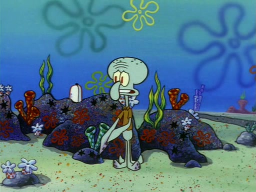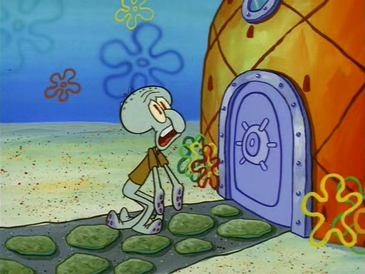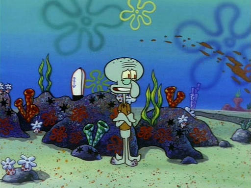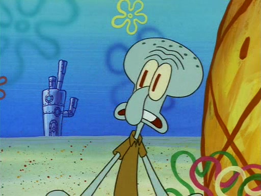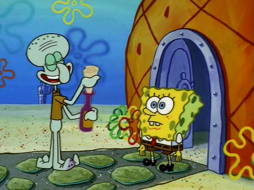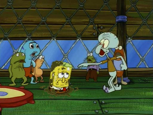 Squidward goes to SpongeBob's house and sees SpongeBob's hat behind a rock. Assuming it's SpongeBob, he goes over to apologize, but then sees that it's just Patrick wearing the hat and digging. Squidward asks where SpongeBob is and Patrick tells Squidward that SpongeBob is in the house "impressed" (instead of depressed) and was crying a lot. Squidward feels even worse and attempts to apologize when SpongeBob answers the door, but since apologizing to others isn't something he normally does, he initially finds himself to be physically incapable of simply saying "I'm sorry" to him.