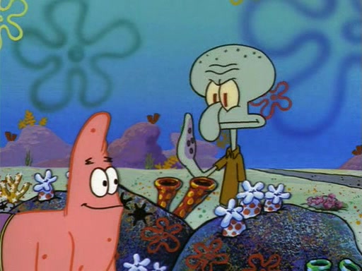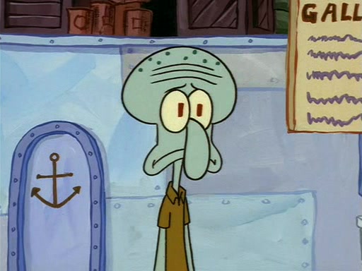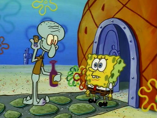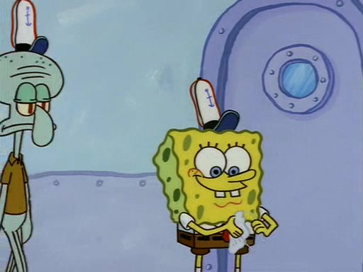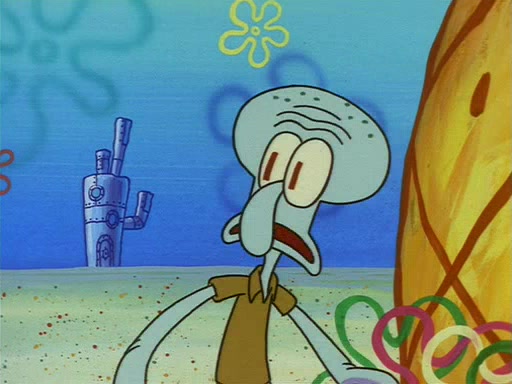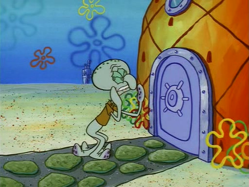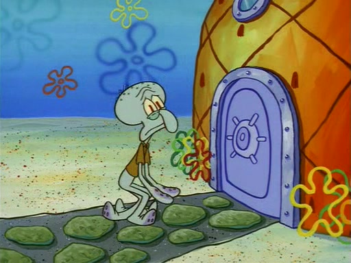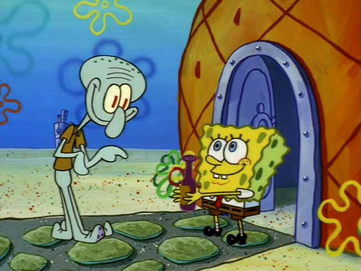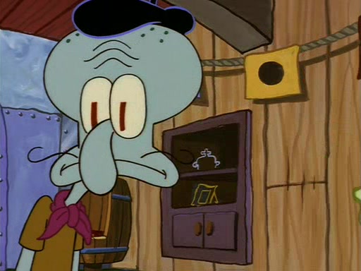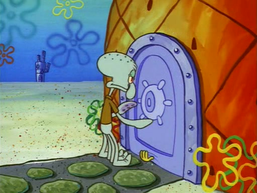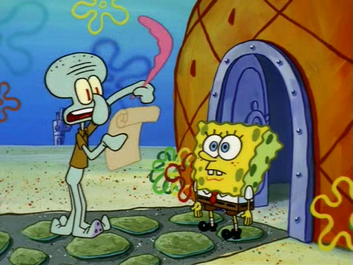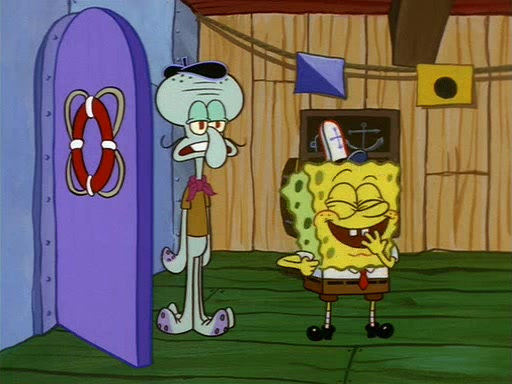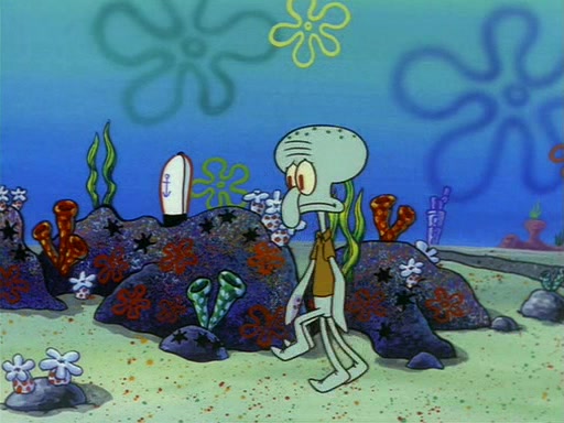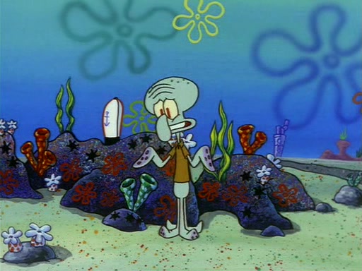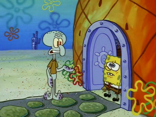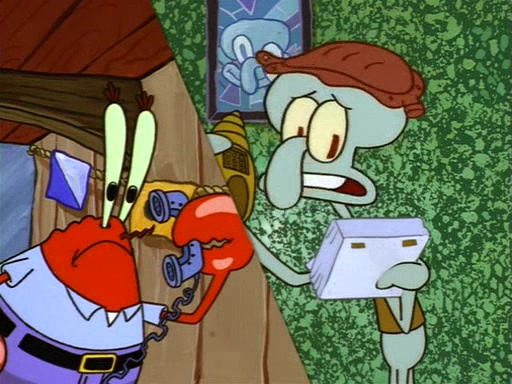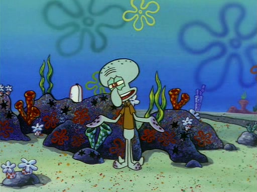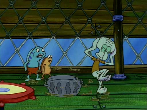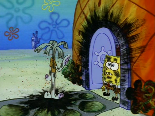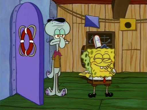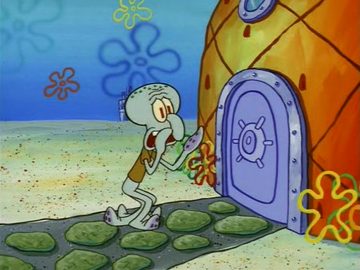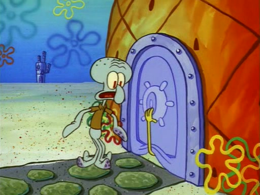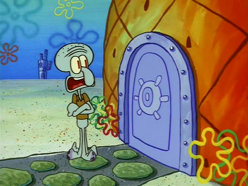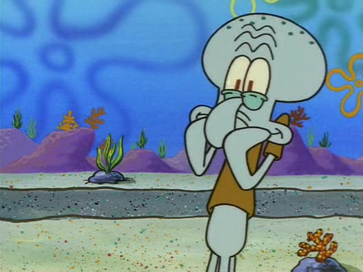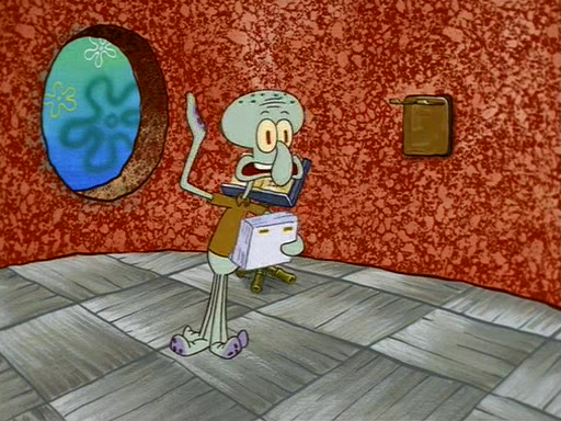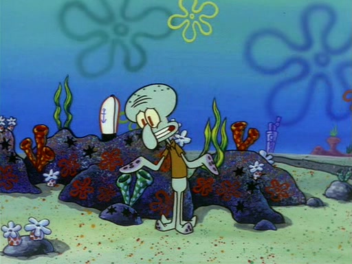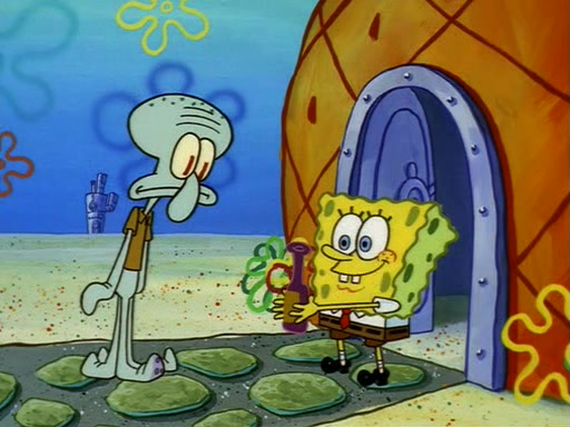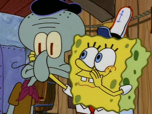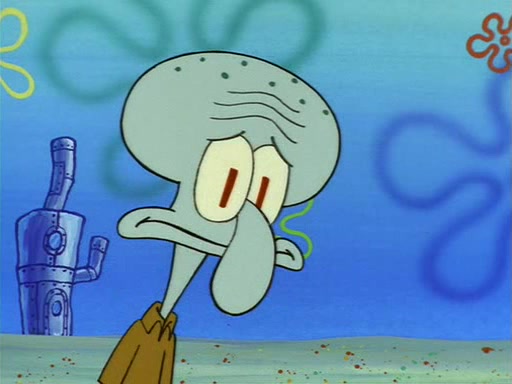 Squidward goes to SpongeBob's house and sees SpongeBob's hat behind a rock. Assuming it's SpongeBob, he goes over to apologize, but then sees that it's just Patrick wearing the hat and digging. Squidward asks where SpongeBob is and Patrick tells Squidward that SpongeBob is in the house "impressed" (instead of depressed) and was crying a lot. Squidward feels even worse and attempts to apologize when SpongeBob answers the door, but since apologizing to others isn't something he normally does, he initially finds himself to be physically incapable of simply saying "I'm sorry" to him.