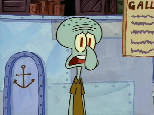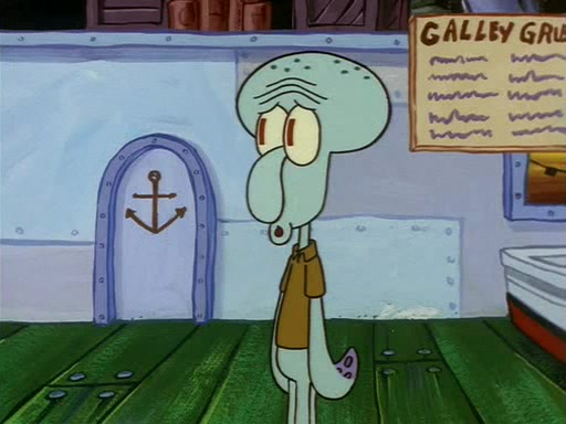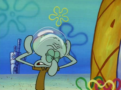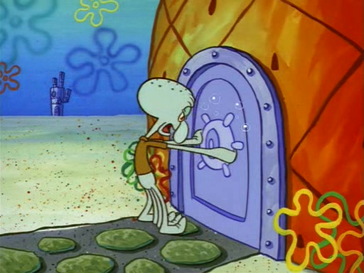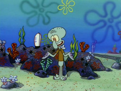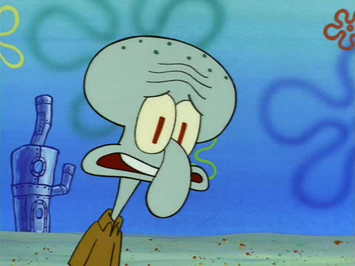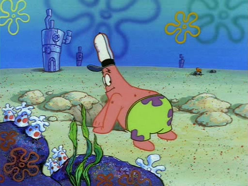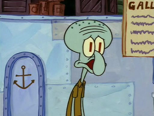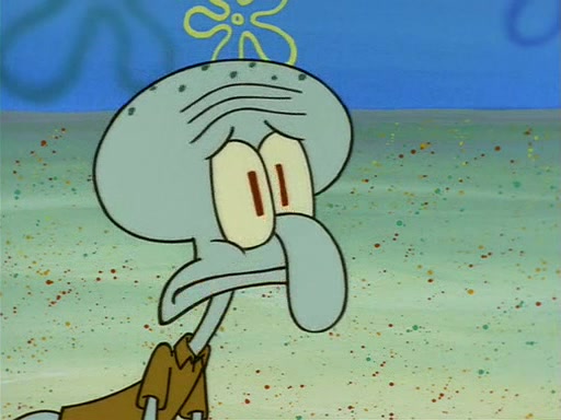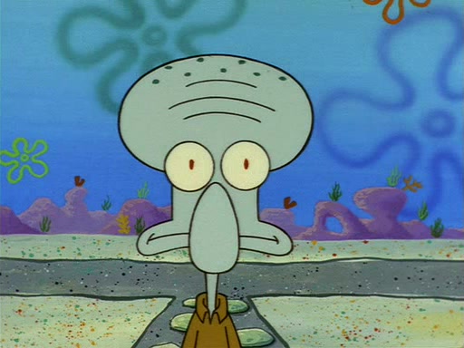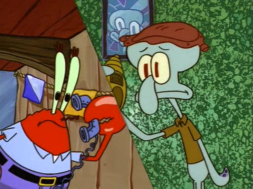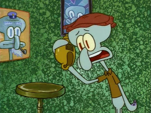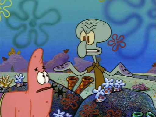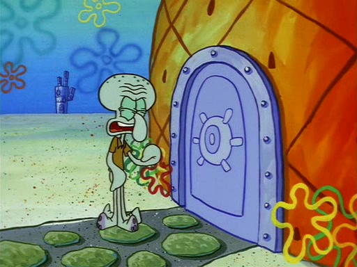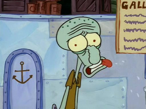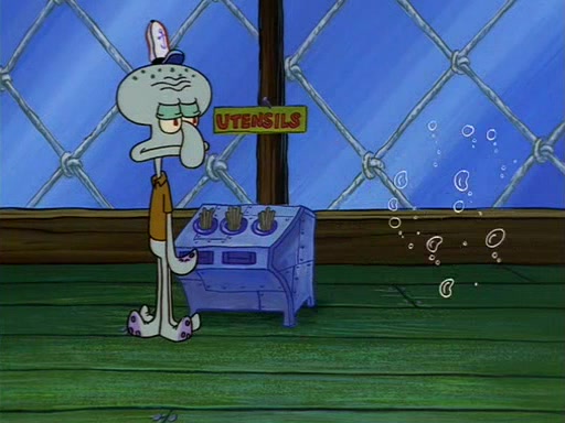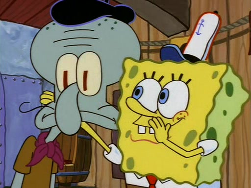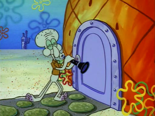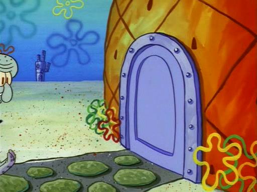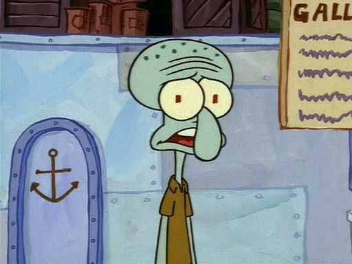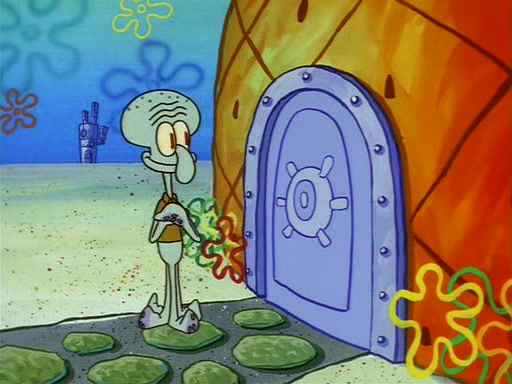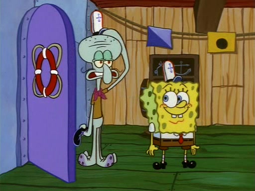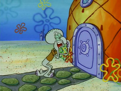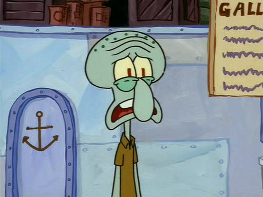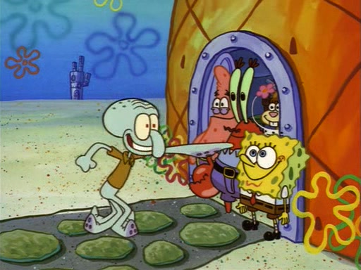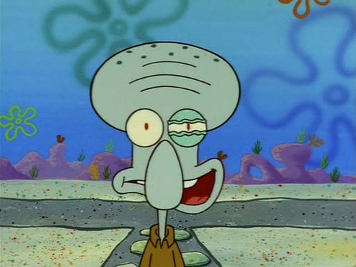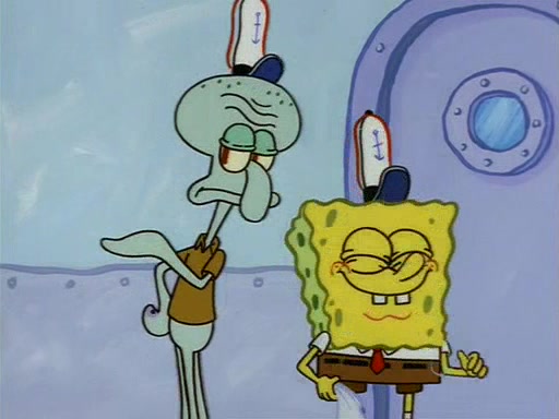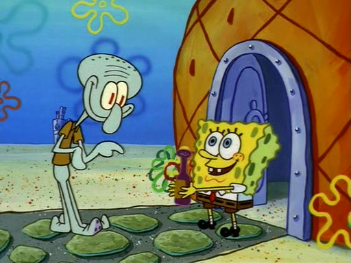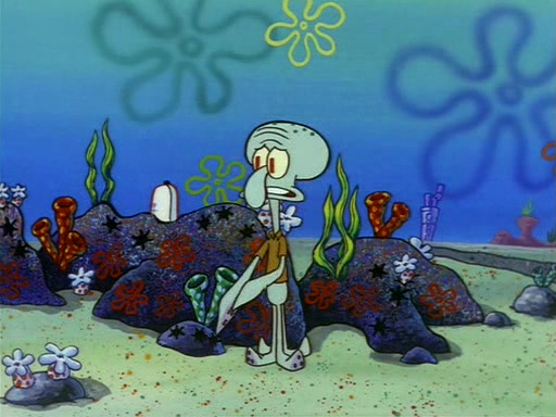 Squidward goes to SpongeBob's house and sees SpongeBob's hat behind a rock. Assuming it's SpongeBob, he goes over to apologize, but then sees that it's just Patrick wearing the hat and digging. Squidward asks where SpongeBob is and Patrick tells Squidward that SpongeBob is in the house "impressed" (instead of depressed) and was crying a lot. Squidward feels even worse and attempts to apologize when SpongeBob answers the door, but since apologizing to others isn't something he normally does, he initially finds himself to be physically incapable of simply saying "I'm sorry" to him.
