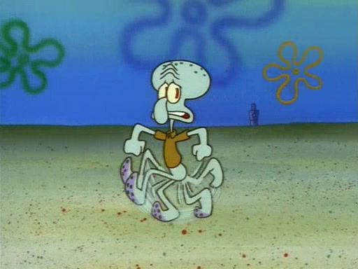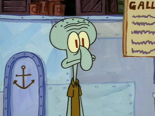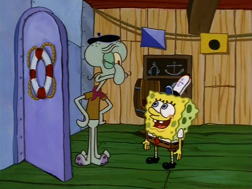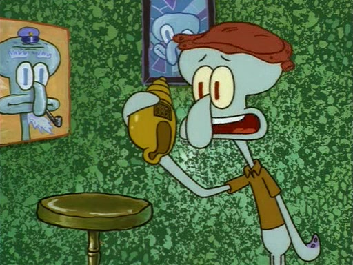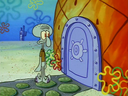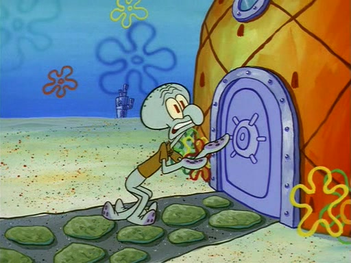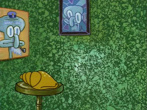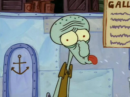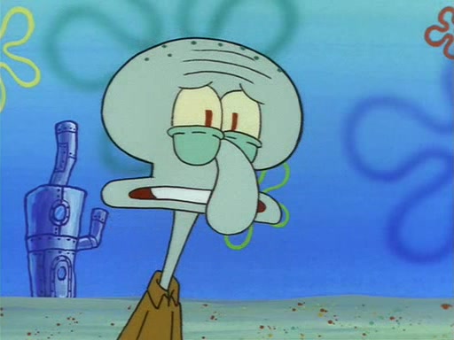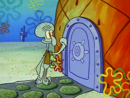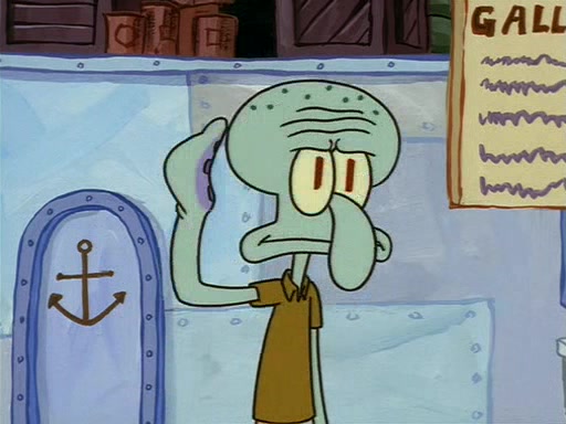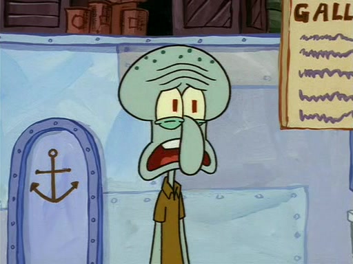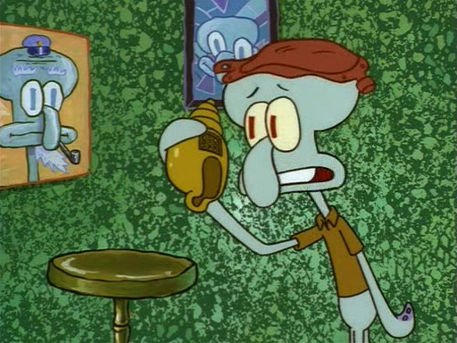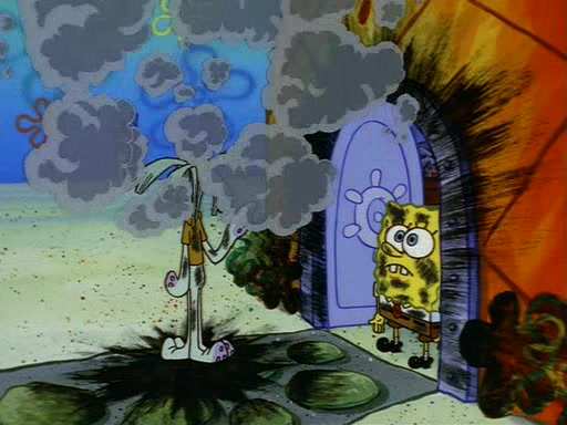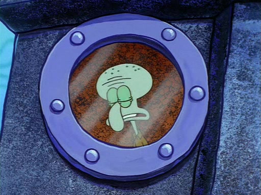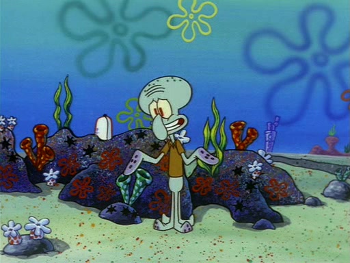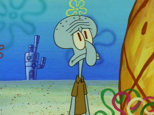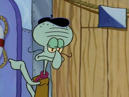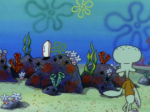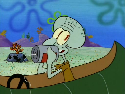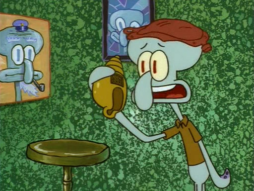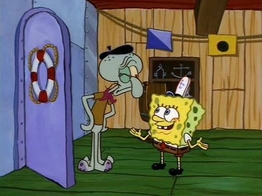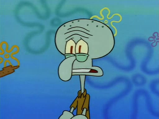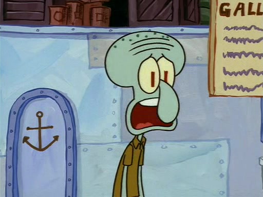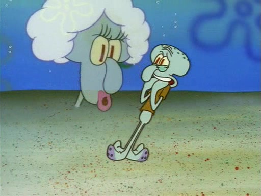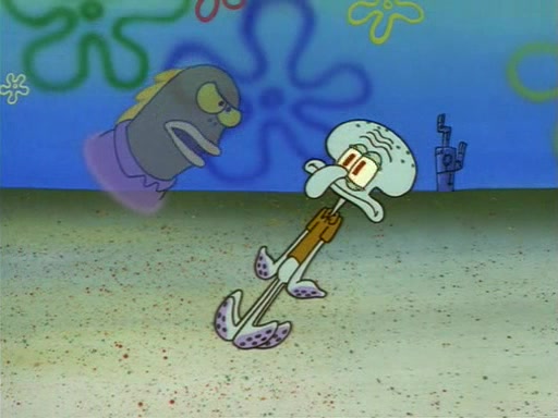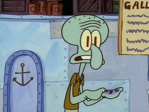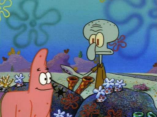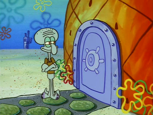 Squidward goes to SpongeBob's house and sees SpongeBob's hat behind a rock. Assuming it's SpongeBob, he goes over to apologize, but then sees that it's just Patrick wearing the hat and digging. Squidward asks where SpongeBob is and Patrick tells Squidward that SpongeBob is in the house "impressed" (instead of depressed) and was crying a lot. Squidward feels even worse and attempts to apologize when SpongeBob answers the door, but since apologizing to others isn't something he normally does, he initially finds himself to be physically incapable of simply saying "I'm sorry" to him.