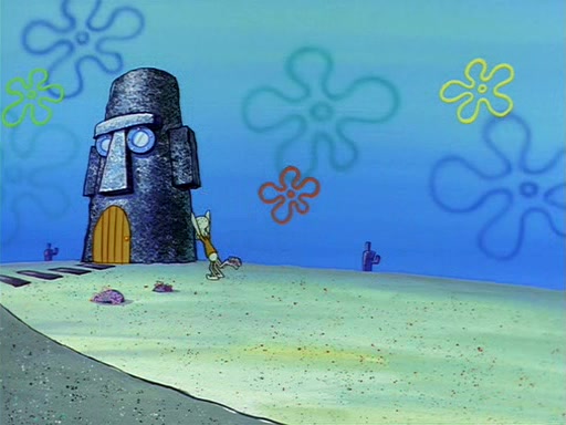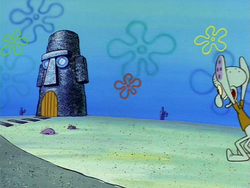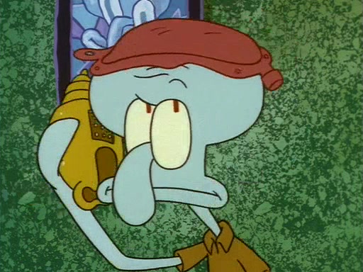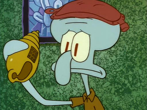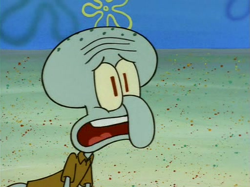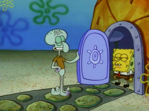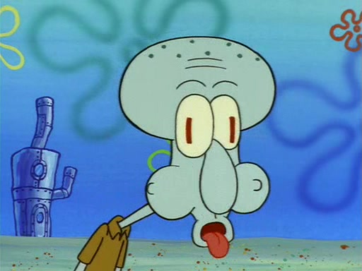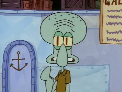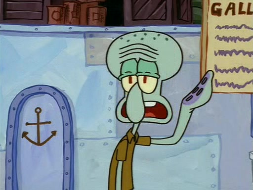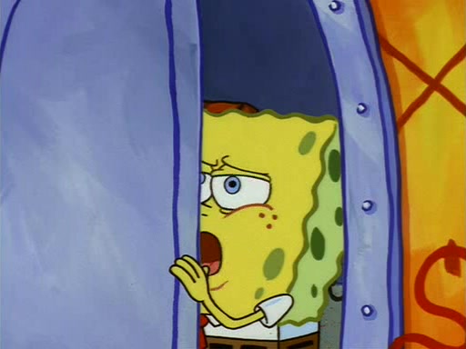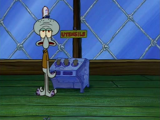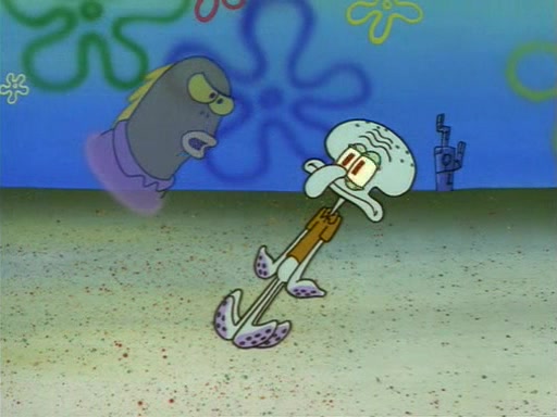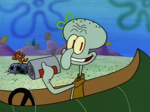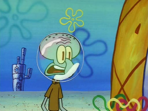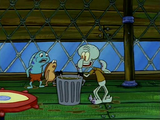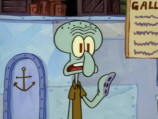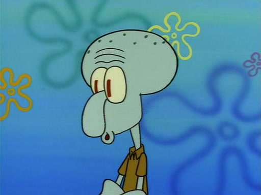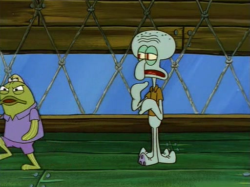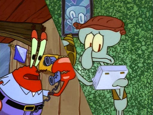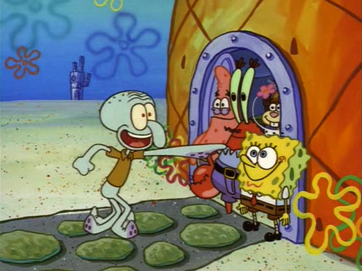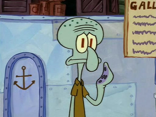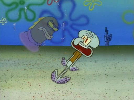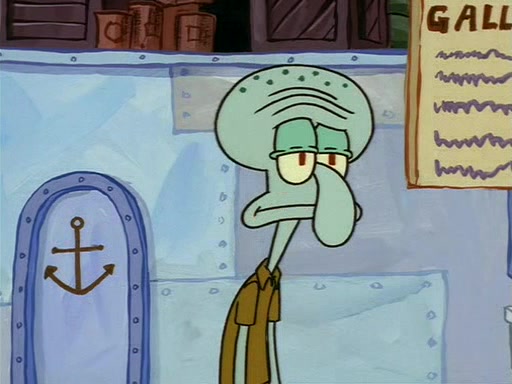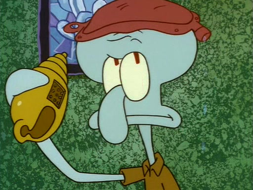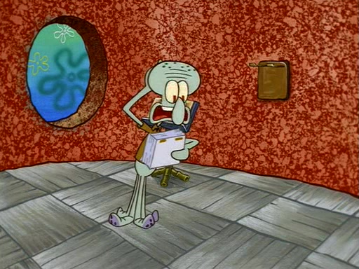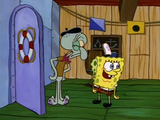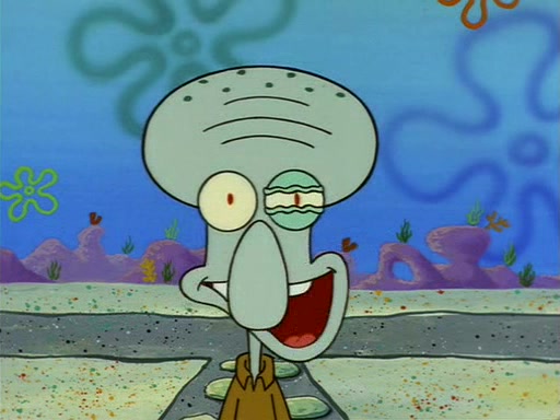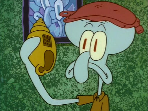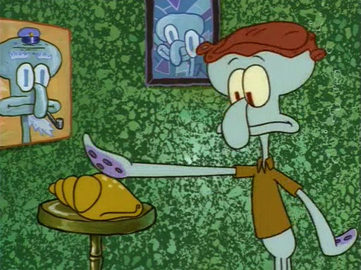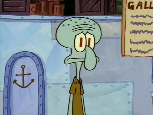 Squidward goes to SpongeBob's house and sees SpongeBob's hat behind a rock. Assuming it's SpongeBob, he goes over to apologize, but then sees that it's just Patrick wearing the hat and digging. Squidward asks where SpongeBob is and Patrick tells Squidward that SpongeBob is in the house "impressed" (instead of depressed) and was crying a lot. Squidward feels even worse and attempts to apologize when SpongeBob answers the door, but since apologizing to others isn't something he normally does, he initially finds himself to be physically incapable of simply saying "I'm sorry" to him.