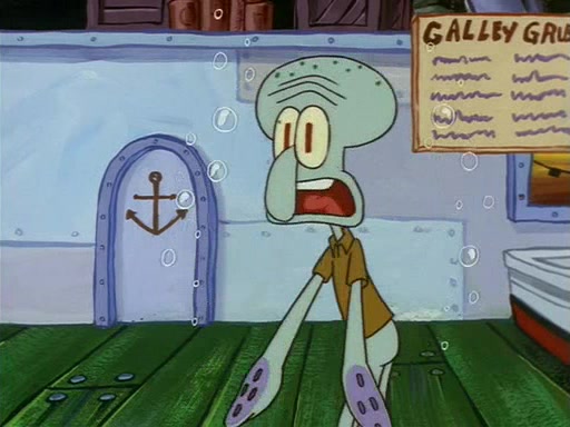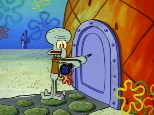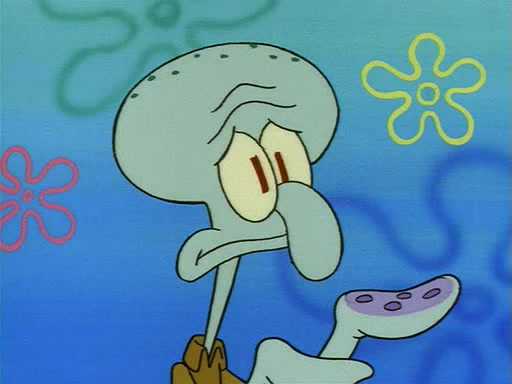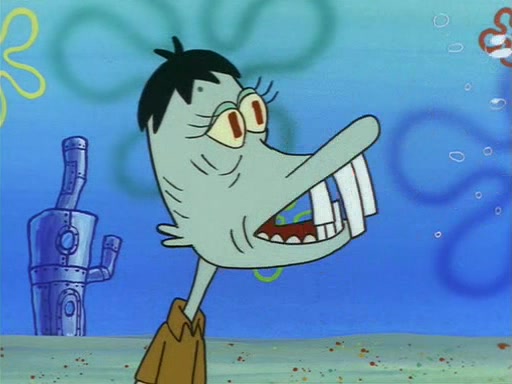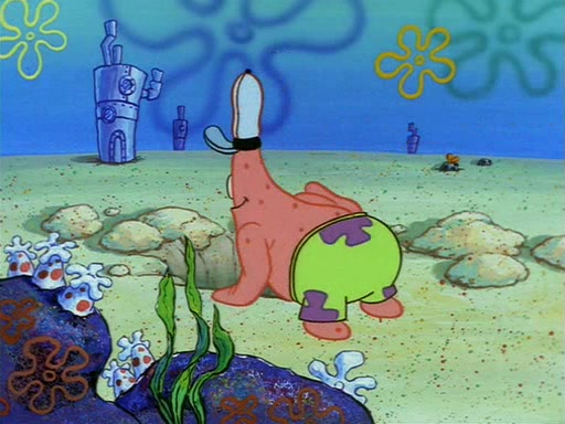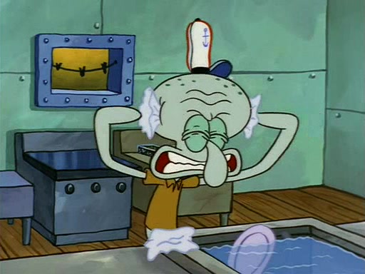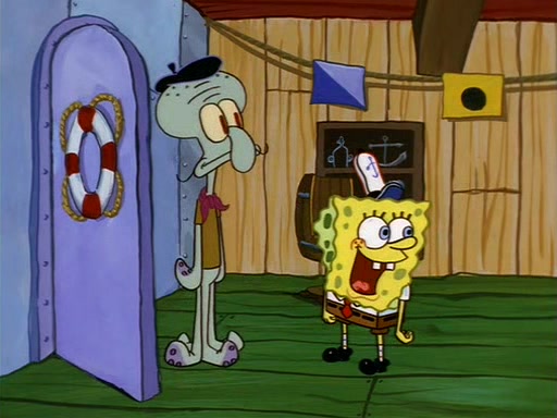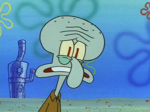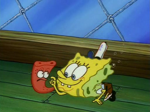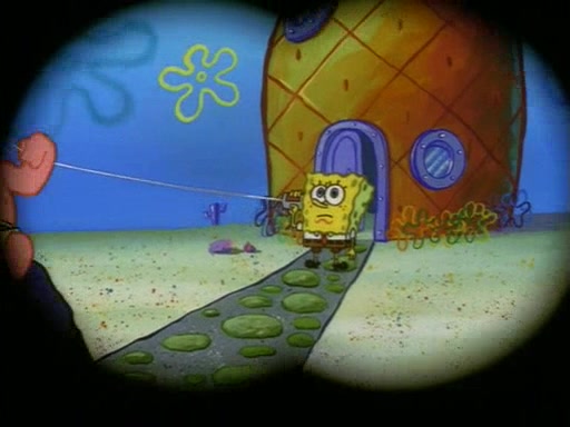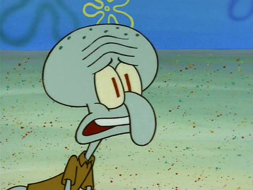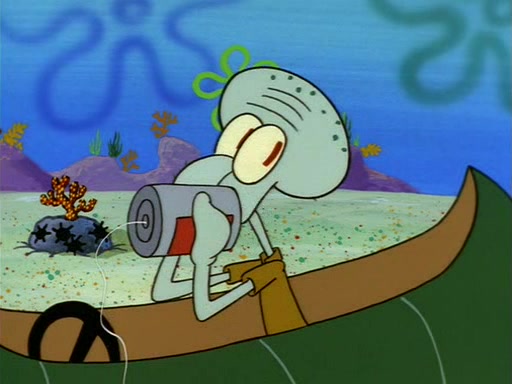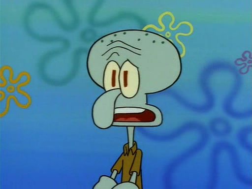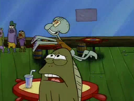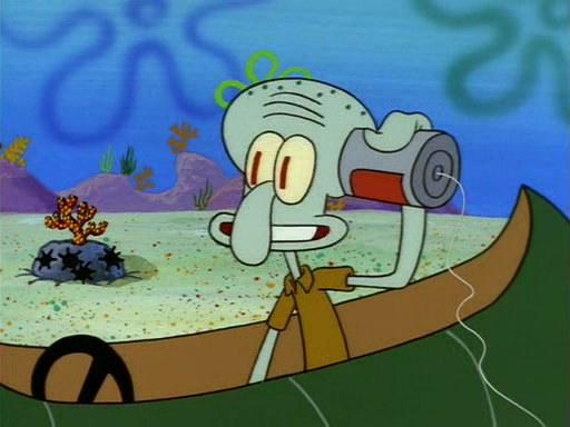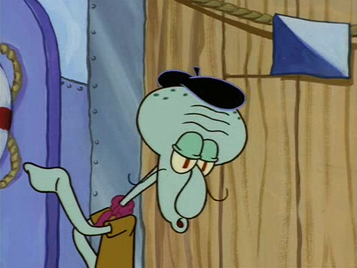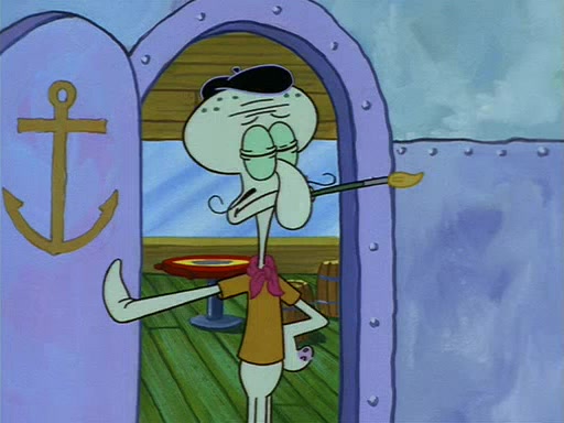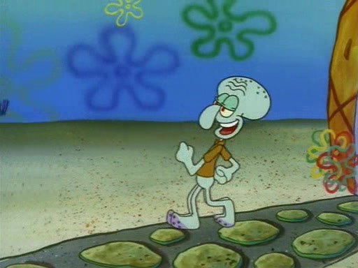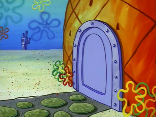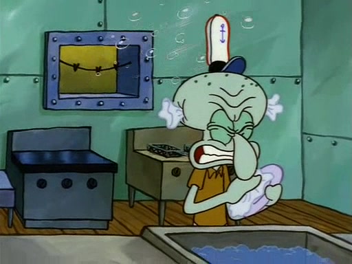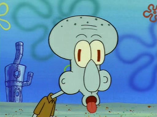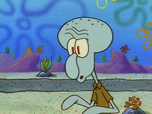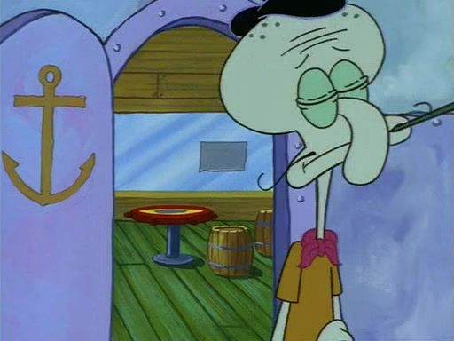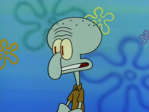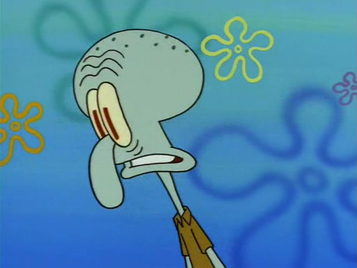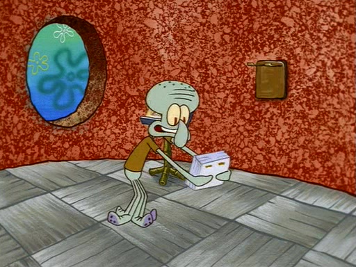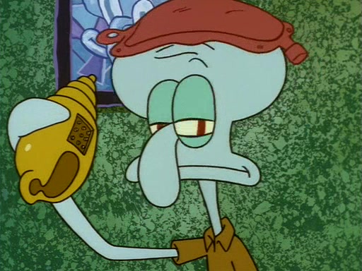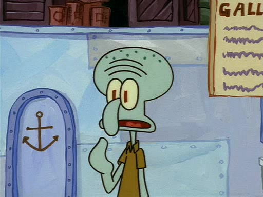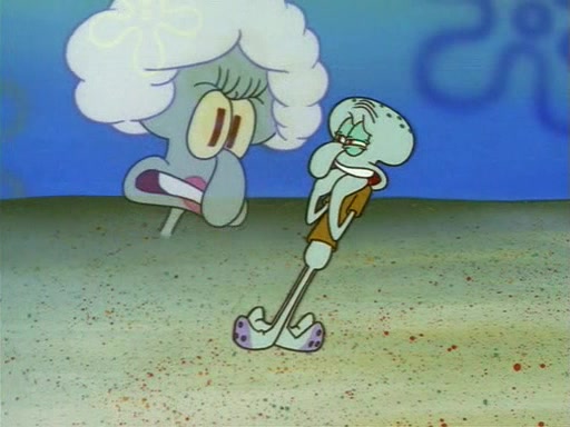 Squidward goes to SpongeBob's house and sees SpongeBob's hat behind a rock. Assuming it's SpongeBob, he goes over to apologize, but then sees that it's just Patrick wearing the hat and digging. Squidward asks where SpongeBob is and Patrick tells Squidward that SpongeBob is in the house "impressed" (instead of depressed) and was crying a lot. Squidward feels even worse and attempts to apologize when SpongeBob answers the door, but since apologizing to others isn't something he normally does, he initially finds himself to be physically incapable of simply saying "I'm sorry" to him.