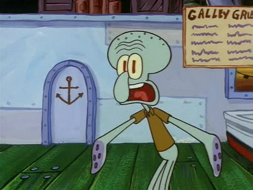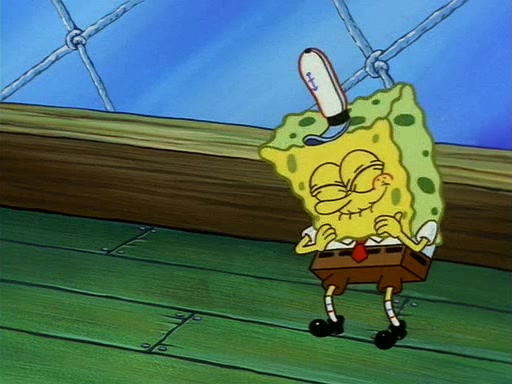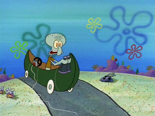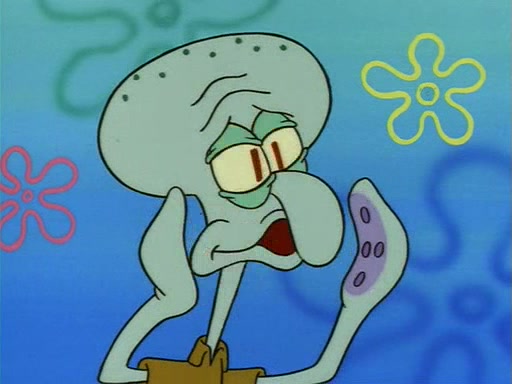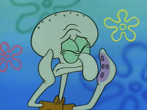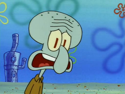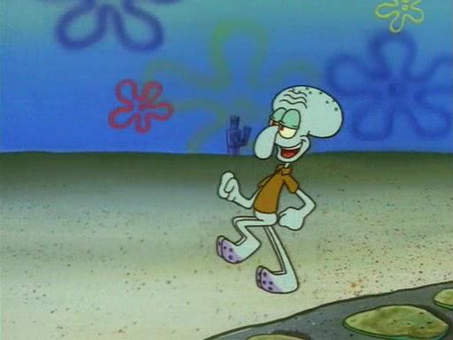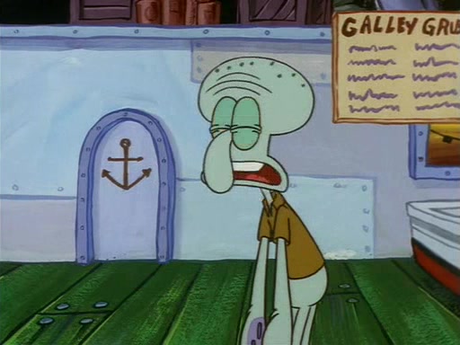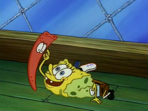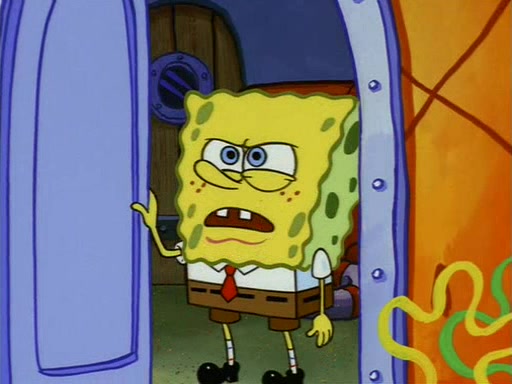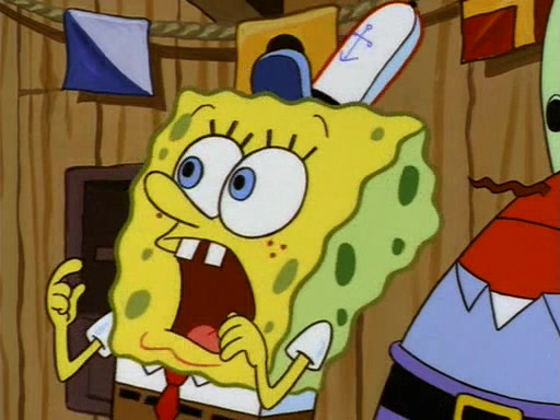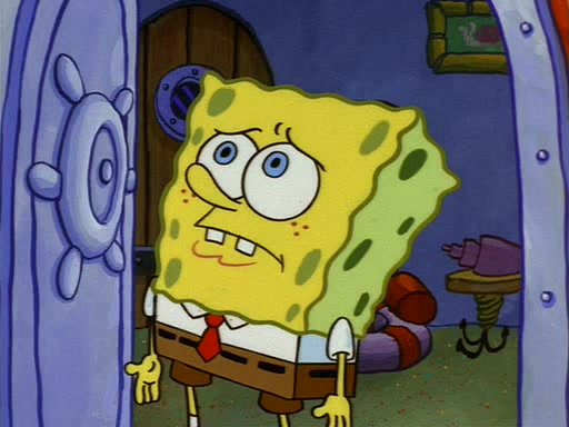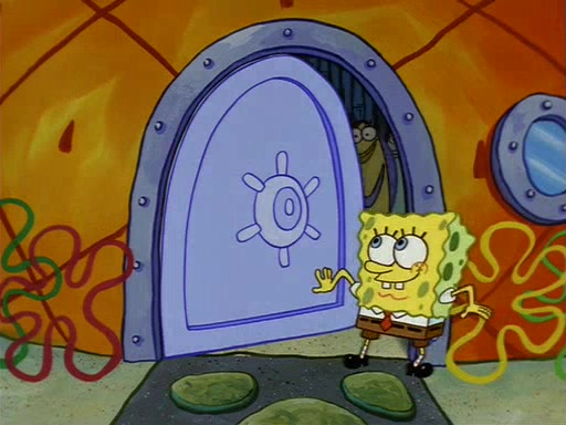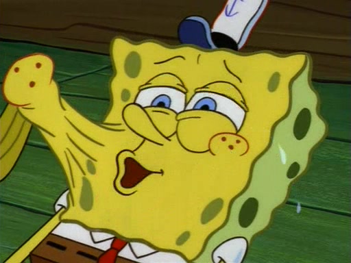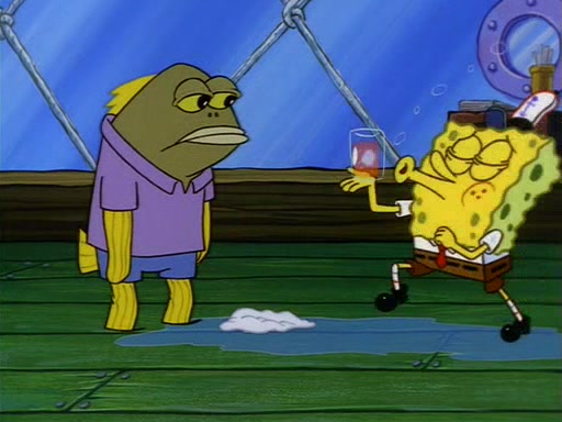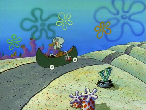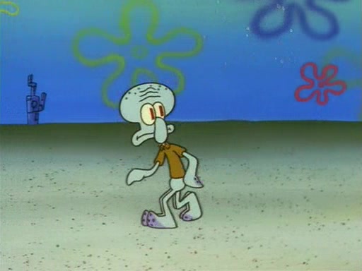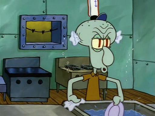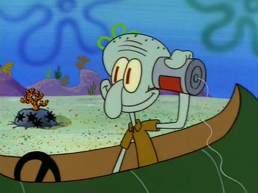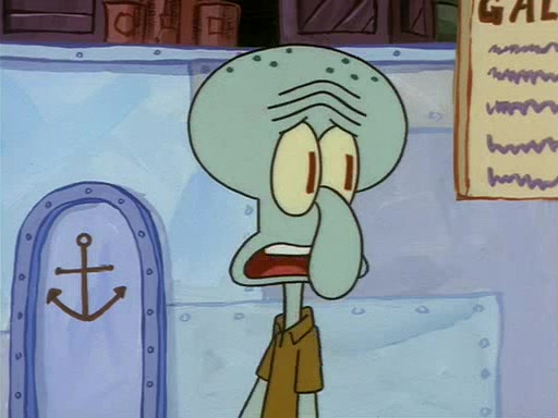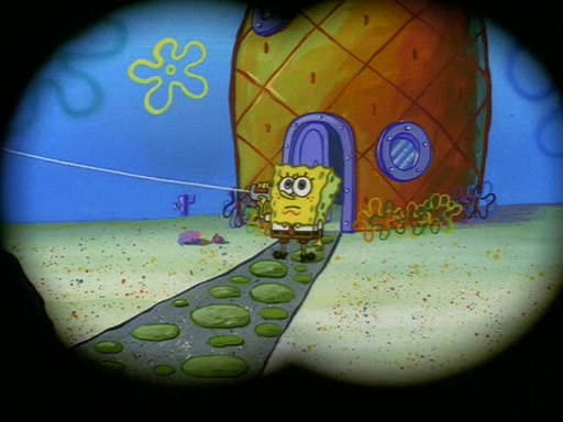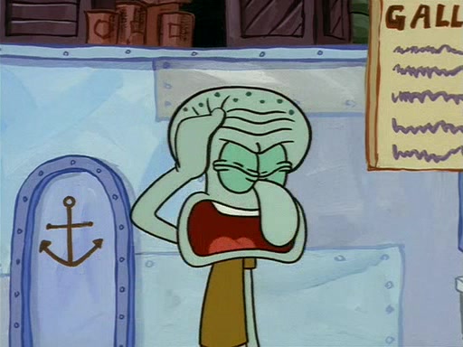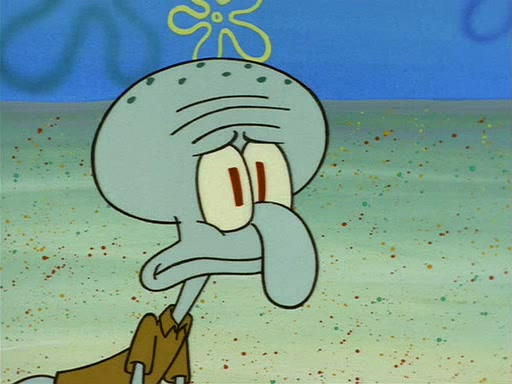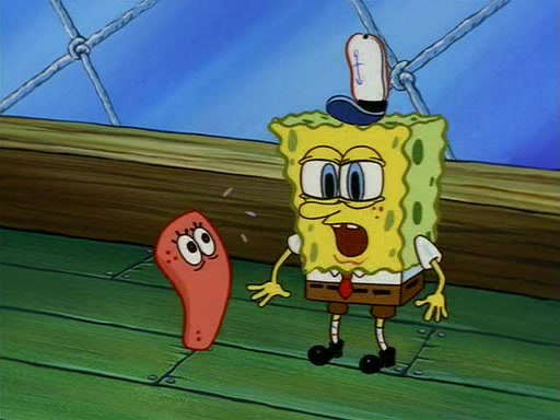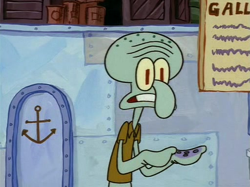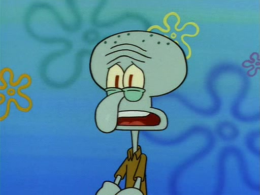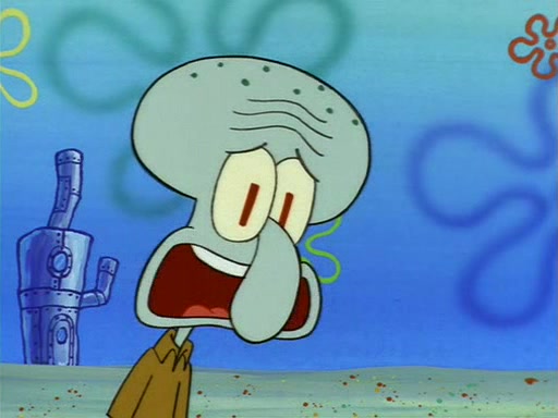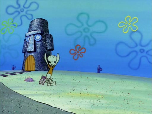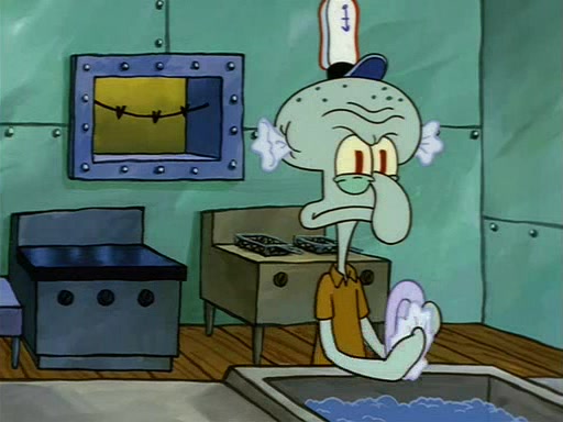 Squidward goes to SpongeBob's house and sees SpongeBob's hat behind a rock. Assuming it's SpongeBob, he goes over to apologize, but then sees that it's just Patrick wearing the hat and digging. Squidward asks where SpongeBob is and Patrick tells Squidward that SpongeBob is in the house "impressed" (instead of depressed) and was crying a lot. Squidward feels even worse and attempts to apologize when SpongeBob answers the door, but since apologizing to others isn't something he normally does, he initially finds himself to be physically incapable of simply saying "I'm sorry" to him.