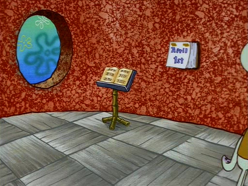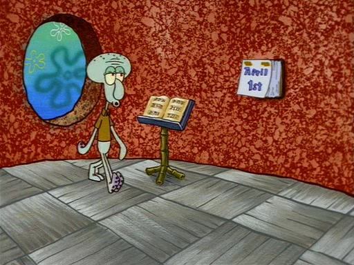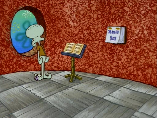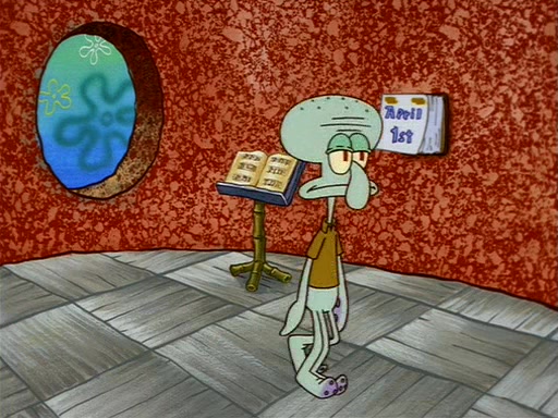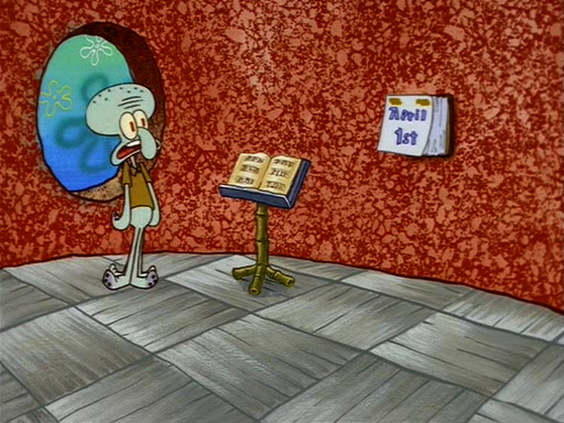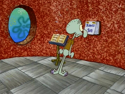 SpongeBob wakes up, and realizes that it's April Fools' Day. He then begins the day pranking Gary by saying they were going to be peasants and that they were going to have to move. He then pranks himself by saying that he was going to drink several glasses of lemonade, then goes to work. Squidward sees him and wonders what SpongeBob is happy about until he looks at the calendar, and realizes that it's April Fools' Day, which he says is SpongeBob's favorite holiday. Fearing the worst has to come (or so he thinks), Squidward calls Mr. Krabs saying he's sick and that he would not be able to make it to work. Mr. Krabs says that there is an art collector in his office who wants to buy Squidward's art and name him artist of the month. Squidward immediately rushes to the Krusty Krab, only to find that it was a silly prank by SpongeBob and Mr. Krabs. Squidward attempts to resign from his job, but SpongeBob persuades him to stay, promising not to pull any further pranks on him.