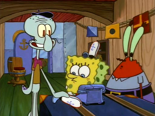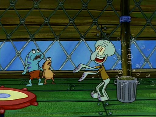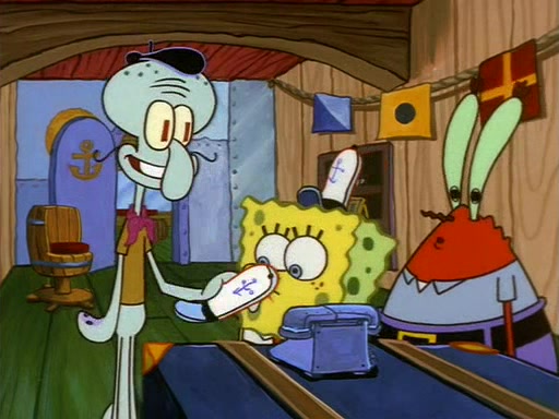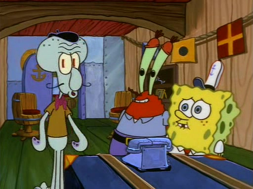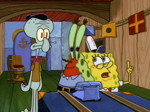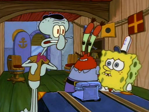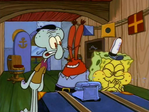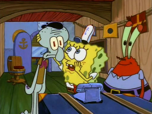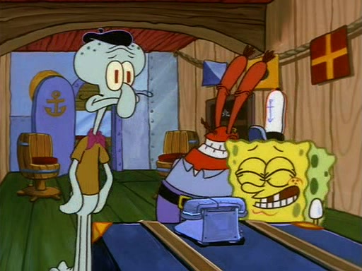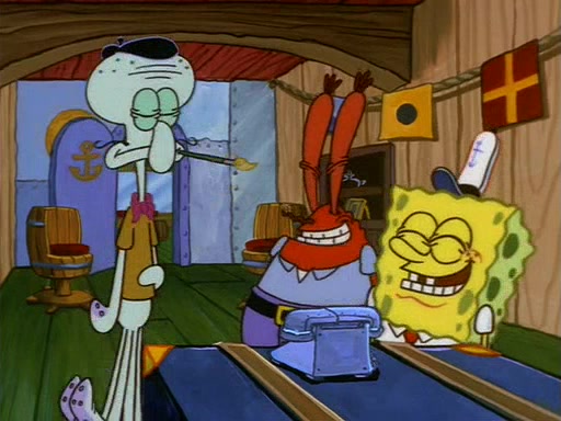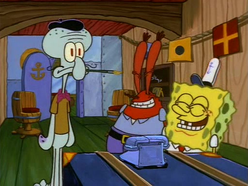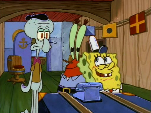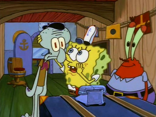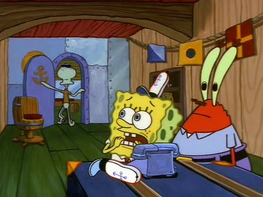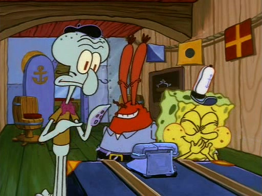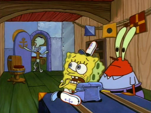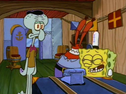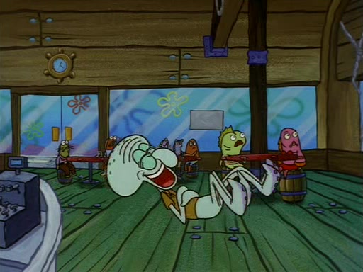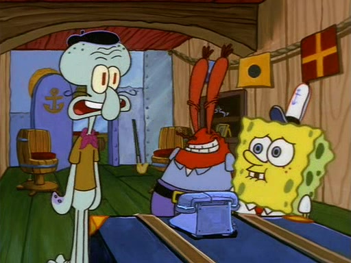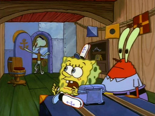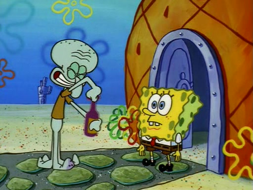 However, SpongeBob continues to prank the customers inside the Krusty Krab while hiding them from Squidward even though Squidward knows he is doing that. The customers seem to take SpongeBob's pranks lightly, because the pranks are considered funny and harmless. Although Squidward does not receive any more pranks as SpongeBob promised, Squidward gets annoyed over the SpongeBob and the customers' laughter. He decides to plot revenge on SpongeBob by showing him what he feels is a "real" prank, and sets a rope trap with a blob of mustard in the middle.
