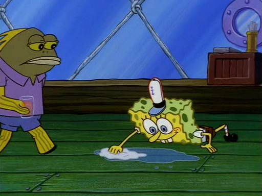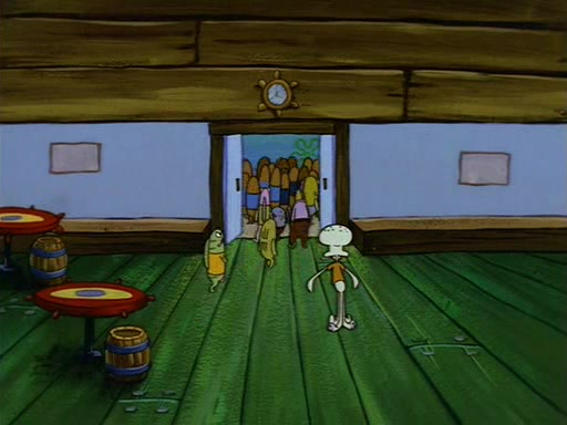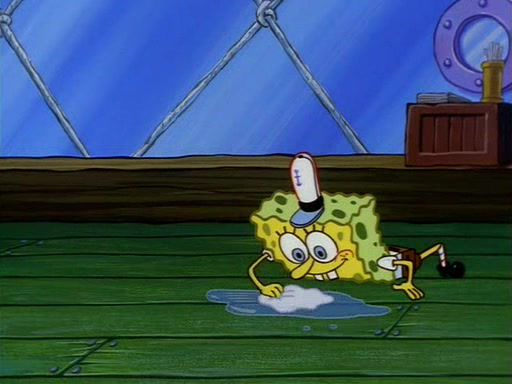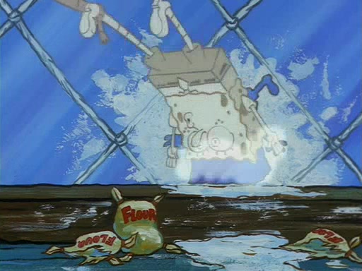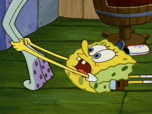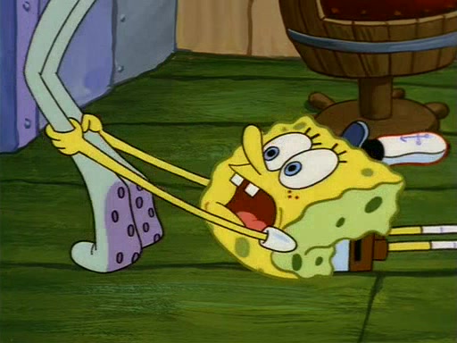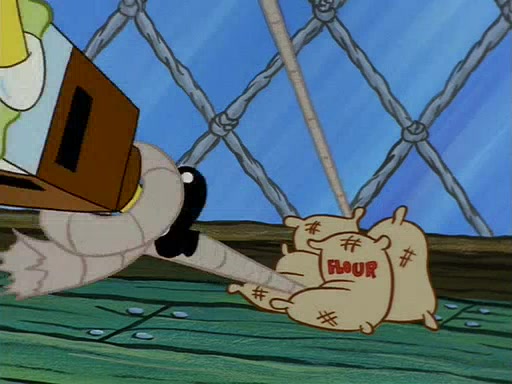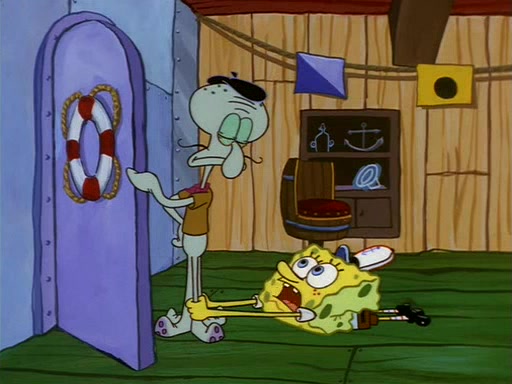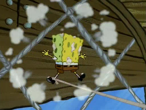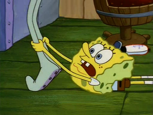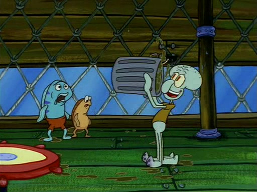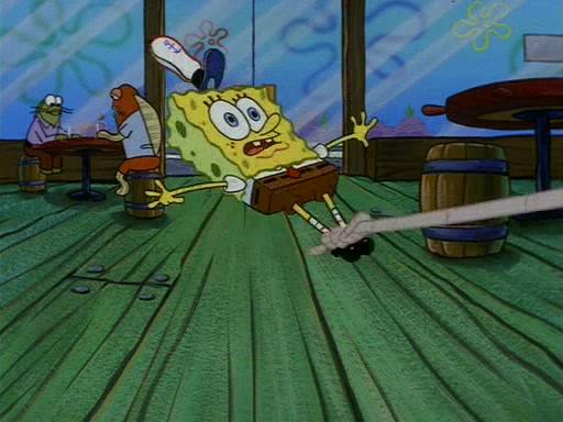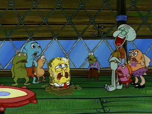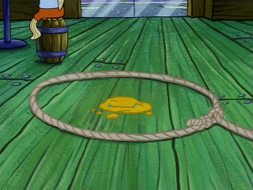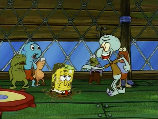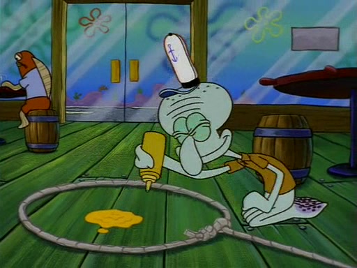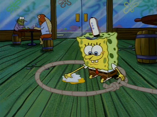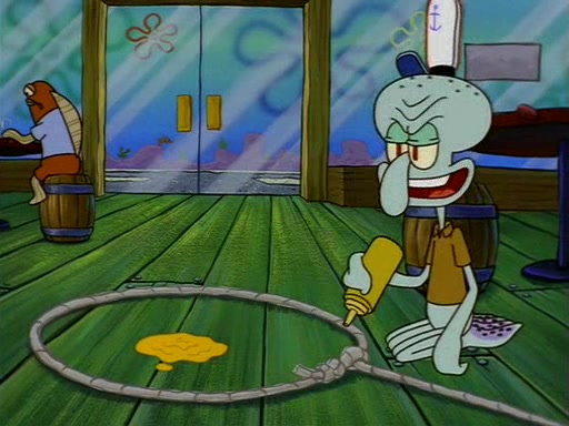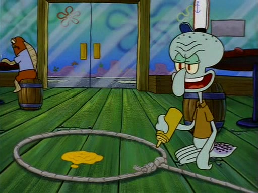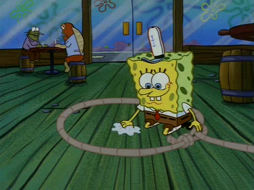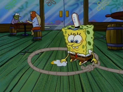 SpongeBob goes to clean it up, and he gets his leg caught in the lasso. Squidward cuts a nearby rope, triggering a chain reaction which sends SpongeBob flying around the restaurant, colliding into several objects and areas, ending with him into landing in a garbage can. Squidward laughs hysterically at him and celebrates his victory, but an emotionally and physically hurt SpongeBob runs out of the restaurant in tears. Bewildered by SpongeBob's reaction, Squidward calls out to him, saying that he was just kidding, even turning to the customers for confirmation.