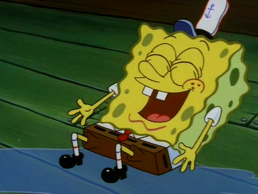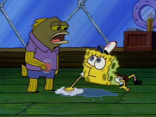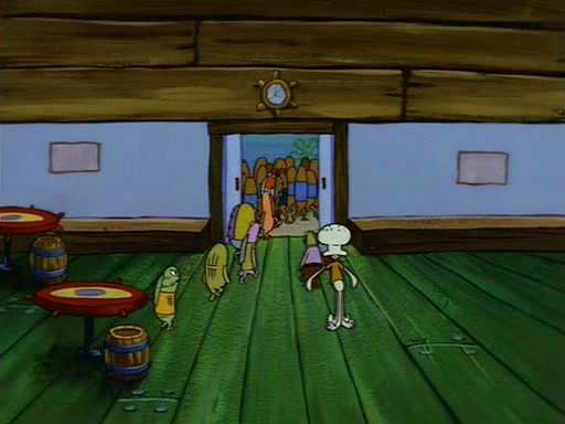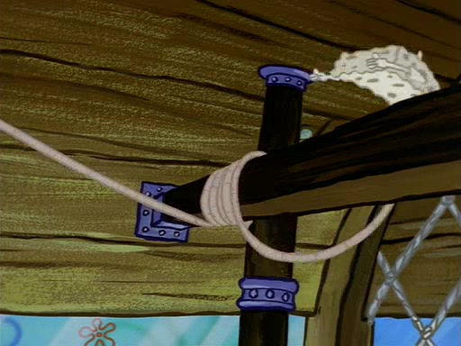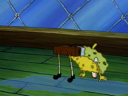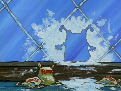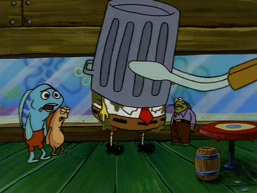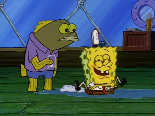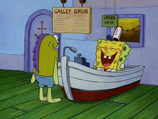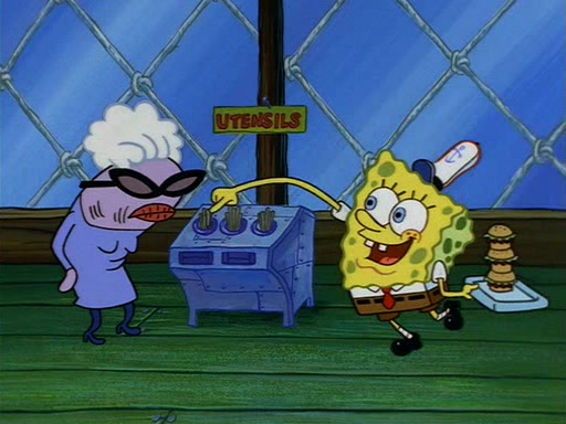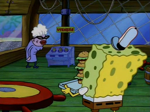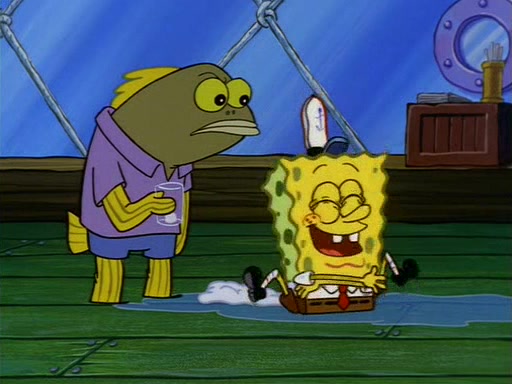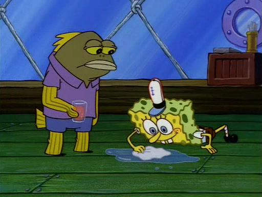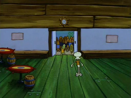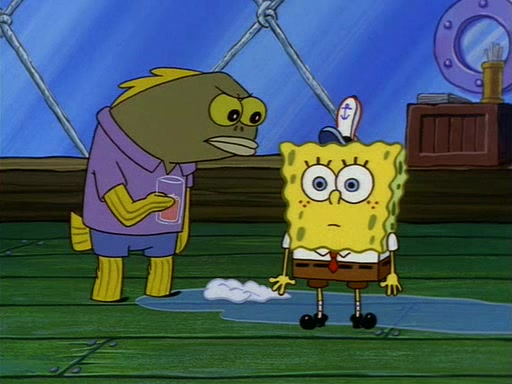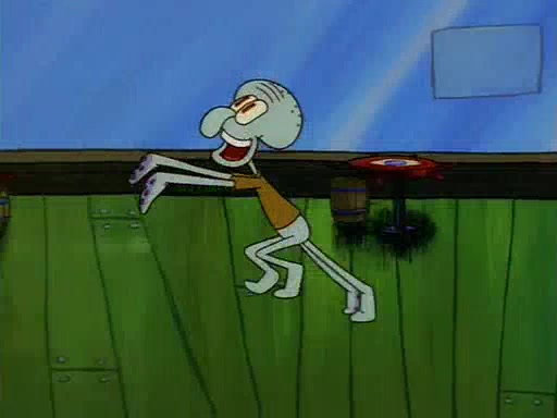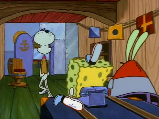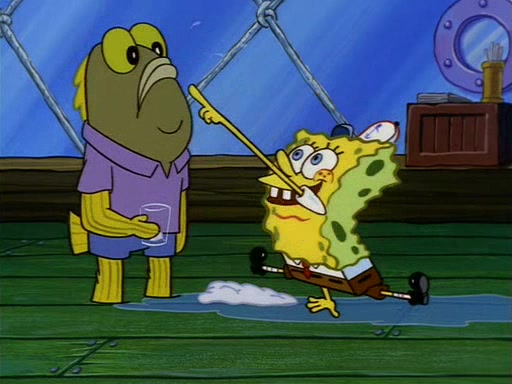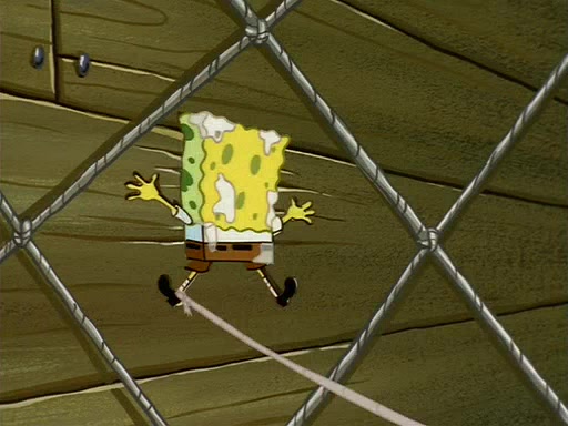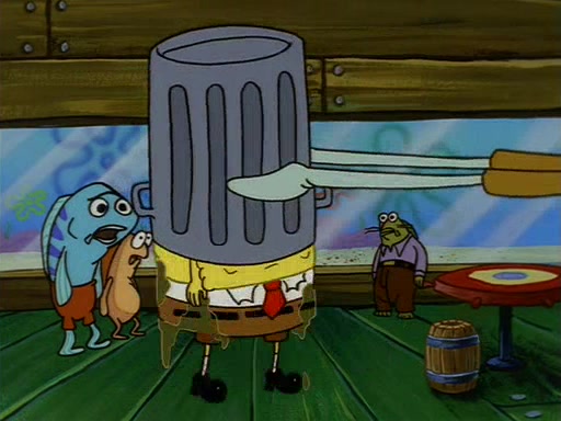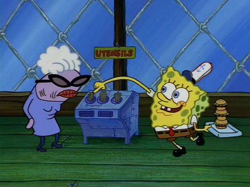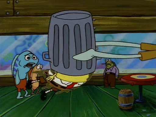 SpongeBob goes to clean it up, and he gets his leg caught in the lasso. Squidward cuts a nearby rope, triggering a chain reaction which sends SpongeBob flying around the restaurant, colliding into several objects and areas, ending with him into landing in a garbage can. Squidward laughs hysterically at him and celebrates his victory, but an emotionally and physically hurt SpongeBob runs out of the restaurant in tears. Bewildered by SpongeBob's reaction, Squidward calls out to him, saying that he was just kidding, even turning to the customers for confirmation.