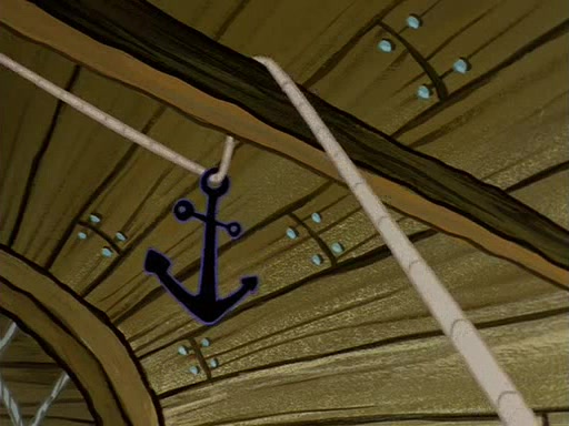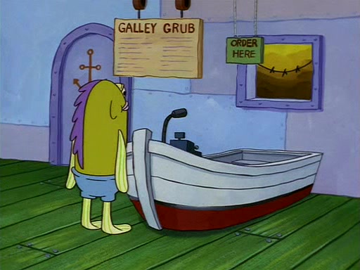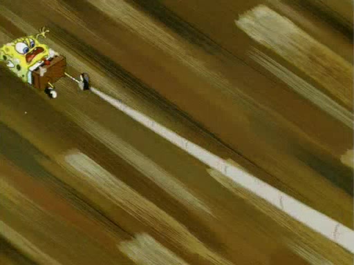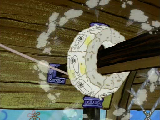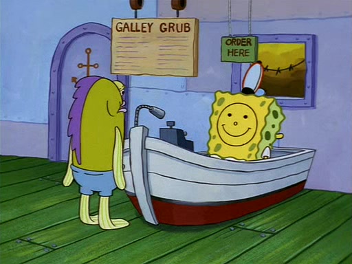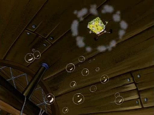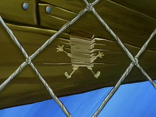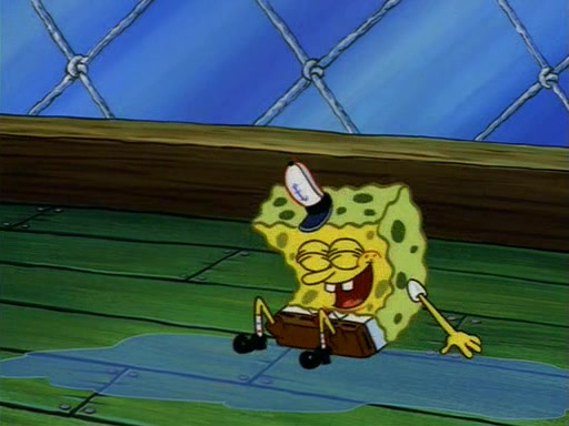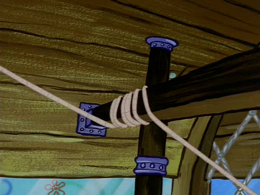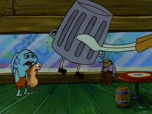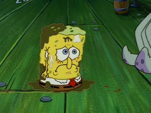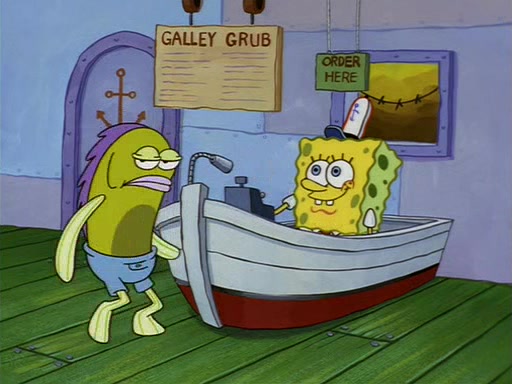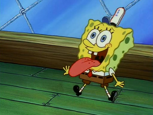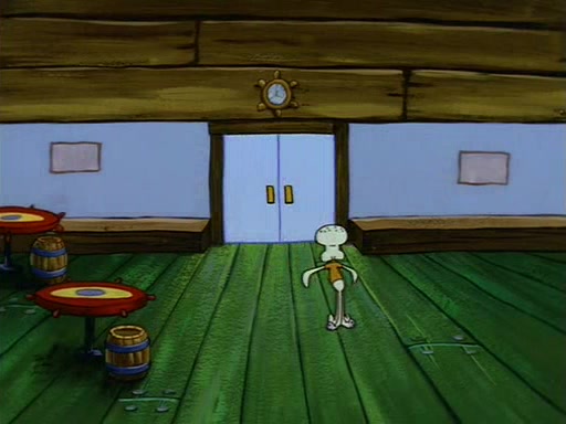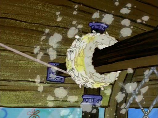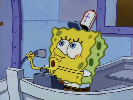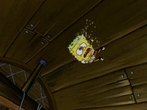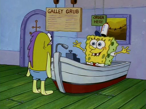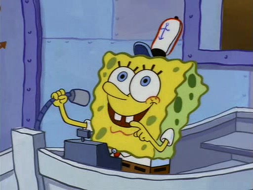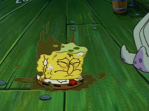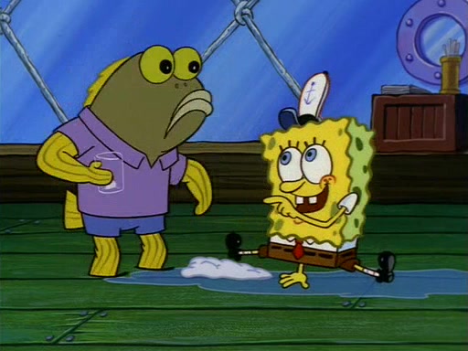 SpongeBob goes to clean it up, and he gets his leg caught in the lasso. Squidward cuts a nearby rope, triggering a chain reaction which sends SpongeBob flying around the restaurant, colliding into several objects and areas, ending with him into landing in a garbage can. Squidward laughs hysterically at him and celebrates his victory, but an emotionally and physically hurt SpongeBob runs out of the restaurant in tears. Bewildered by SpongeBob's reaction, Squidward calls out to him, saying that he was just kidding, even turning to the customers for confirmation.
