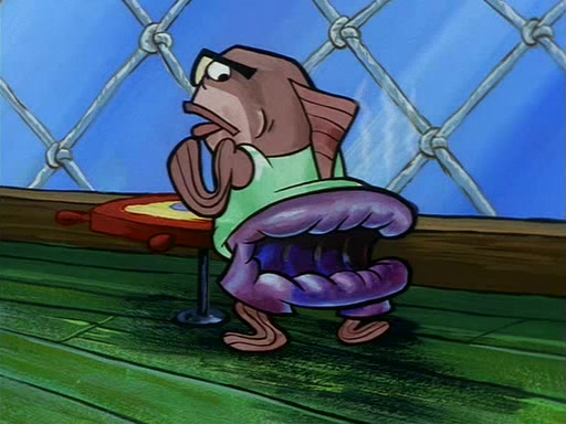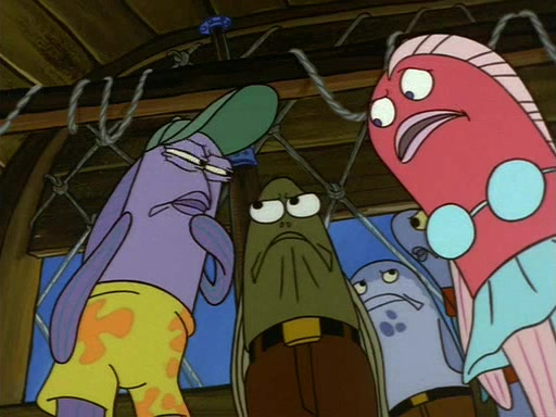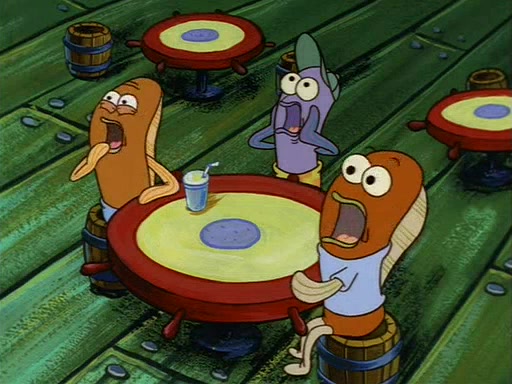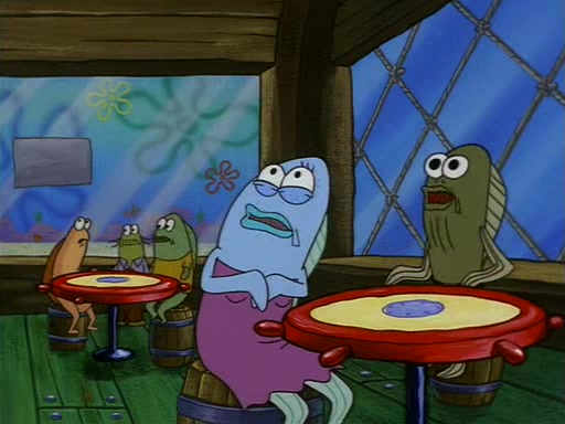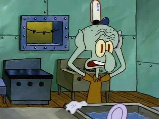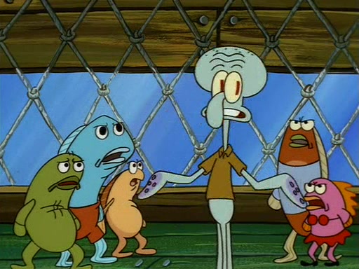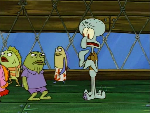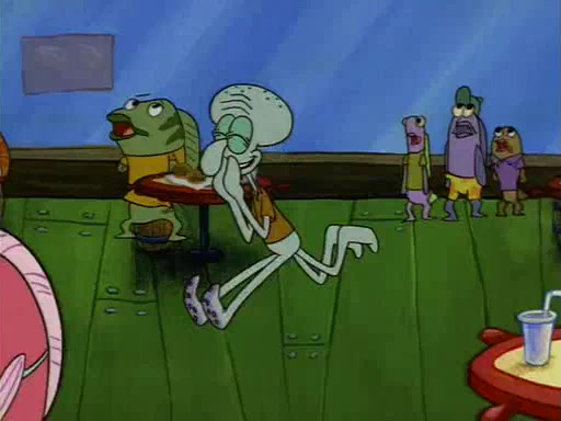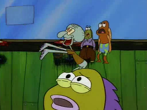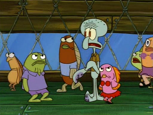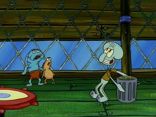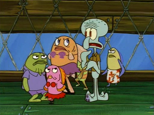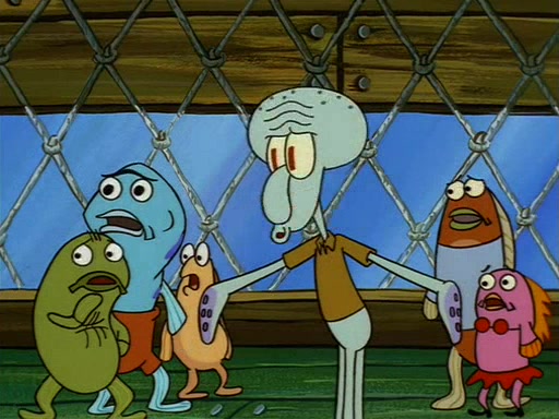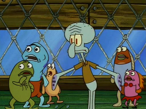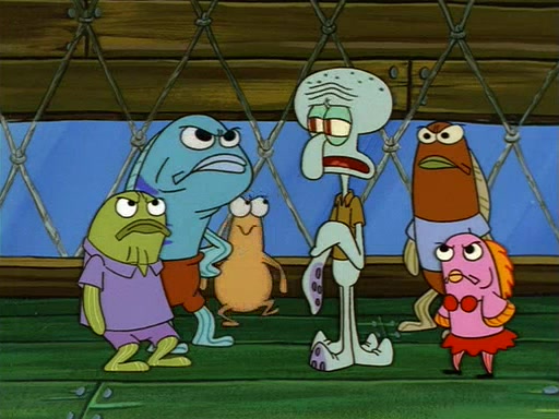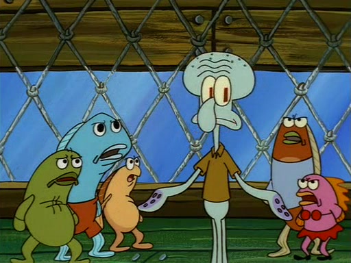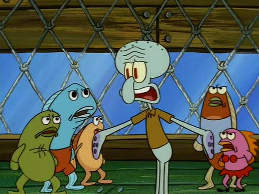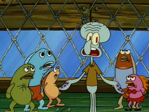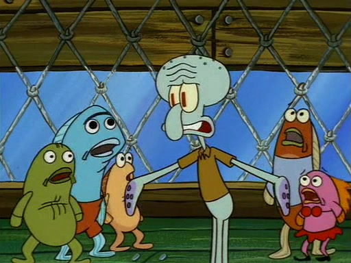 But the customers too are appalled by Squidward's prank, declaring that it was far too harsh to be considered "funny." They all leave the restaurant in disgust, with one of them angrily saying to him "April Fools, jerk" and another one yelling, "YOU STINK!" Squidward insists that it was only a joke, but as he looks around at the damage to the restaurant that his prank caused, and conversely realizes how SpongeBob was hurt during each part, it slowly dawns on him that SpongeBob's pranks were actually funny and meant to make people laugh, while his prank was cruel and meant to hurt and humiliate SpongeBob. Overcome with guilt, and realizing that they were right in that the prank was too harsh, he realizes that he has to apologize to SpongeBob for what he did.
