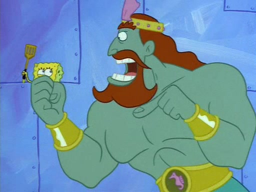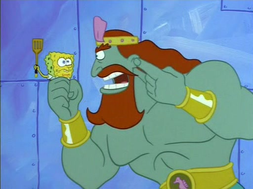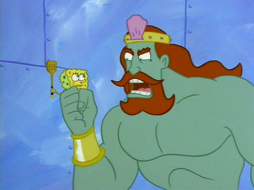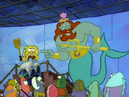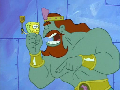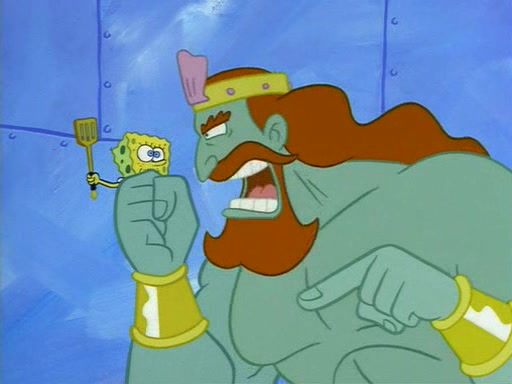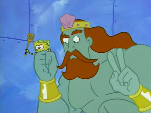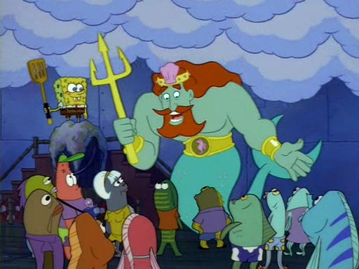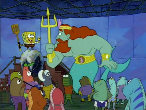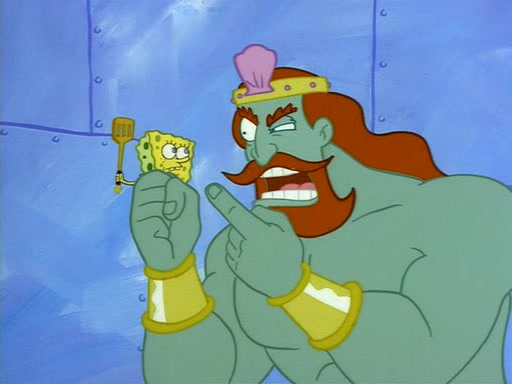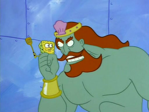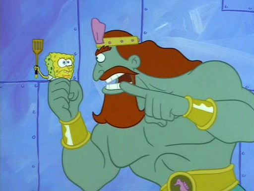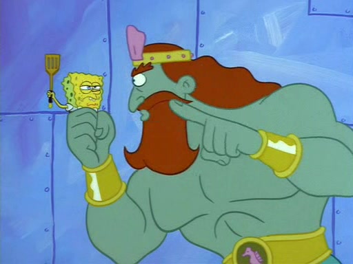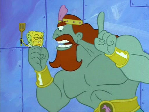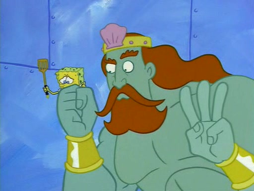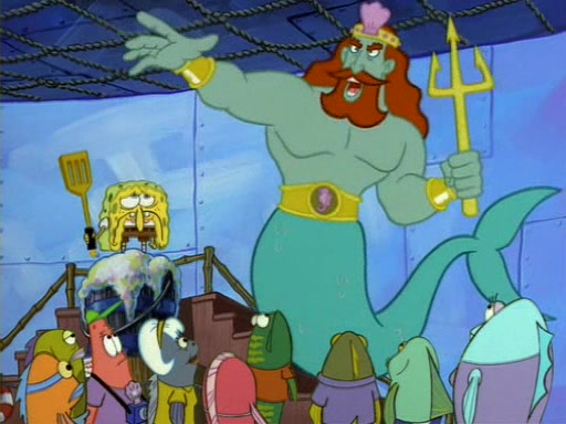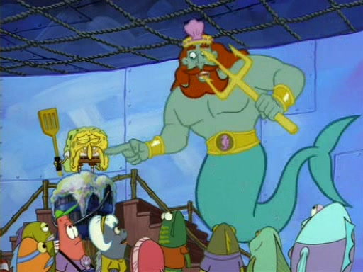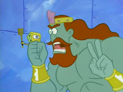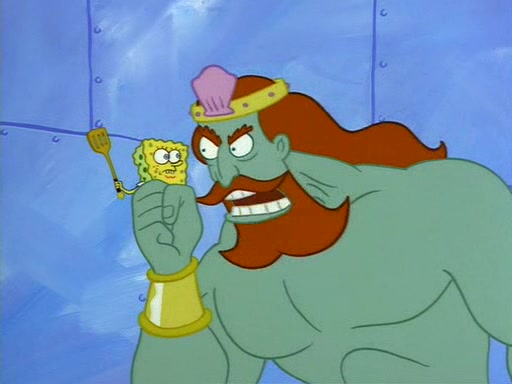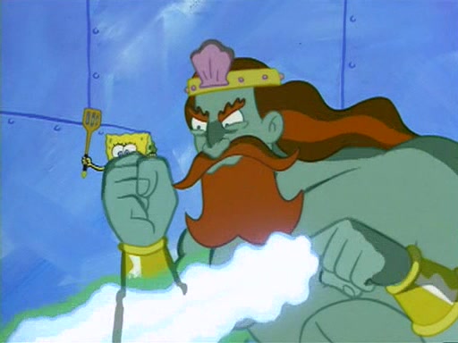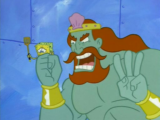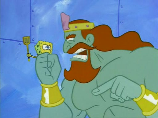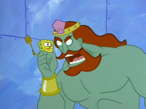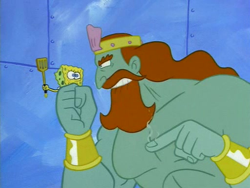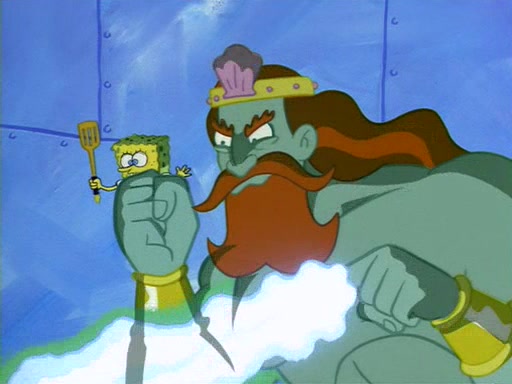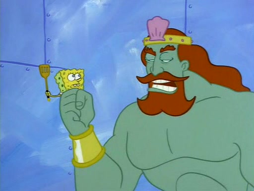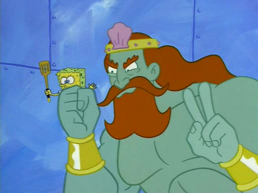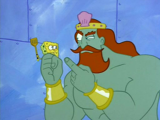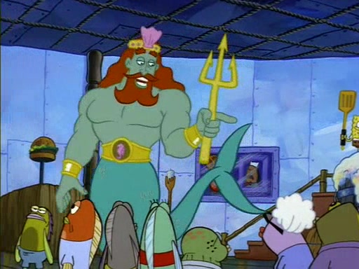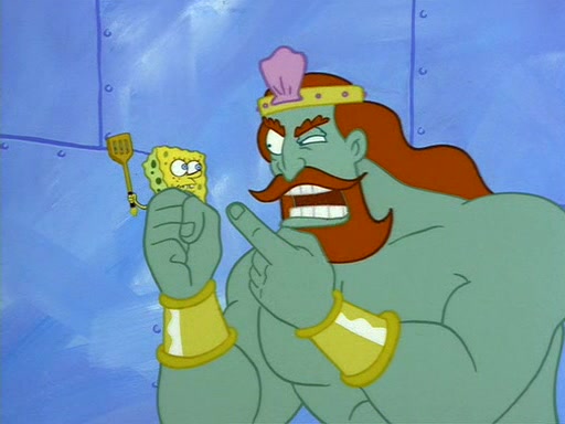 SpongeBob and Patrick are visiting the Fry Cook Museum, where they see a greasy griddle with a golden spatula embedded in the grease. On it is a plaque, which says "Many have tried to pull this spatula out of this ancient grease, but all have failed. Larry the Lobster then attempted to pull it out but failed, SpongeBob then read, only a fry cook who's worthy of King Neptune himself can wield the golden spatula." SpongeBob, while posing for a photo, accidentally and effortlessly pulls it out, and King Neptune appears. He asks who pulled out the spatula, and everyone says SpongeBob. King Neptune refuses to believe this, and asks for proof. Patrick shows him the photograph he took, but Neptune still refuses to allow such a lowly being as SpongeBob to become the royal fry cook. He challenges SpongeBob to a patty-making competition. If SpongeBob wins, he will stay at Atlantis forever and become a god. If he loses, he has to give up fry-cooking forever. Patrick continually jeers to Neptune about SpongeBob's skills, and says that he could complete up to 500 challenges. He is repeatedly zapped by Neptune 3 times, until all that is left of him is a burnt mark on the floor. SpongeBob asks Neptune to revive Patrick, which he does (but with Patrick's face now on his butt). Neptune tried to show SpongeBob the Poseidome, but it shows Tom Kenny showering. In the Poseidome, King Neptune makes 1000 burgers, in the time it takes SpongeBob to make just one, winning the challenge. However, when Neptune shares his patties with the audience, they find that they taste awful. Neptune is angered by this, and asks why they would think that SpongeBob's would be any better. He tastes SpongeBob's patty, and finds it to be delicious. Neptune releases the Krabby Patty back to his stomach and re-eats it again and the audience is disgusted. SpongeBob is declared the winner, but when he finds out that his friends cannot come with him to Atlantis, he refuses to go, and instead arranges for King Neptune to be a trainee under SpongeBob at the Krusty Krab, teaching him that perfect Krabby Patties are made from love, not magic.