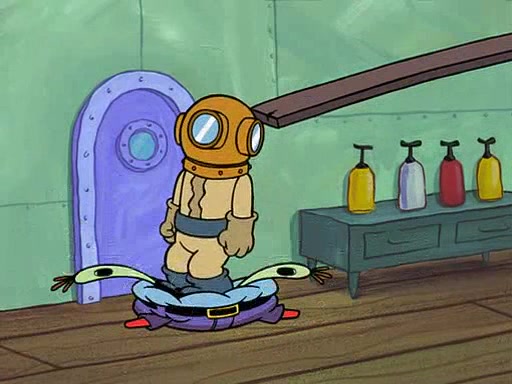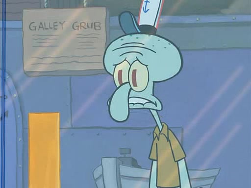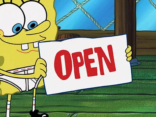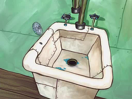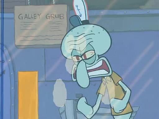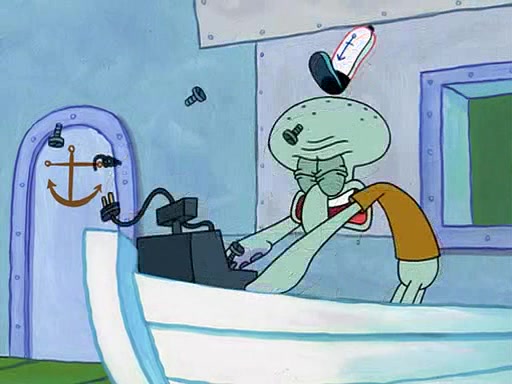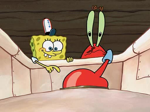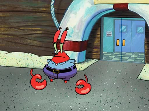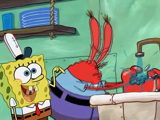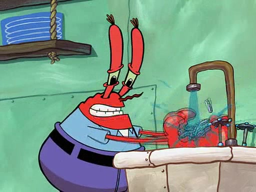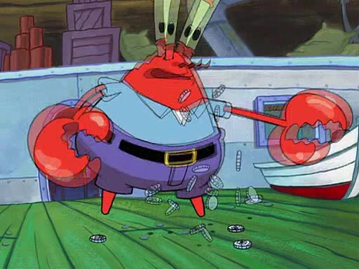 Squidward is waiting for the Krusty Krab to close even though the day hasn't even started. SpongeBob keeps ringing the bell and it's starting to annoy Squidward. Squidward tells SpongeBob that he'll ring the bell when there's an order, but says there won't be an order because there aren't any customers. Then he knocks over the cash register and all of the money spills out. Mr. Krabs hears the sound of money, and then comes storming out of his office. Squidward attempts to pick the coins up, but Mr. Krabs shoves him out of the way. Mr. Krabs then picks all the coins up and starts rinsing them under the tap. When SpongeBob surprises him, he drops a dime down the drain. Mr. Krabs sticks his claw in the pipe to catch the dime and he grabs hold of it, but his hand is stuck. He won't let go so he has SpongeBob pull on his backside. They pull too hard and Mr. Krabs loses his arms and smacks on the wall, causing all of the items on a shelf to fall onto his head.
