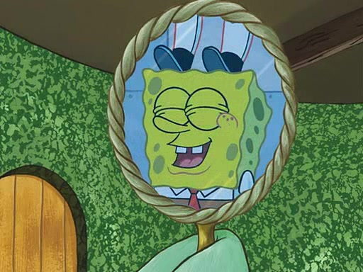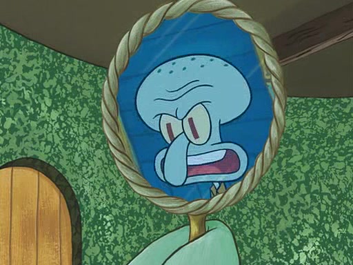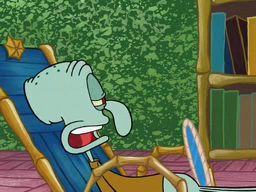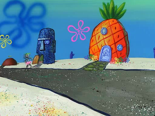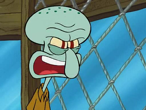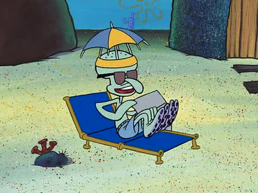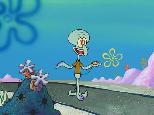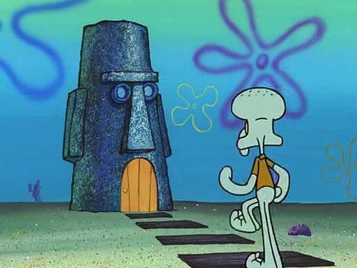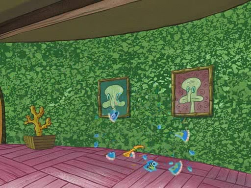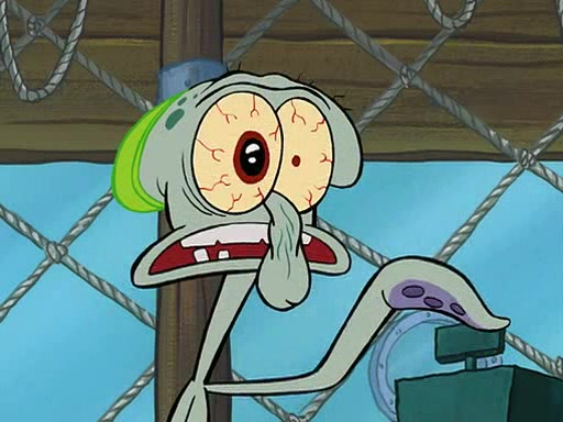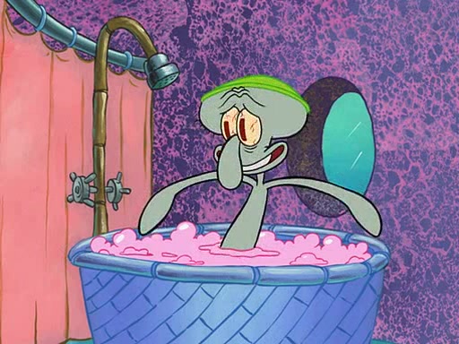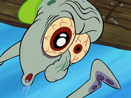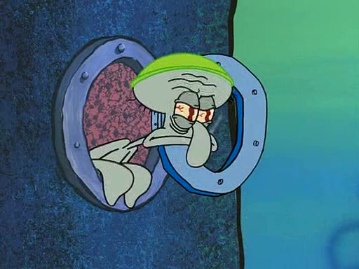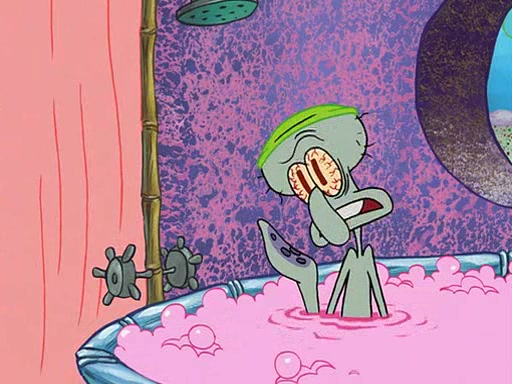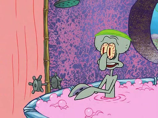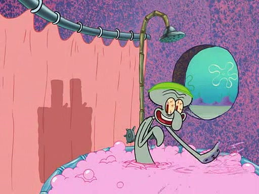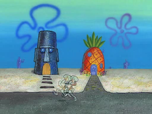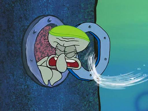 Squidward goes back home and tries to relax again. Then he envisions SpongeBob setting the Krusty Krab on fire, so he rushes to the Krusty Krab and it's fine. Squidward then goes back home saying he won't go back to the Krusty Krab again. He then appears rushing back and forth from his house to the Krusty Krab. He finally goes back home and barricades and locks his door so he can't get out. That's when he finally cracks. While trying to have a bath, Squidward thinks he hears SpongeBob but it's just a branch scratching against his house, outside. He thinks that he sees SpongeBob outside of the shower curtain but it's just his toilet. Then he sees SpongeBob in the bath and escaping down the drain. Squidward bursts out of the house naked, and when he finally arrives at the Krusty Krab, SpongeBob's already there. He never left! SpongeBob gives Squidward his pants because he's naked, then tells Squidward that they never switched the closed sign to open and they "could have taken the whole day off!" He laughs and Squidward's nose falls off and his head deflates, ending the episode.
