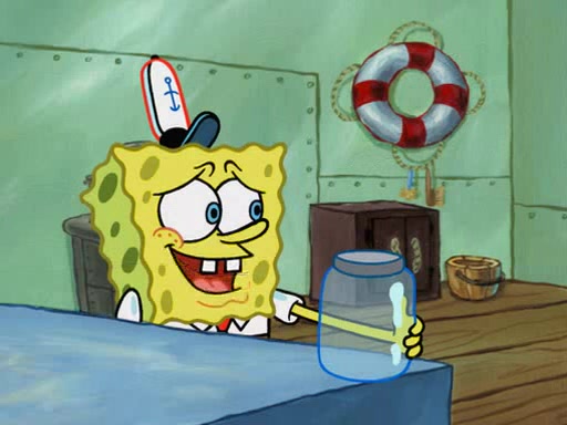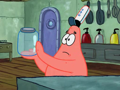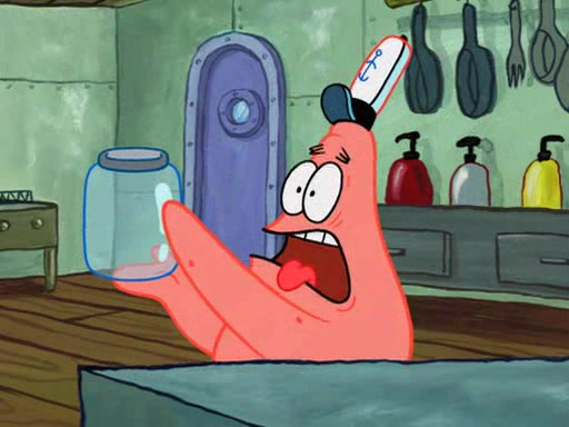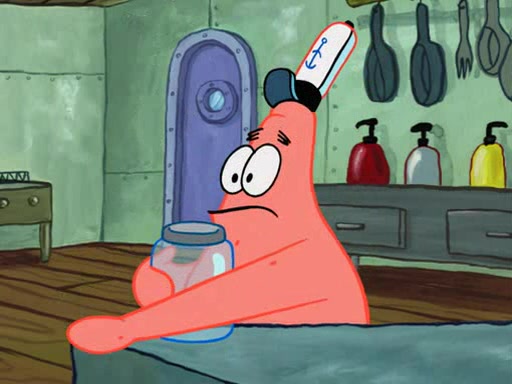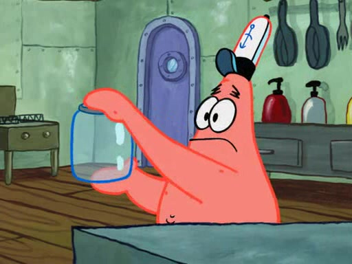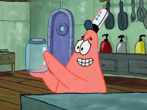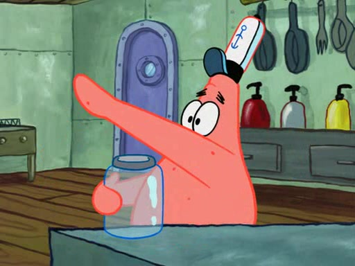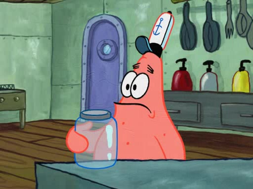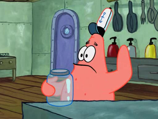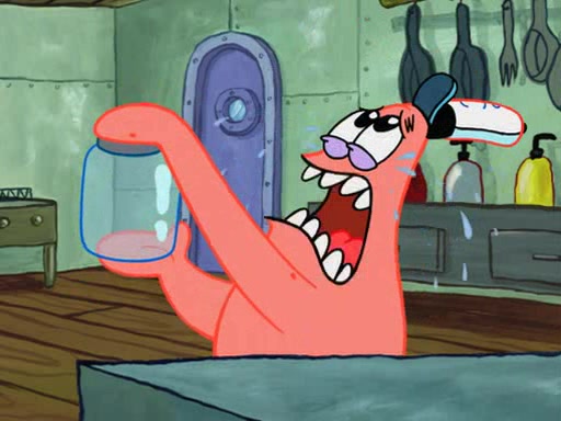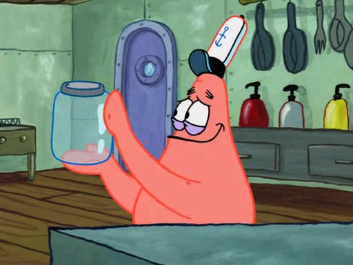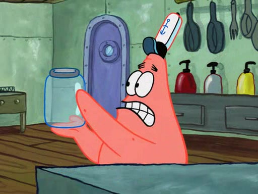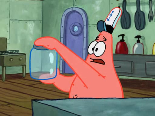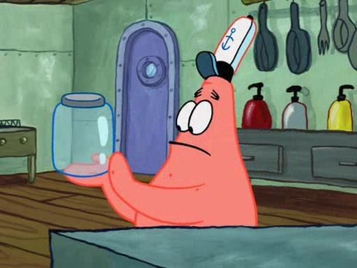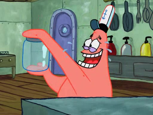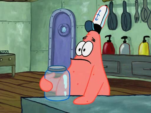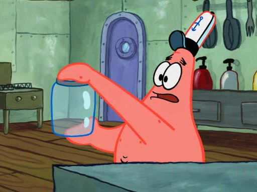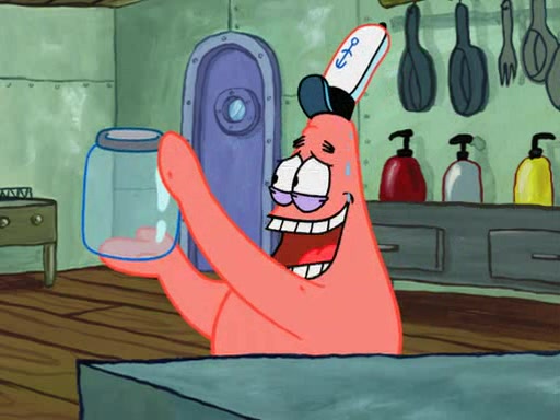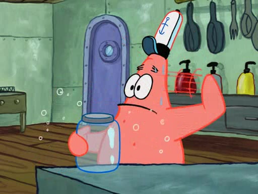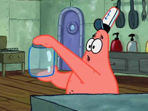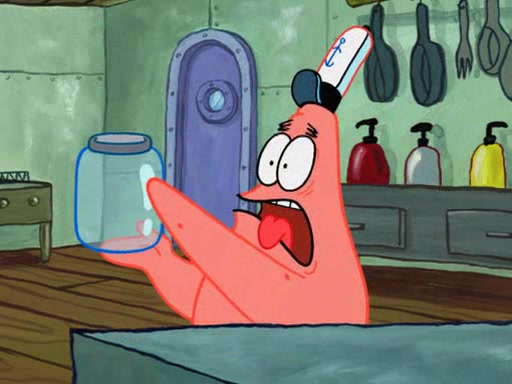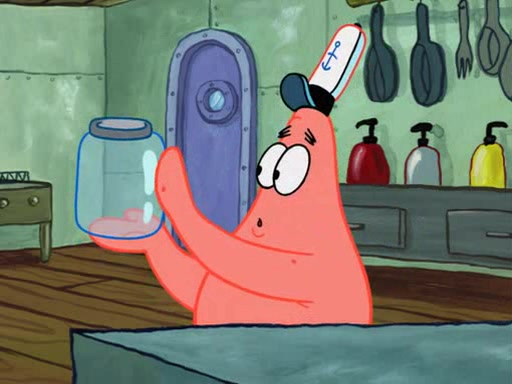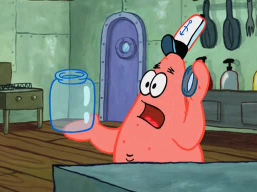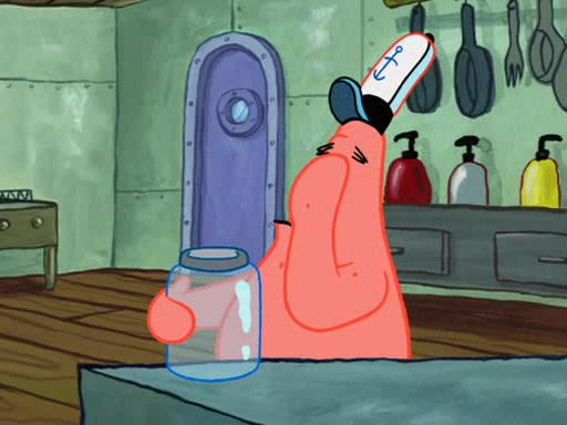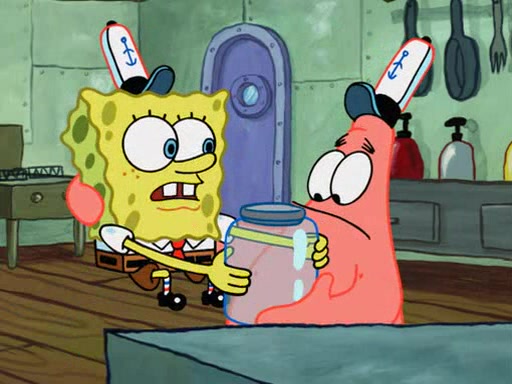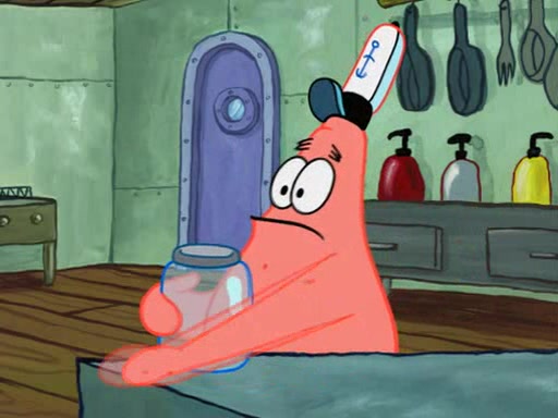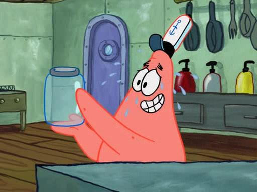 SpongeBob presents him with the extremely basic task of opening a jar. But Patrick keeps taking out the wrong thing, putting the jar in his mouth, and placing his hand wrong. SpongeBob tells him to do it exactly as he does, which gives Patrick an idea. He opens the jar, then bursts into tears, thinking that he broke it. SpongeBob shouts out that Patrick succeeded in opening the jar, and he and SpongeBob begin celebrating.