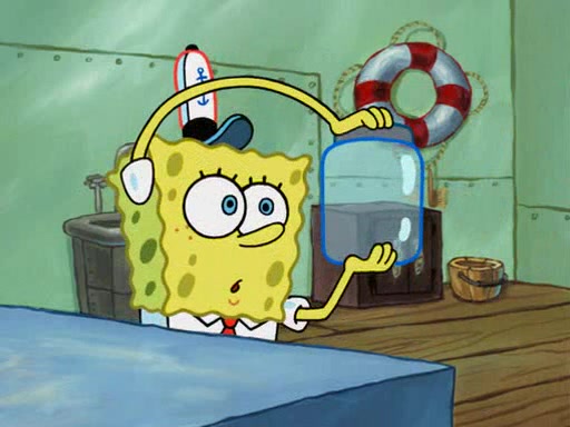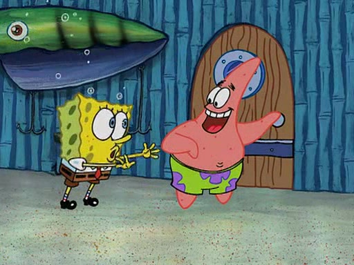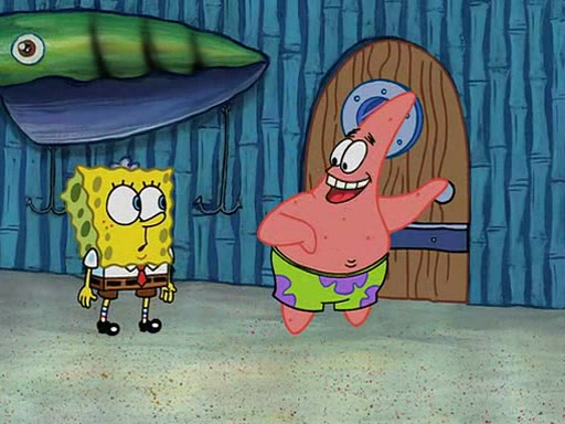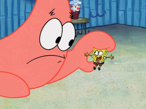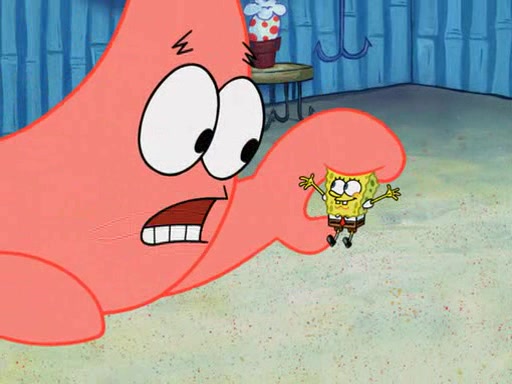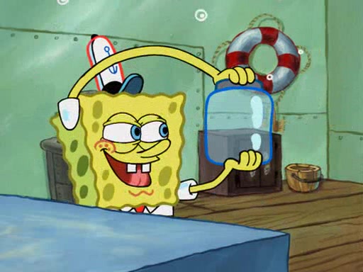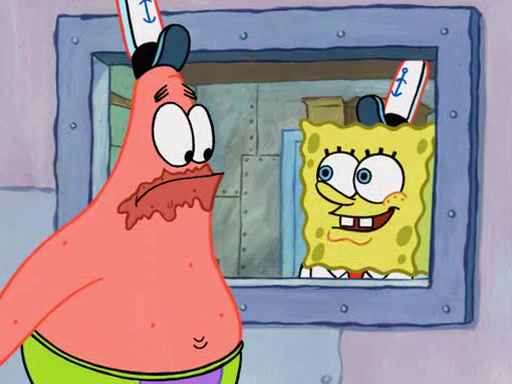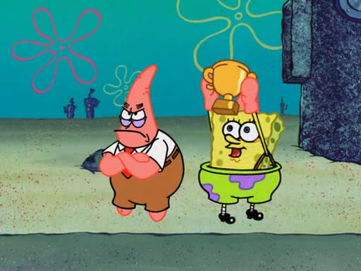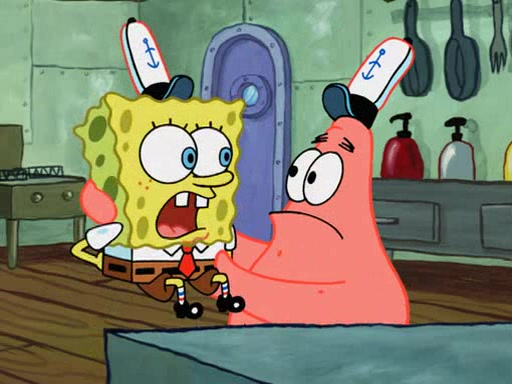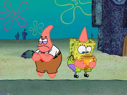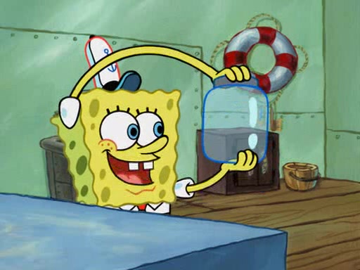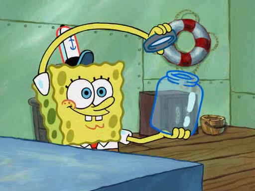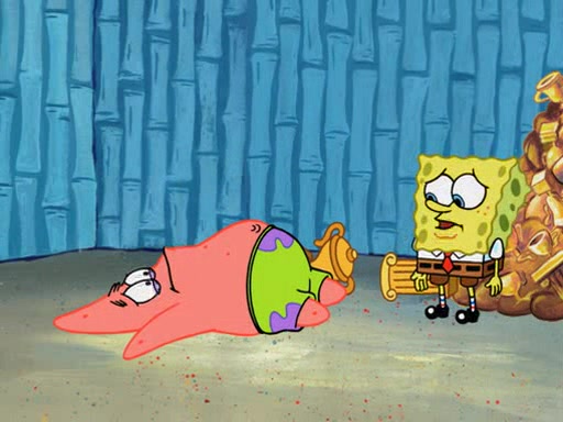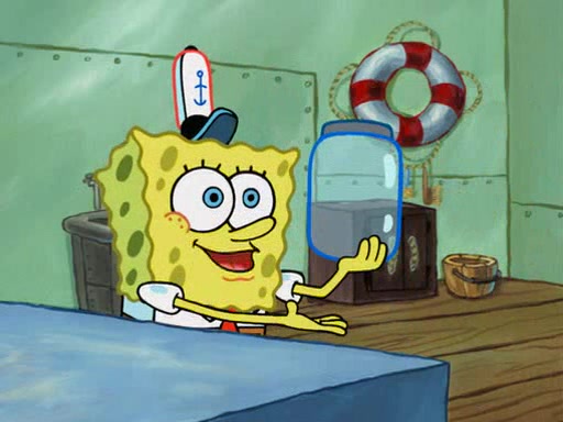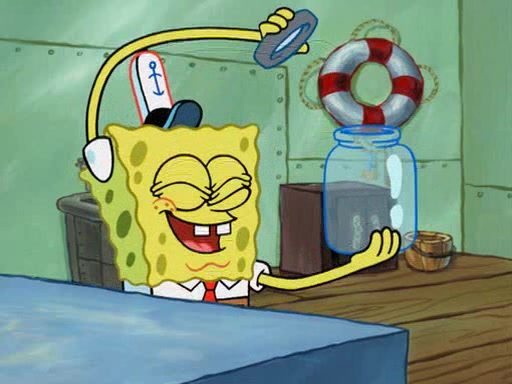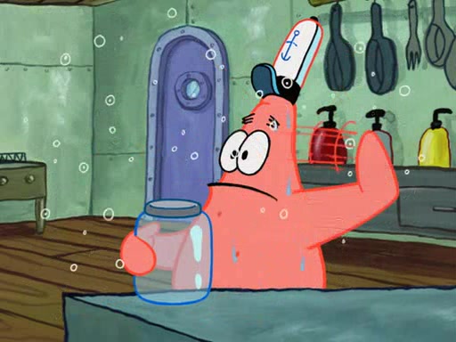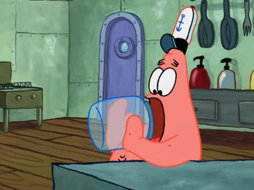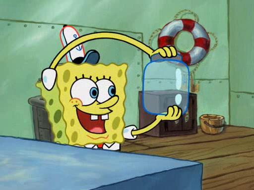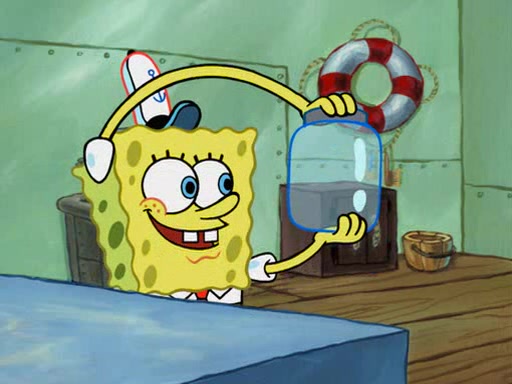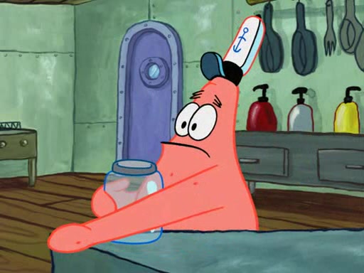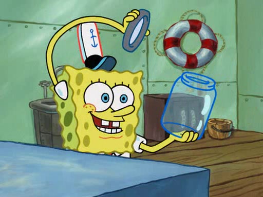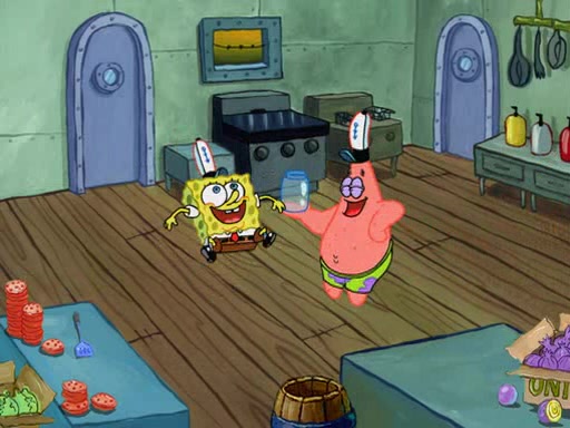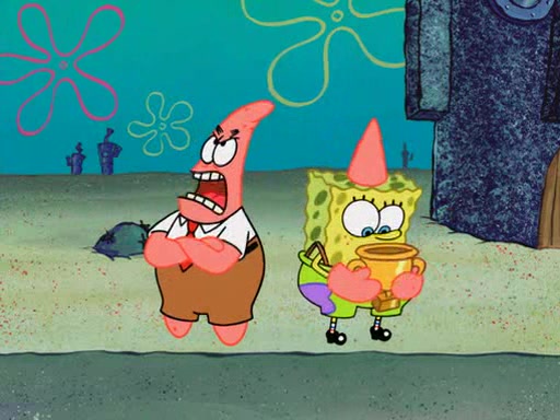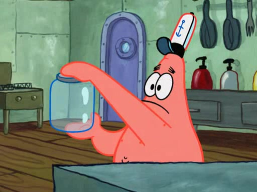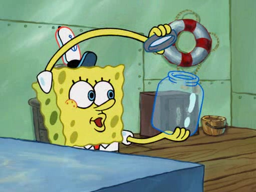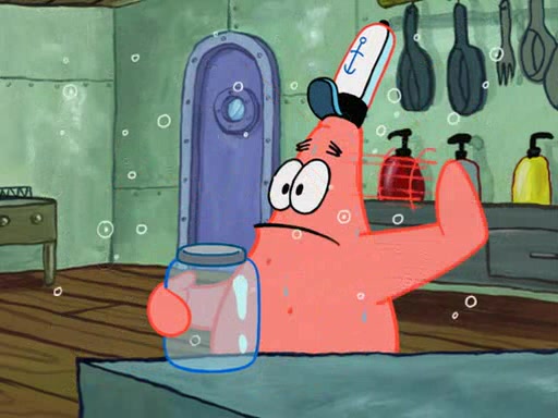 SpongeBob presents him with the extremely basic task of opening a jar. But Patrick keeps taking out the wrong thing, putting the jar in his mouth, and placing his hand wrong. SpongeBob tells him to do it exactly as he does, which gives Patrick an idea. He opens the jar, then bursts into tears, thinking that he broke it. SpongeBob shouts out that Patrick succeeded in opening the jar, and he and SpongeBob begin celebrating.