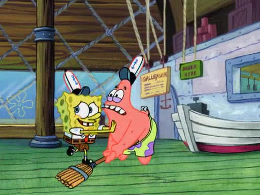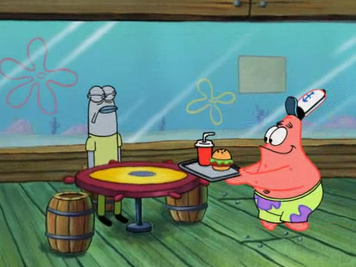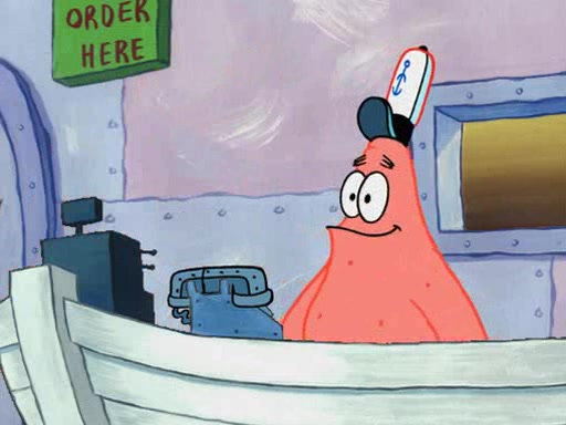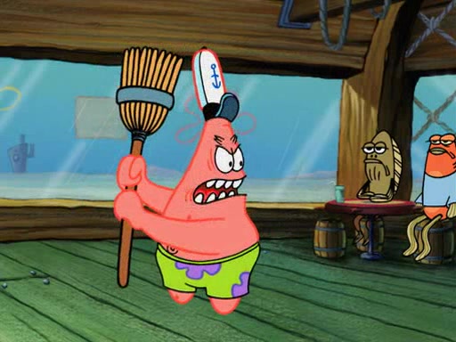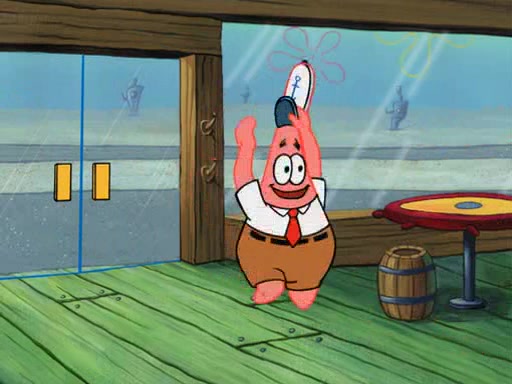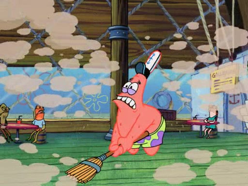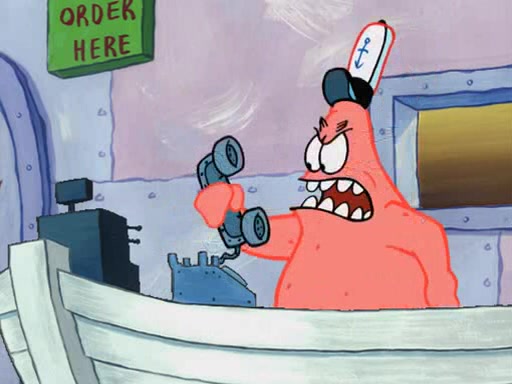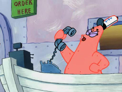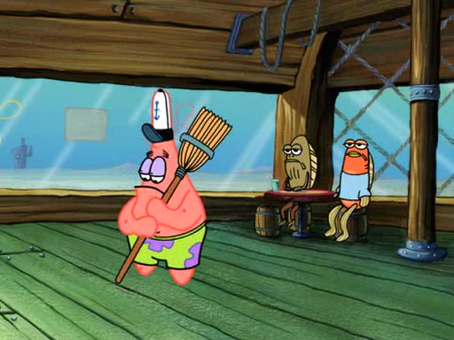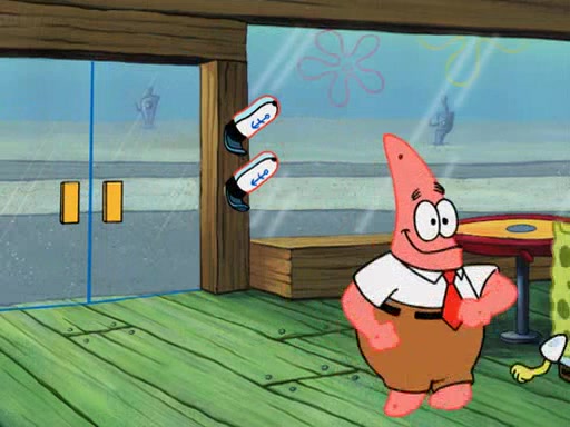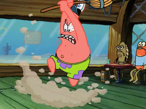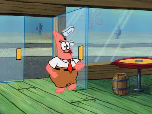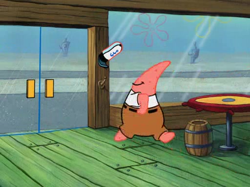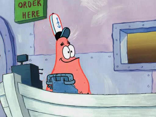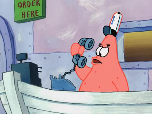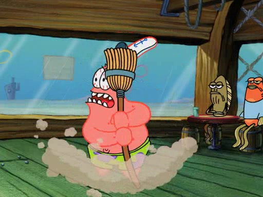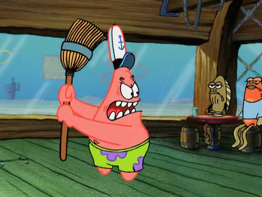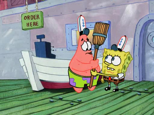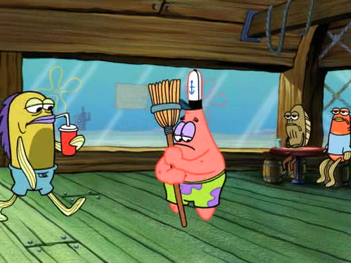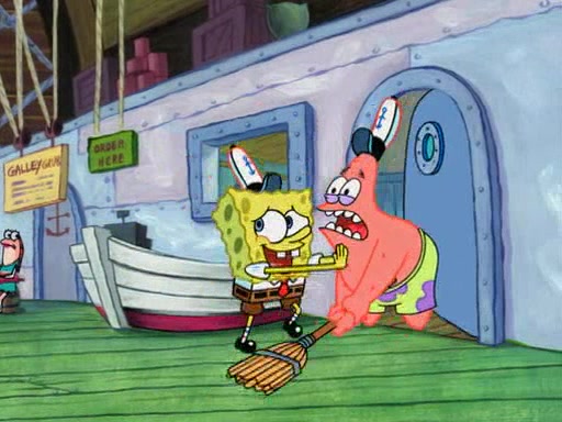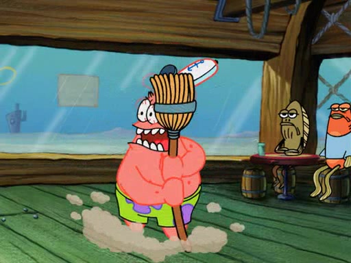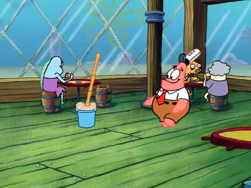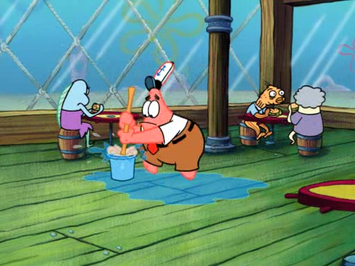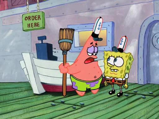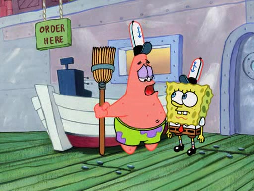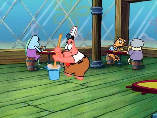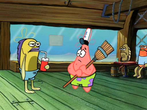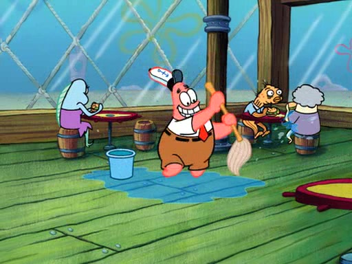 First Patrick has to deliver some food to a customer; however, he keeps eating the customer's order, so SpongeBob gives him an explanation on how to do it right. Then he starts answering the phone, but ends up getting really angry when he thinks everyone is calling him the Krusty Krab. SpongeBob tells him that's the name of the restaurant, leaving Patrick ashamed. His next task is to sweep the floor near table 3. Patrick states he can't do anything right, but SpongeBob assures him that he'll do fine. Unfortunately, he sweeps the floor with the top part of the broom. Suddenly, a delivery man comes in, saying he has a load of awards for SpongeBob SquarePants. Patrick is so angry that he hits the floor with the broom making dust fly everywhere, making everyone cough. SpongeBob then pushes Patrick into the kitchen.