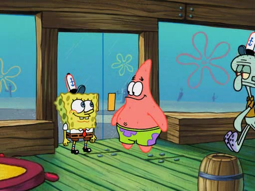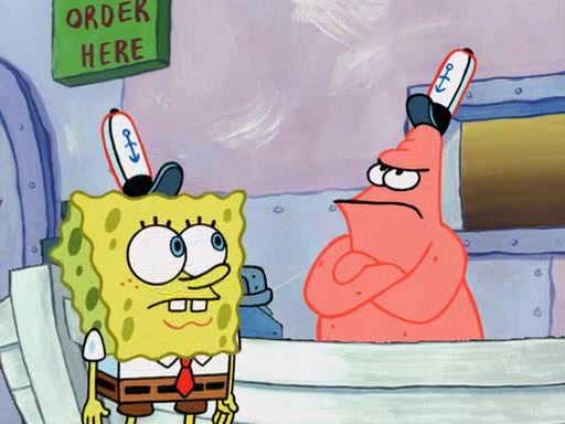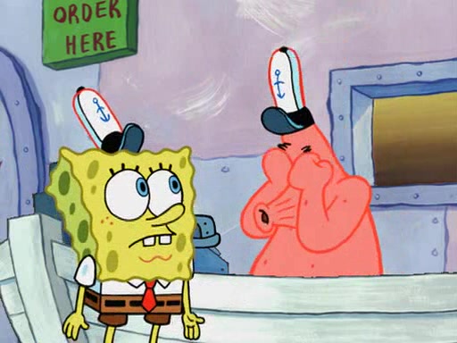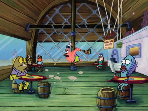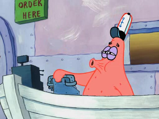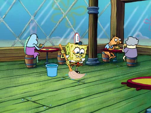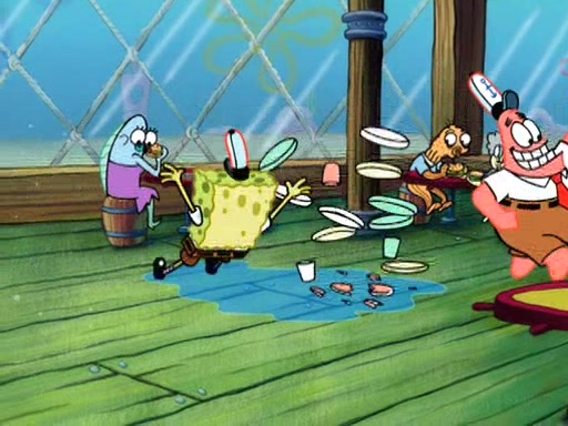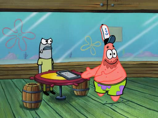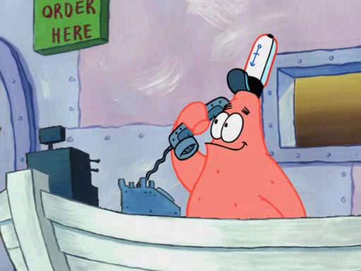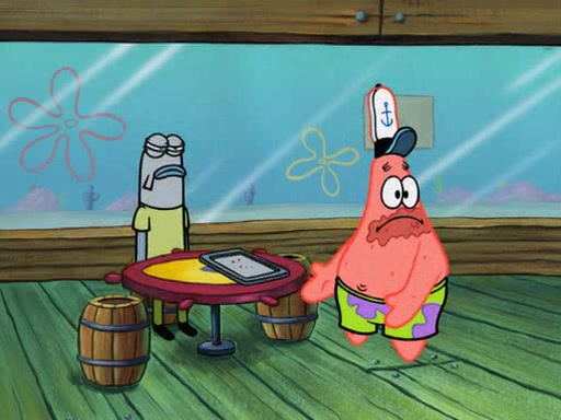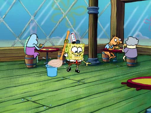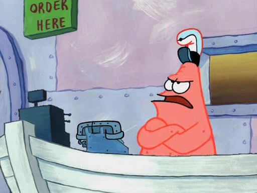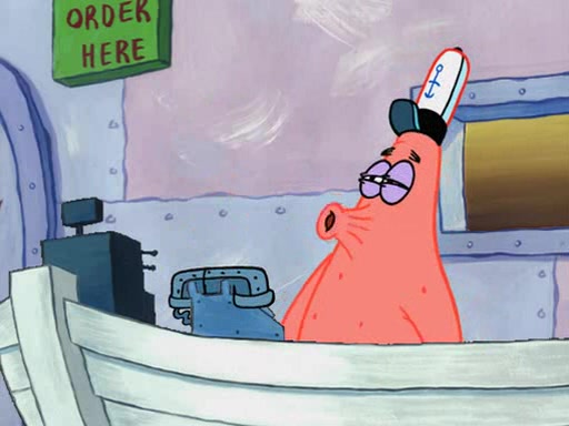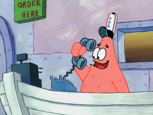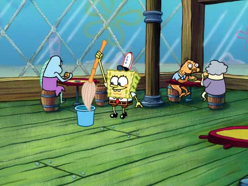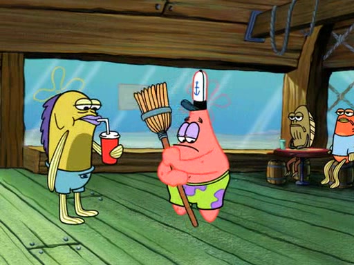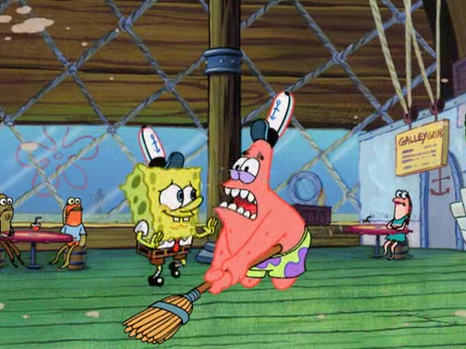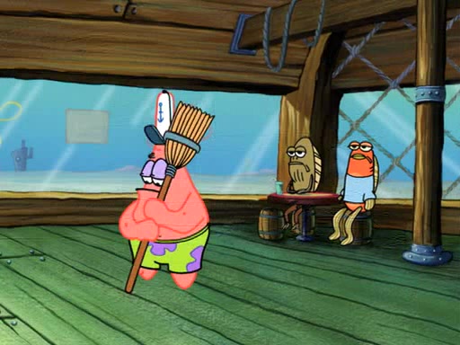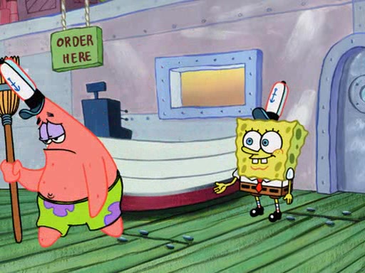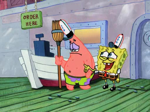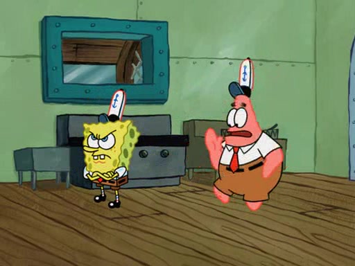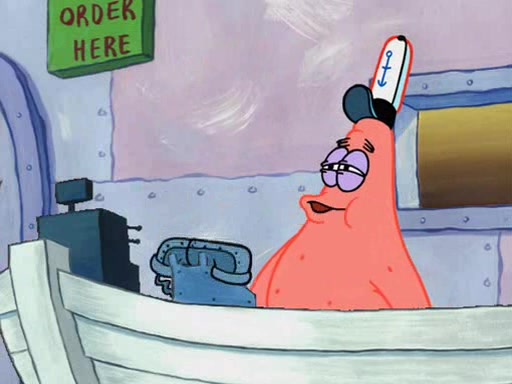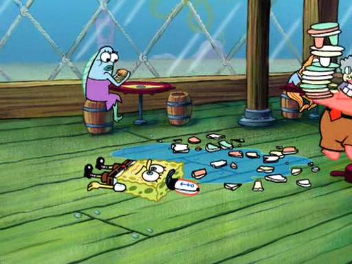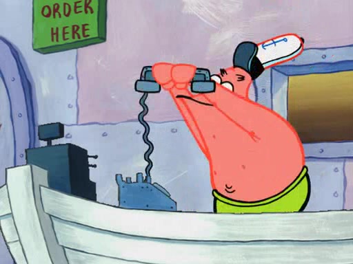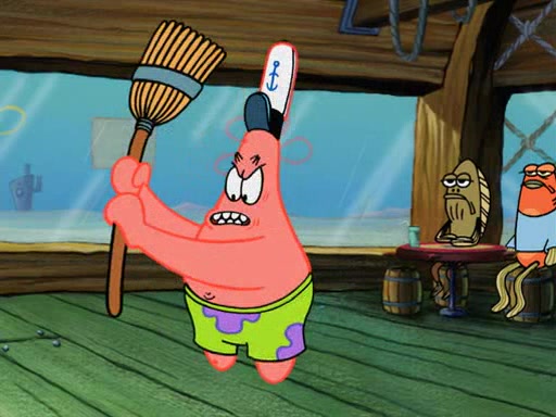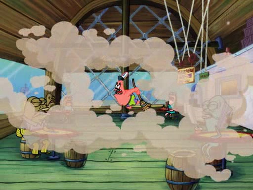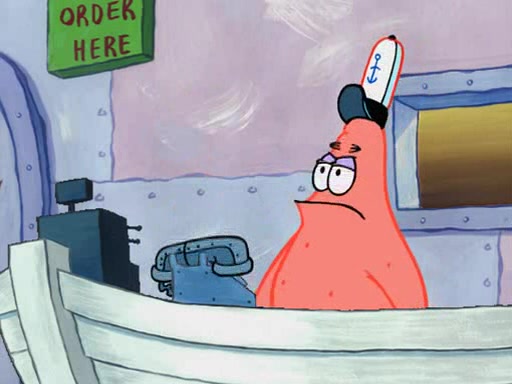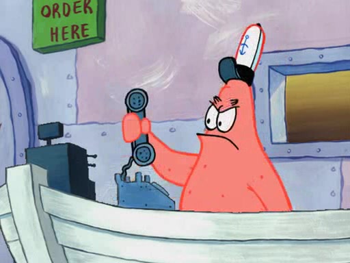 First Patrick has to deliver some food to a customer; however, he keeps eating the customer's order, so SpongeBob gives him an explanation on how to do it right. Then he starts answering the phone, but ends up getting really angry when he thinks everyone is calling him the Krusty Krab. SpongeBob tells him that's the name of the restaurant, leaving Patrick ashamed. His next task is to sweep the floor near table 3. Patrick states he can't do anything right, but SpongeBob assures him that he'll do fine. Unfortunately, he sweeps the floor with the top part of the broom. Suddenly, a delivery man comes in, saying he has a load of awards for SpongeBob SquarePants. Patrick is so angry that he hits the floor with the broom making dust fly everywhere, making everyone cough. SpongeBob then pushes Patrick into the kitchen.