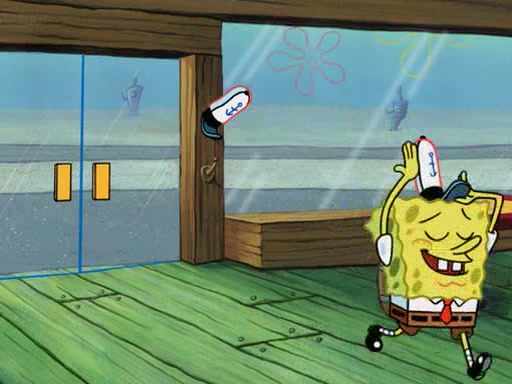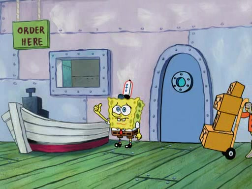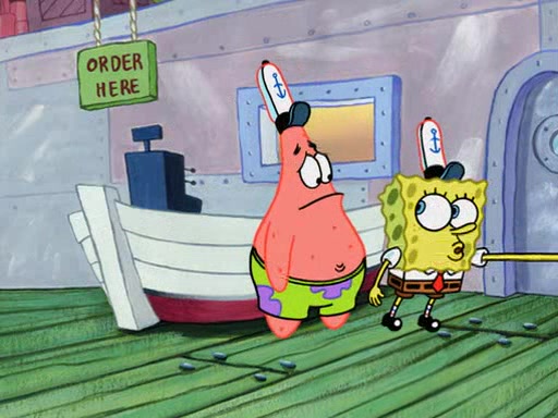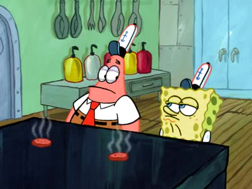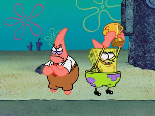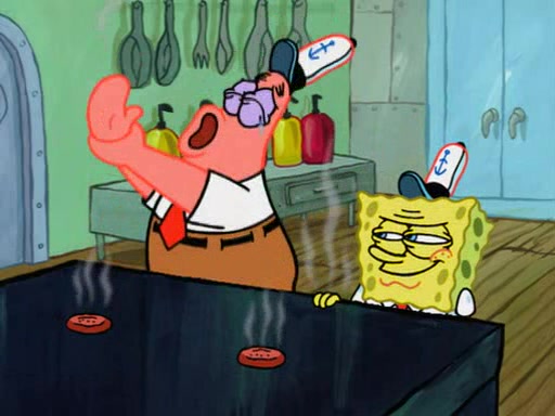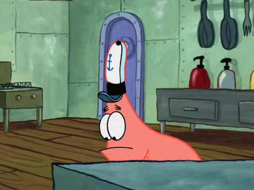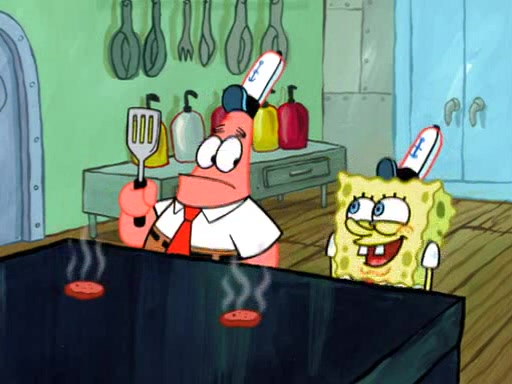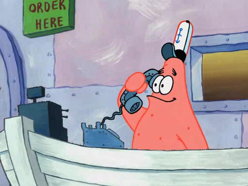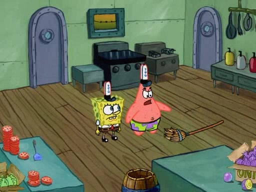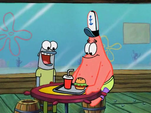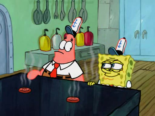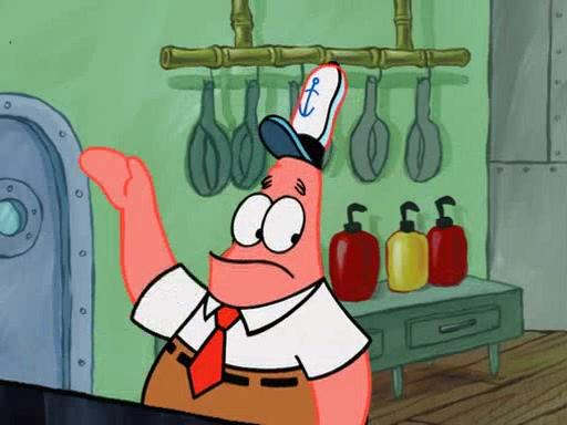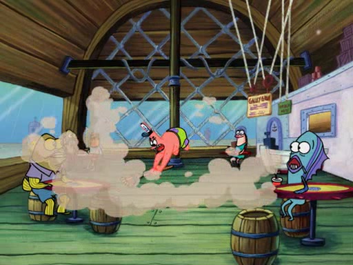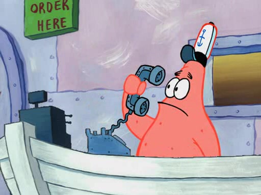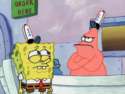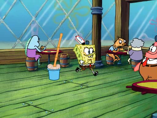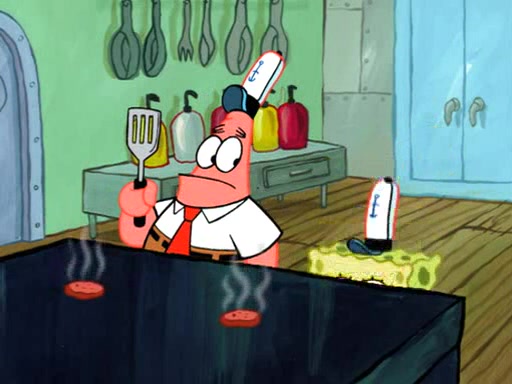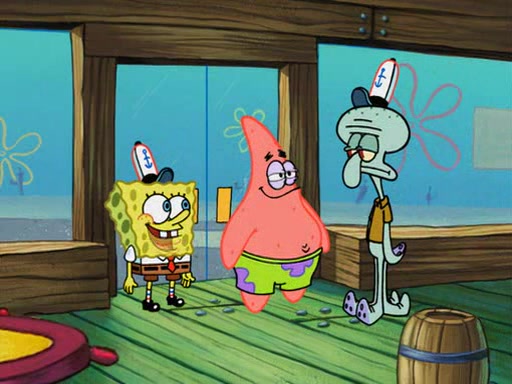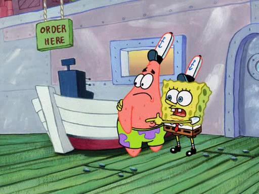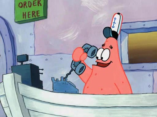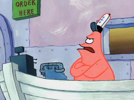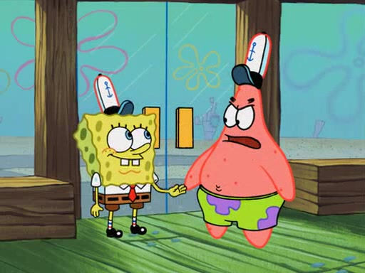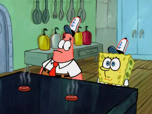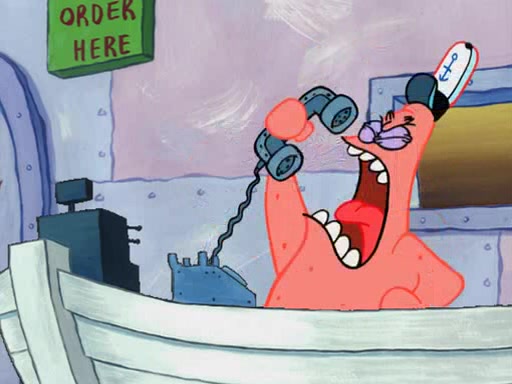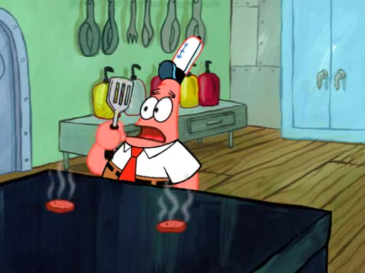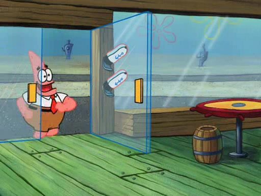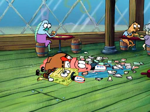 First Patrick has to deliver some food to a customer; however, he keeps eating the customer's order, so SpongeBob gives him an explanation on how to do it right. Then he starts answering the phone, but ends up getting really angry when he thinks everyone is calling him the Krusty Krab. SpongeBob tells him that's the name of the restaurant, leaving Patrick ashamed. His next task is to sweep the floor near table 3. Patrick states he can't do anything right, but SpongeBob assures him that he'll do fine. Unfortunately, he sweeps the floor with the top part of the broom. Suddenly, a delivery man comes in, saying he has a load of awards for SpongeBob SquarePants. Patrick is so angry that he hits the floor with the broom making dust fly everywhere, making everyone cough. SpongeBob then pushes Patrick into the kitchen.