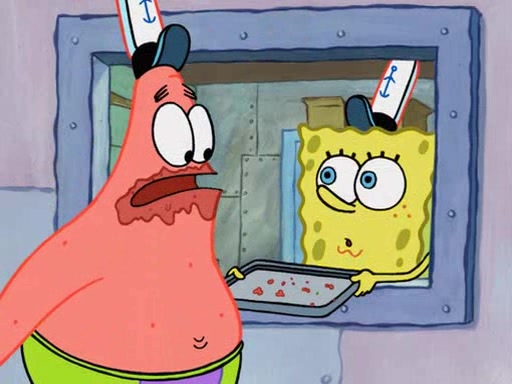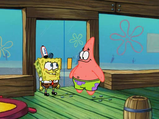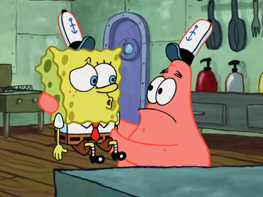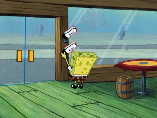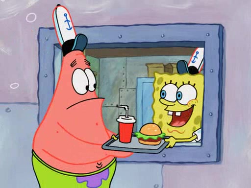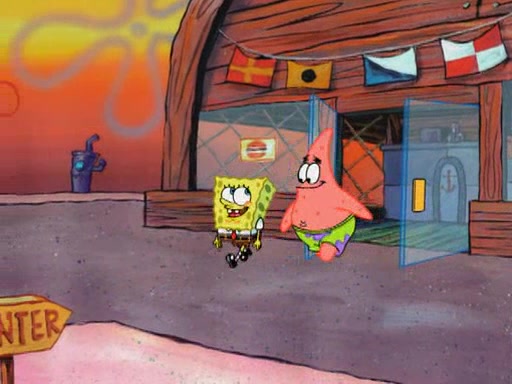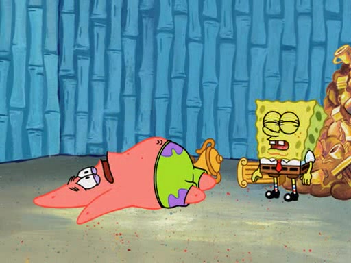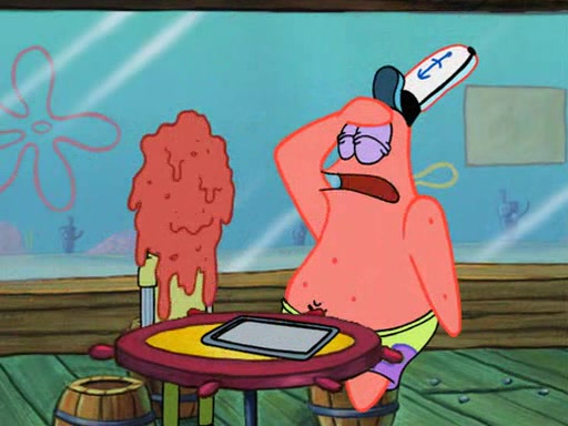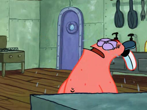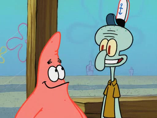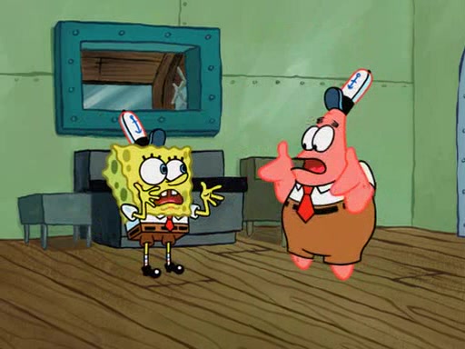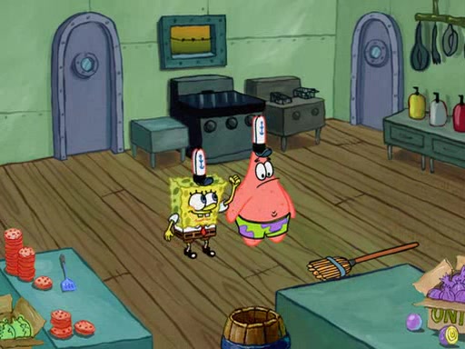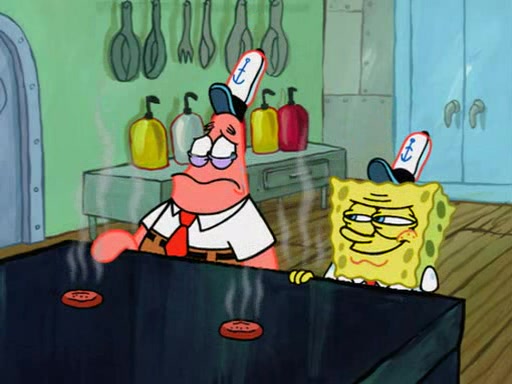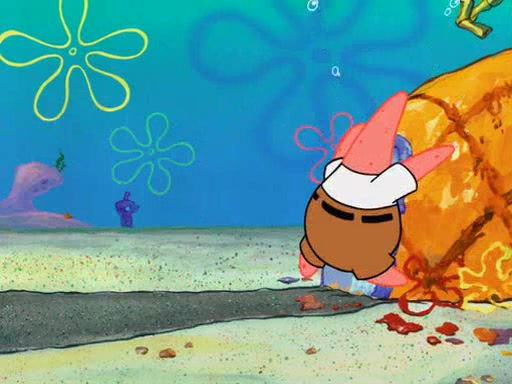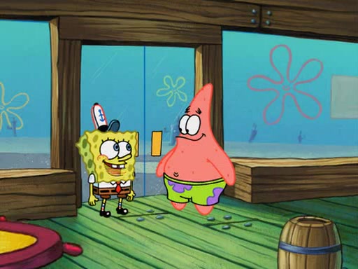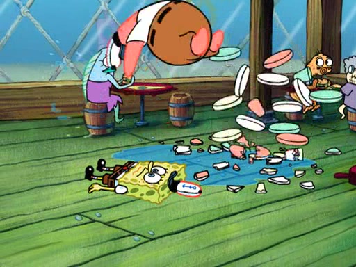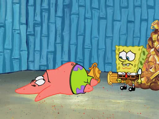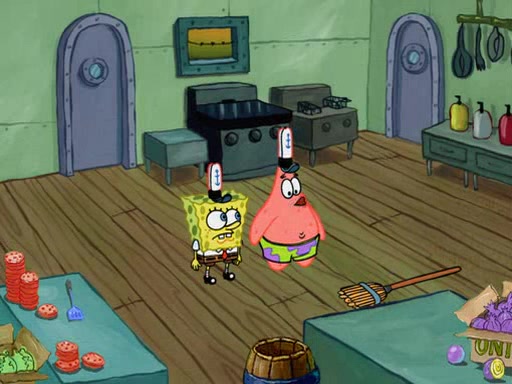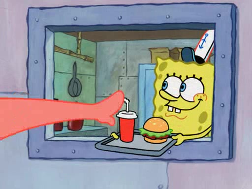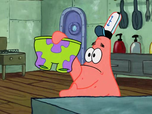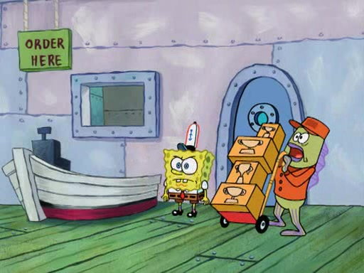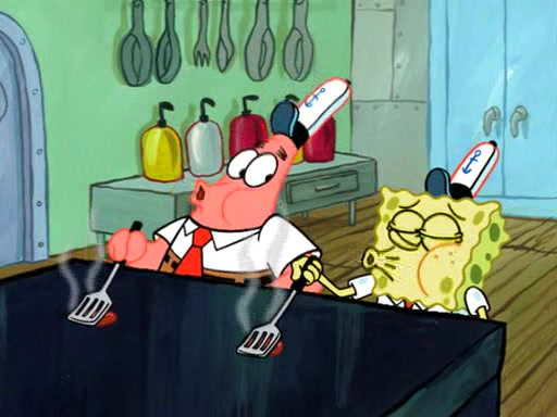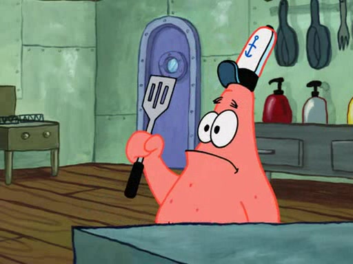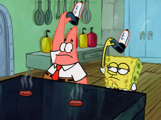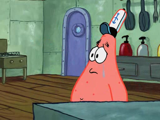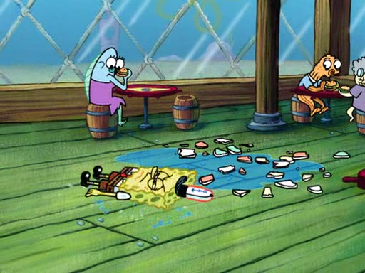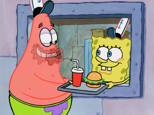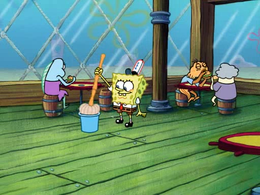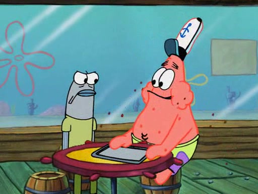 First Patrick has to deliver some food to a customer; however, he keeps eating the customer's order, so SpongeBob gives him an explanation on how to do it right. Then he starts answering the phone, but ends up getting really angry when he thinks everyone is calling him the Krusty Krab. SpongeBob tells him that's the name of the restaurant, leaving Patrick ashamed. His next task is to sweep the floor near table 3. Patrick states he can't do anything right, but SpongeBob assures him that he'll do fine. Unfortunately, he sweeps the floor with the top part of the broom. Suddenly, a delivery man comes in, saying he has a load of awards for SpongeBob SquarePants. Patrick is so angry that he hits the floor with the broom making dust fly everywhere, making everyone cough. SpongeBob then pushes Patrick into the kitchen.
