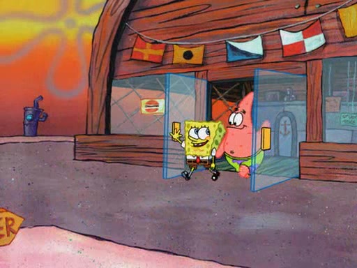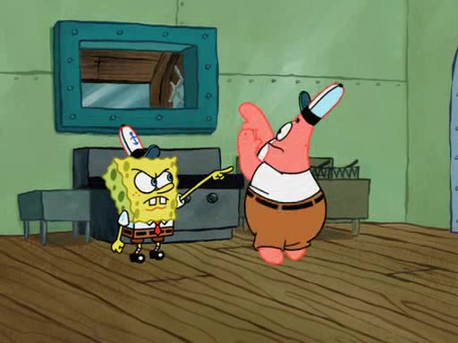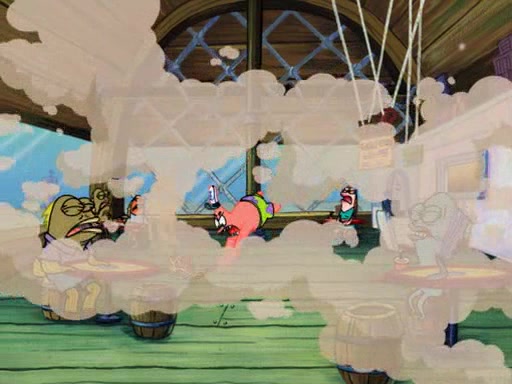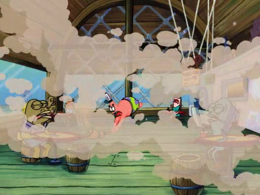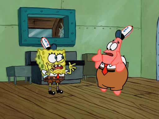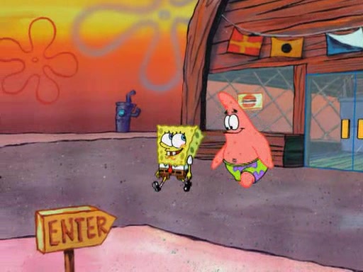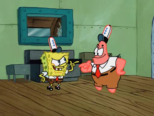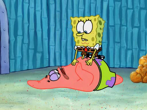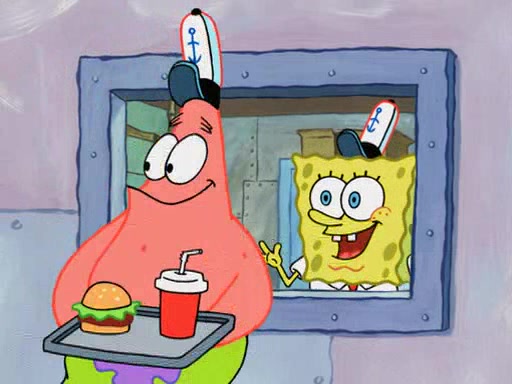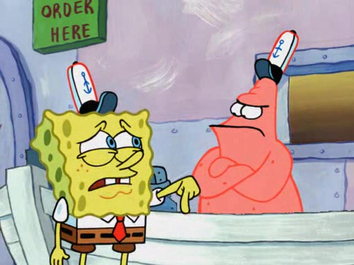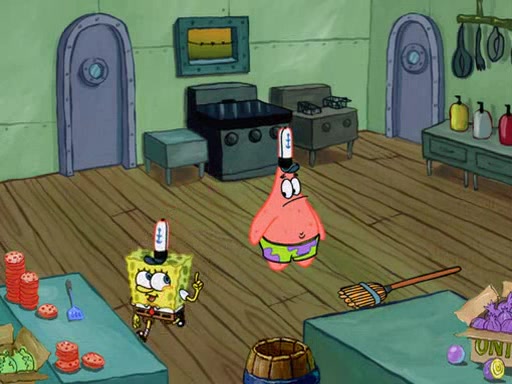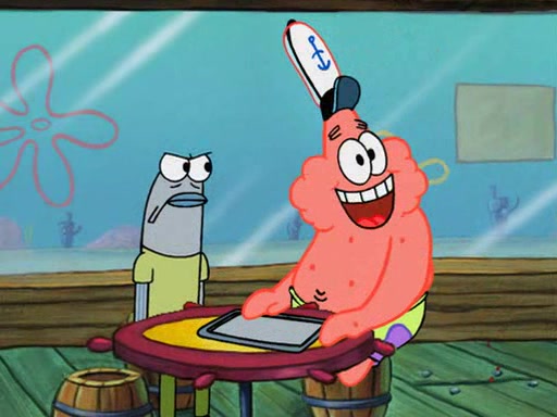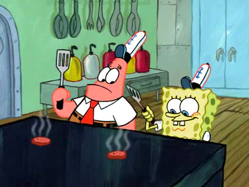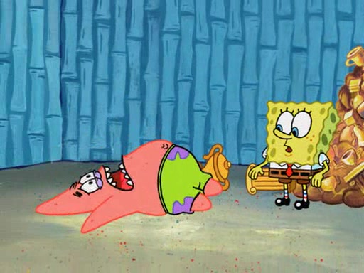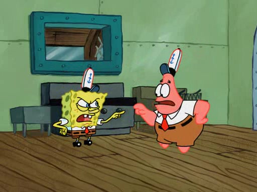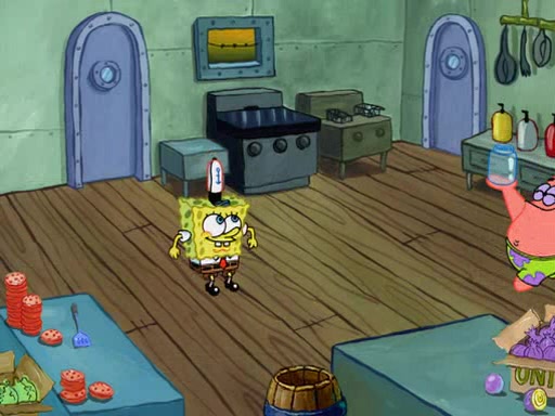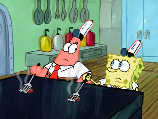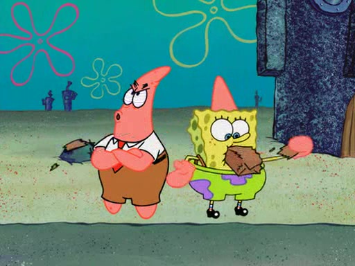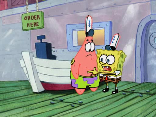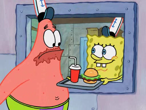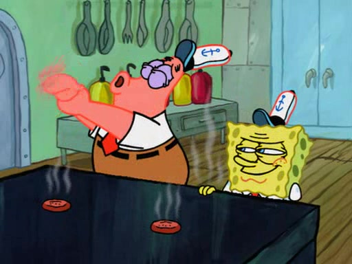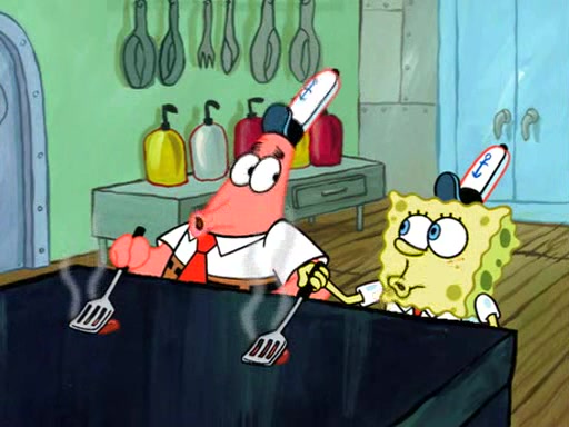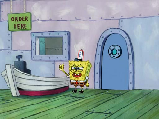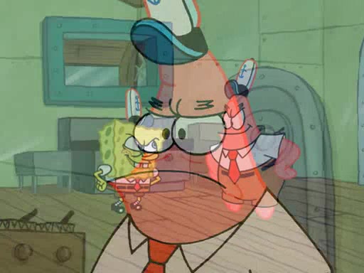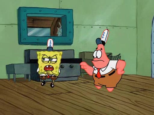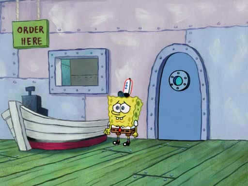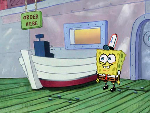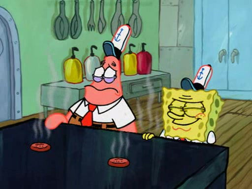 First Patrick has to deliver some food to a customer; however, he keeps eating the customer's order, so SpongeBob gives him an explanation on how to do it right. Then he starts answering the phone, but ends up getting really angry when he thinks everyone is calling him the Krusty Krab. SpongeBob tells him that's the name of the restaurant, leaving Patrick ashamed. His next task is to sweep the floor near table 3. Patrick states he can't do anything right, but SpongeBob assures him that he'll do fine. Unfortunately, he sweeps the floor with the top part of the broom. Suddenly, a delivery man comes in, saying he has a load of awards for SpongeBob SquarePants. Patrick is so angry that he hits the floor with the broom making dust fly everywhere, making everyone cough. SpongeBob then pushes Patrick into the kitchen.