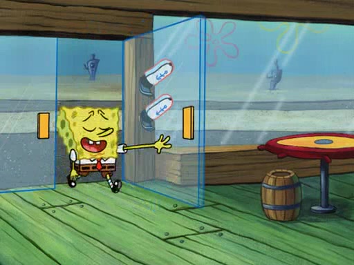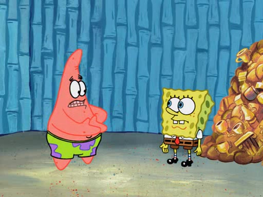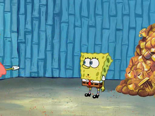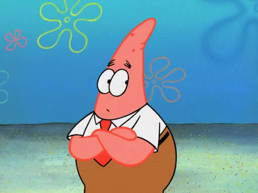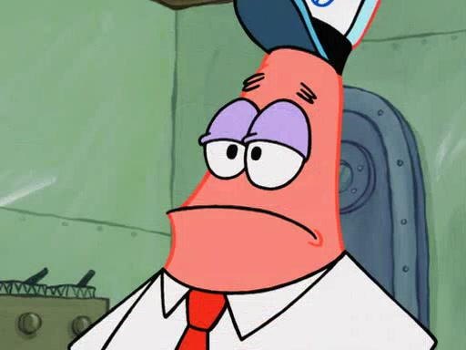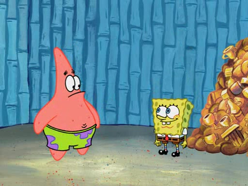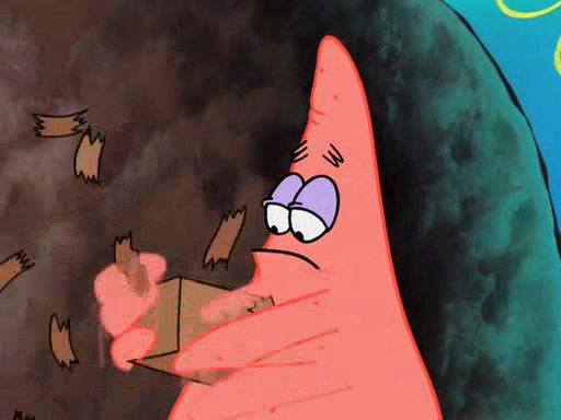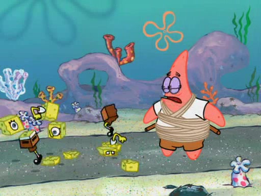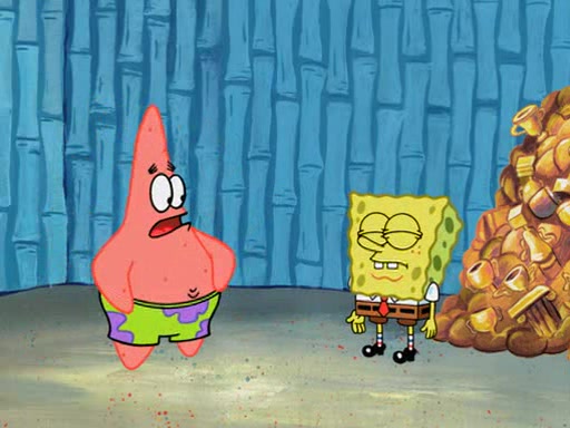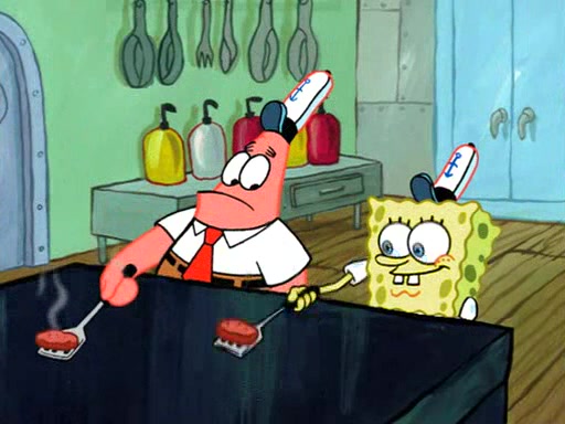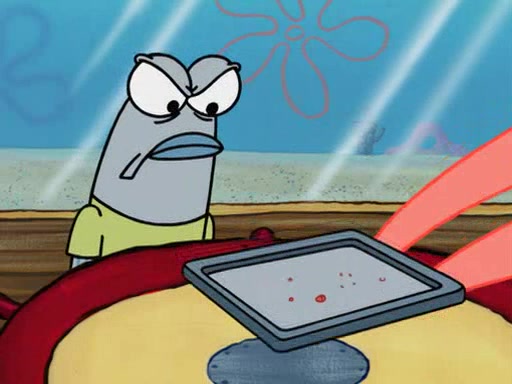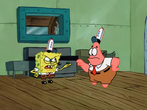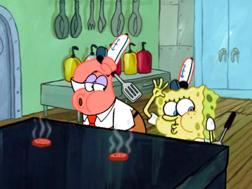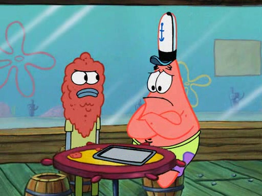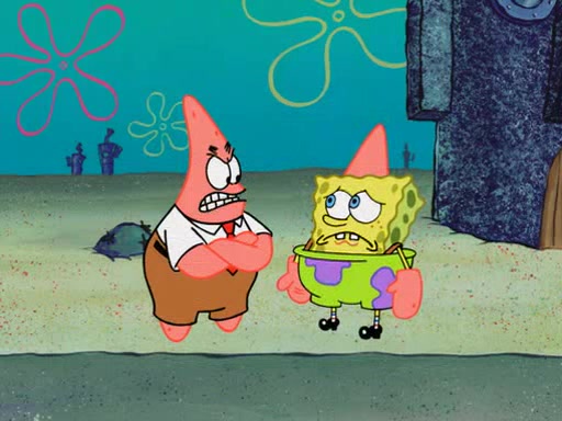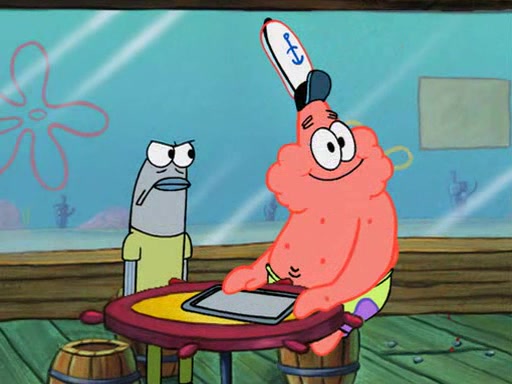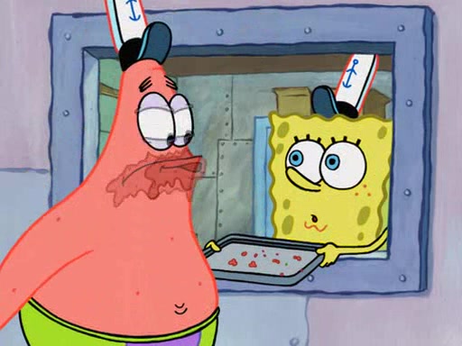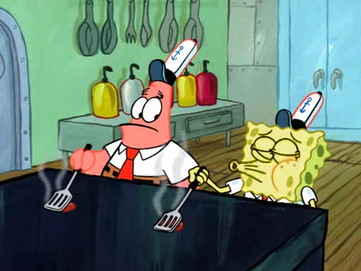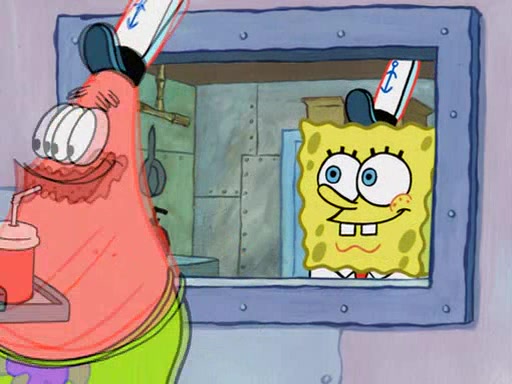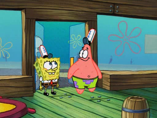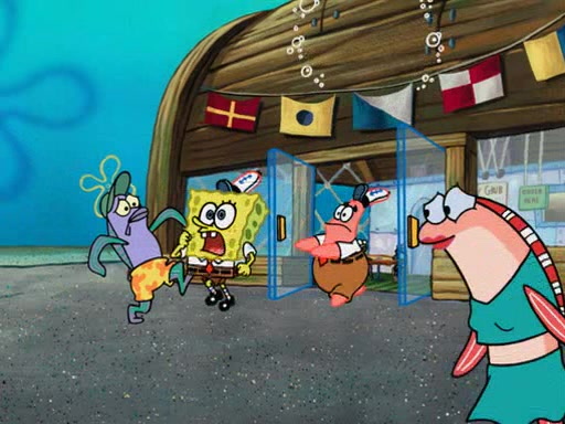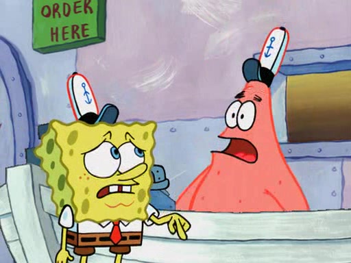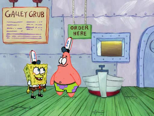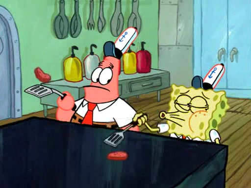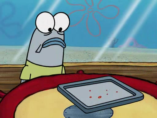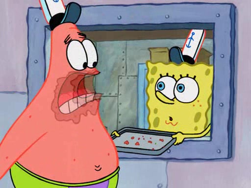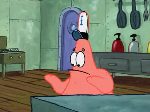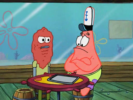 First Patrick has to deliver some food to a customer; however, he keeps eating the customer's order, so SpongeBob gives him an explanation on how to do it right. Then he starts answering the phone, but ends up getting really angry when he thinks everyone is calling him the Krusty Krab. SpongeBob tells him that's the name of the restaurant, leaving Patrick ashamed. His next task is to sweep the floor near table 3. Patrick states he can't do anything right, but SpongeBob assures him that he'll do fine. Unfortunately, he sweeps the floor with the top part of the broom. Suddenly, a delivery man comes in, saying he has a load of awards for SpongeBob SquarePants. Patrick is so angry that he hits the floor with the broom making dust fly everywhere, making everyone cough. SpongeBob then pushes Patrick into the kitchen.