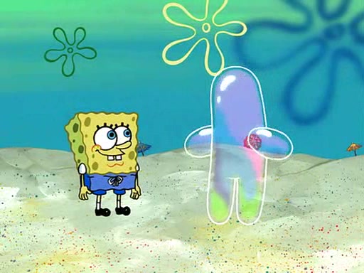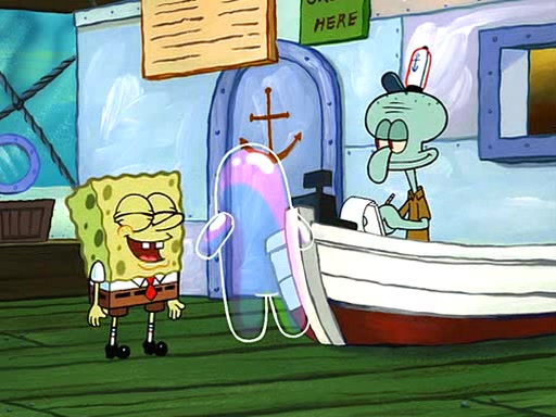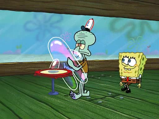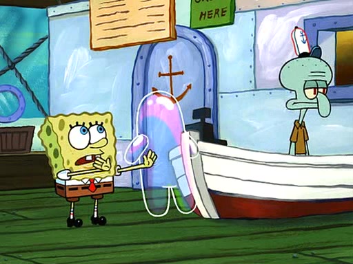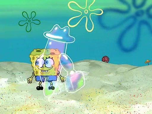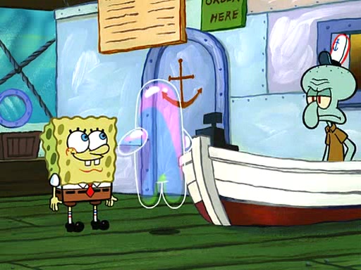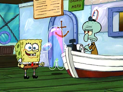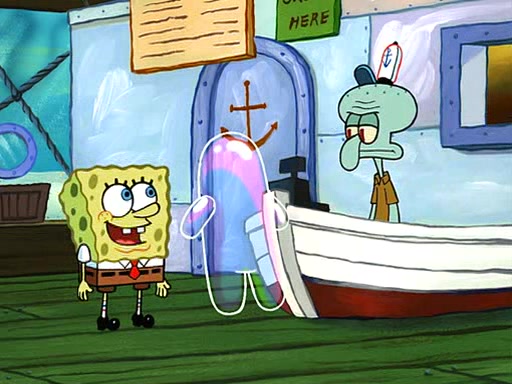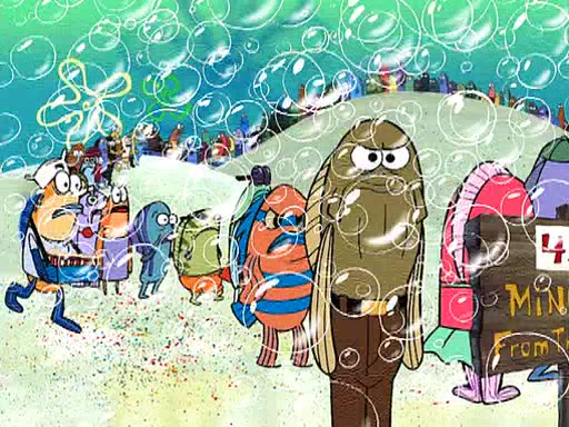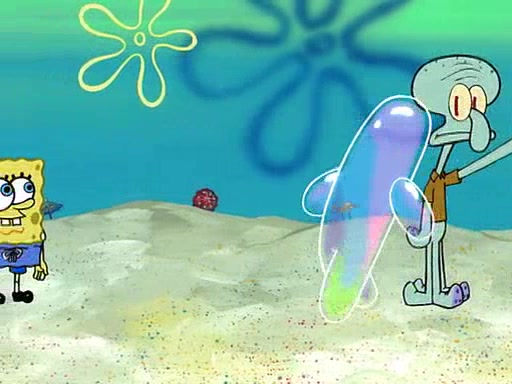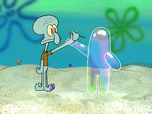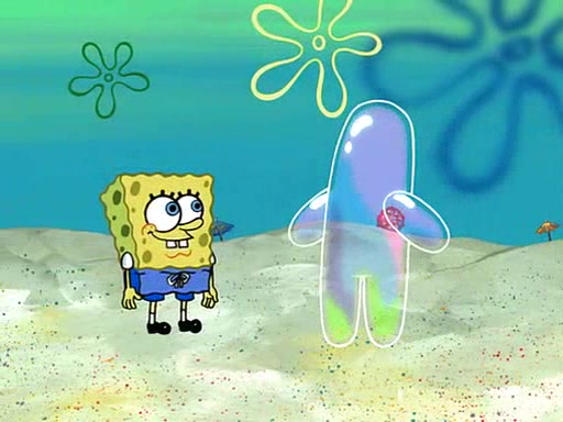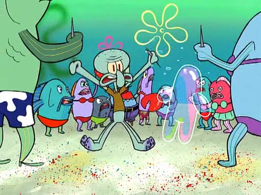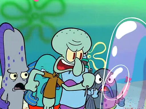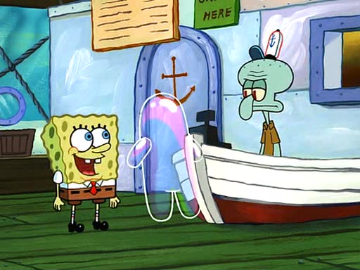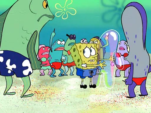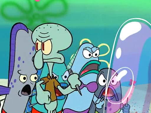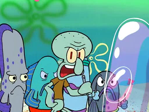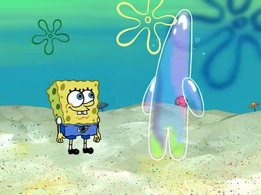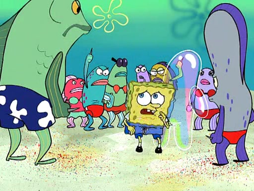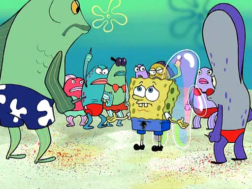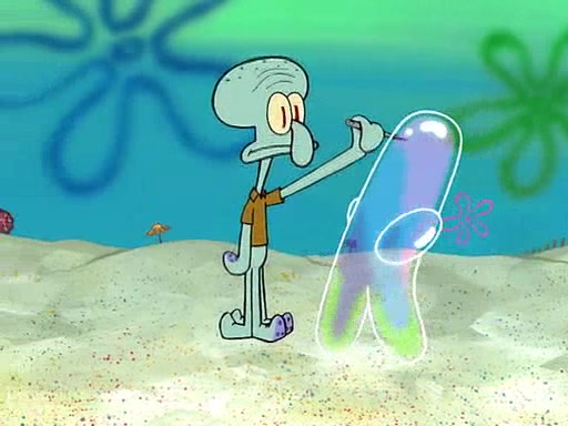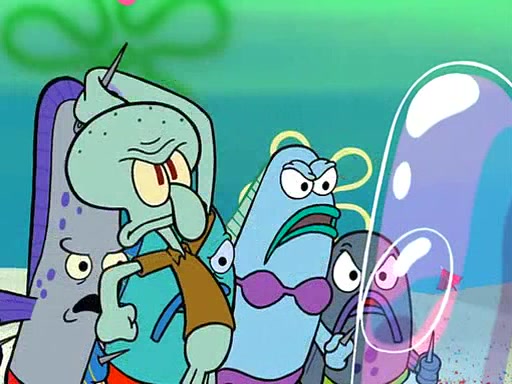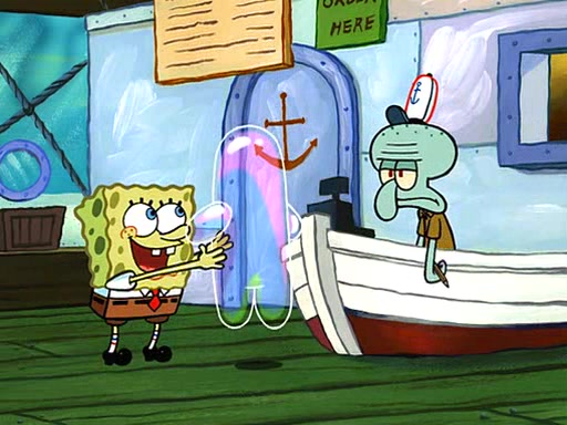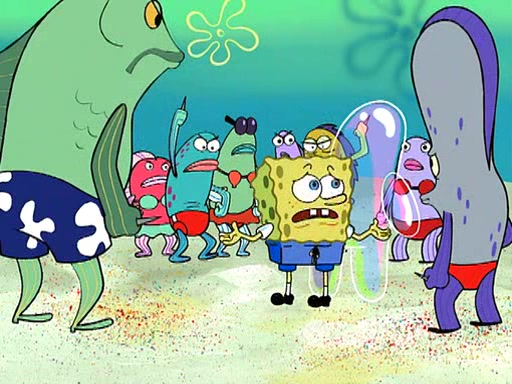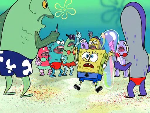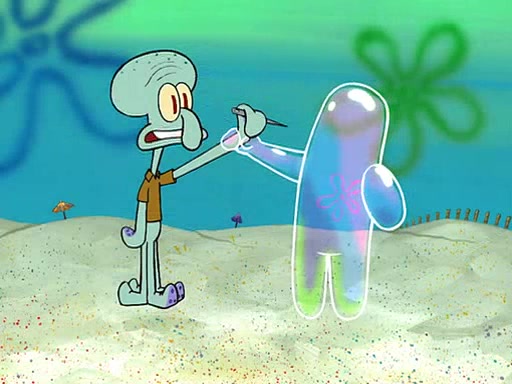 SpongeBob and Bubble Buddy then go to the Goo Lagoon, where they continue to cause trouble, even resulting in the demise of one fish. Eventually, the Bikini Bottomites become fed up with Bubble Buddy and begin to riot, even tipping over the lifeguard tower. Squidward steps in and blames SpongeBob and the bubble he has created, causing the mob to direct their efforts towards popping Bubble Buddy. They surround SpongeBob and Bubble Buddy, brandishing sewing needles. SpongeBob tries to inform the crowd that Bubble Buddy is uncomfortable around their pointy needles, but they tell him that they are done with Bubble Buddy. SpongeBob tries to escape by inflating Bubble Buddy, but he flies weakly back into the crowd's grasp. SpongeBob says Bubble Buddy is his special friend and tries to ask if they ever had a special friend. Although some do reveal that they do have a special friend, it isn't enough to change their mind. So they throw SpongeBob out of the way. Squidward begins to stab Bubble Buddy, but he suddenly comes to life and catches the needle before it reaches him, much to the shock of Squidward and the other crowd members. Bubble Buddy then tells SpongeBob that "things are getting a little weird around here," and leaves in a bubble taxi, flipping into the sky, wishing SpongeBob a Happy Leif Erikson Day. Everyone appears to be OK with Bubble Buddy leaving Bikini Bottom except Squidward who is still shocked at what happened. The rest of the crowd then leave to go on with their regular lives and SpongeBob happily cries that people grow up so fast before leaving in a flurry of bubbles. All but one of them pop, and Squidward greets it.