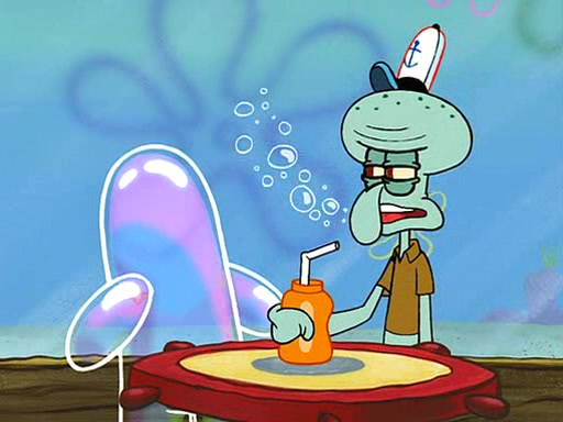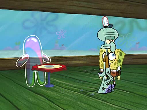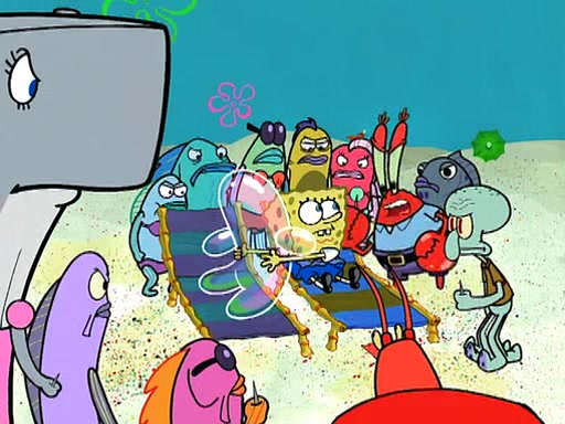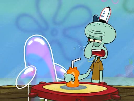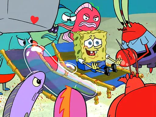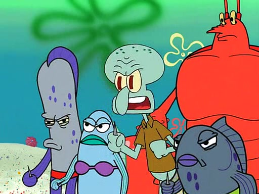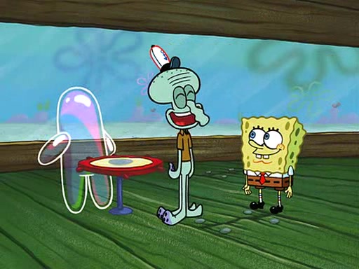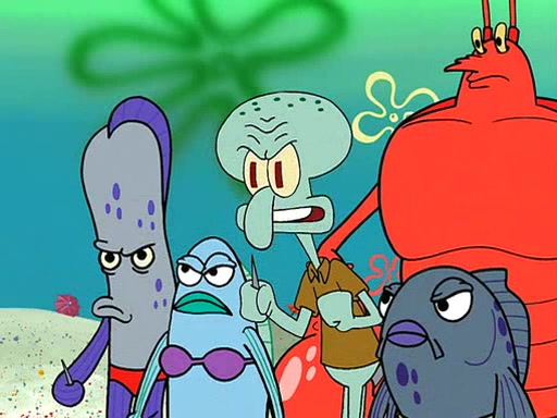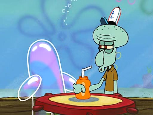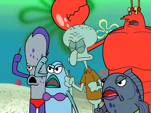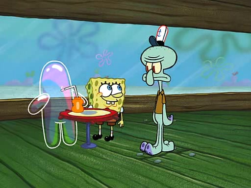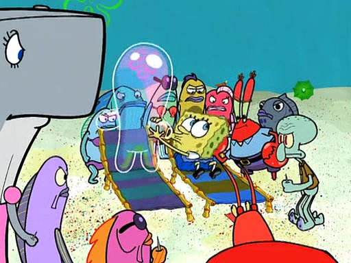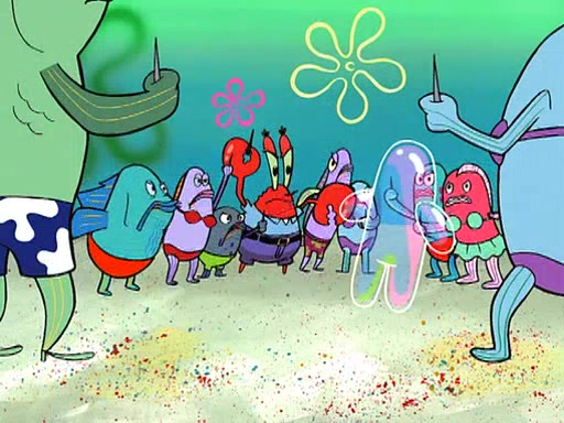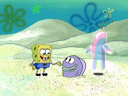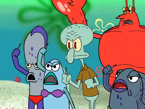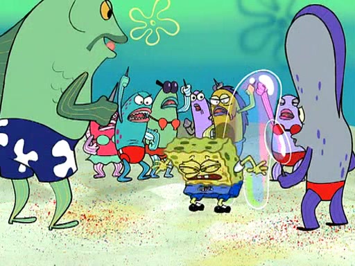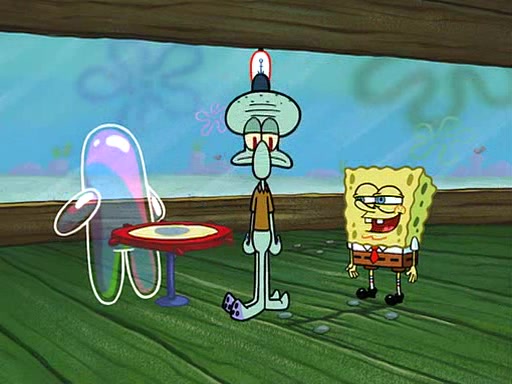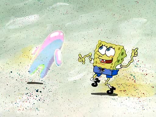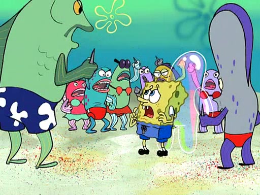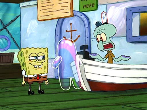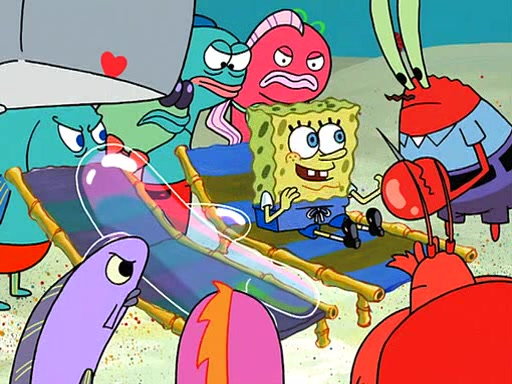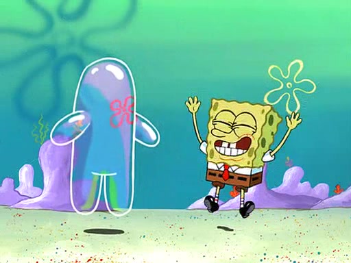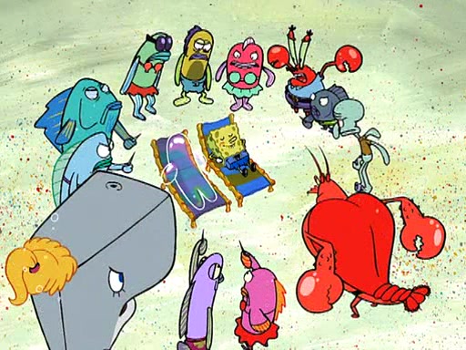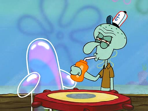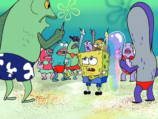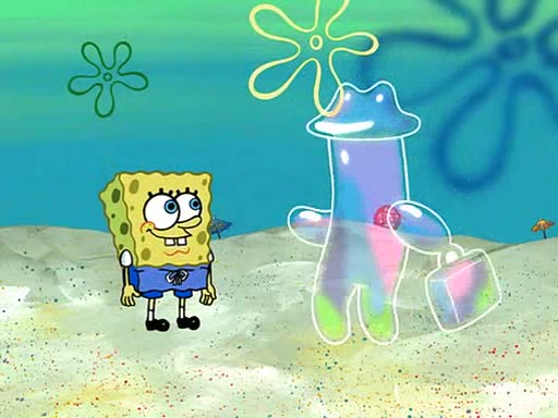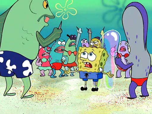 SpongeBob and Bubble Buddy then go to the Goo Lagoon, where they continue to cause trouble, even resulting in the demise of one fish. Eventually, the Bikini Bottomites become fed up with Bubble Buddy and begin to riot, even tipping over the lifeguard tower. Squidward steps in and blames SpongeBob and the bubble he has created, causing the mob to direct their efforts towards popping Bubble Buddy. They surround SpongeBob and Bubble Buddy, brandishing sewing needles. SpongeBob tries to inform the crowd that Bubble Buddy is uncomfortable around their pointy needles, but they tell him that they are done with Bubble Buddy. SpongeBob tries to escape by inflating Bubble Buddy, but he flies weakly back into the crowd's grasp. SpongeBob says Bubble Buddy is his special friend and tries to ask if they ever had a special friend. Although some do reveal that they do have a special friend, it isn't enough to change their mind. So they throw SpongeBob out of the way. Squidward begins to stab Bubble Buddy, but he suddenly comes to life and catches the needle before it reaches him, much to the shock of Squidward and the other crowd members. Bubble Buddy then tells SpongeBob that "things are getting a little weird around here," and leaves in a bubble taxi, flipping into the sky, wishing SpongeBob a Happy Leif Erikson Day. Everyone appears to be OK with Bubble Buddy leaving Bikini Bottom except Squidward who is still shocked at what happened. The rest of the crowd then leave to go on with their regular lives and SpongeBob happily cries that people grow up so fast before leaving in a flurry of bubbles. All but one of them pop, and Squidward greets it.