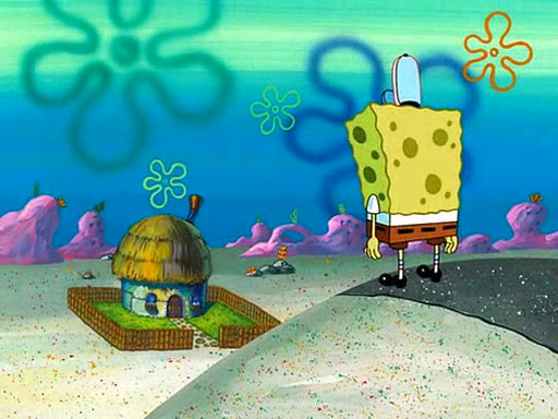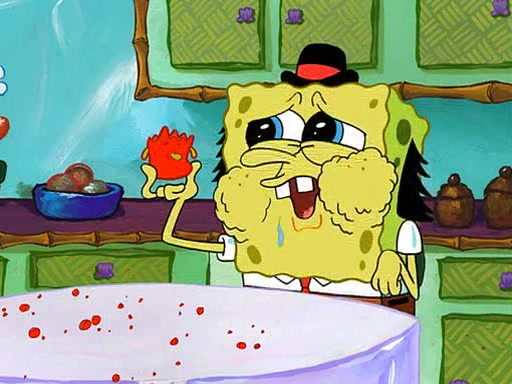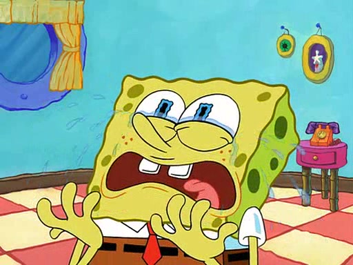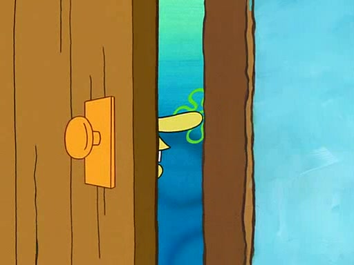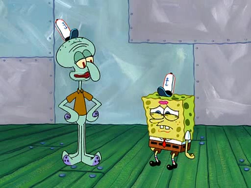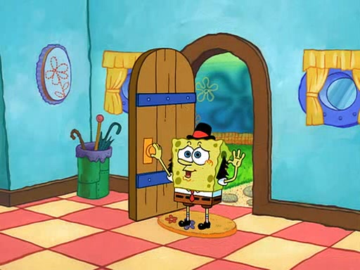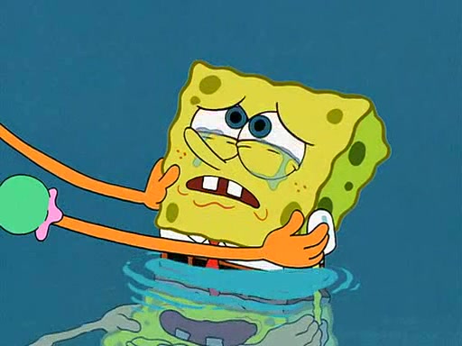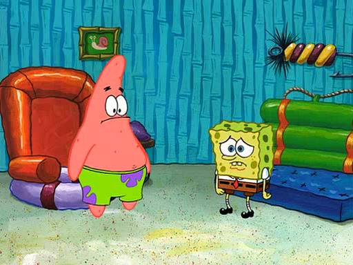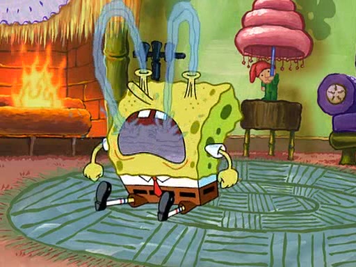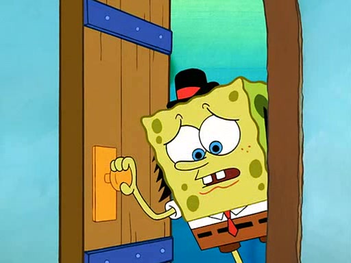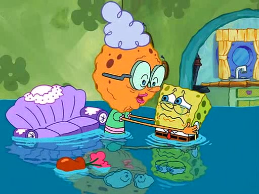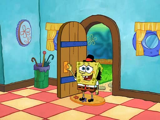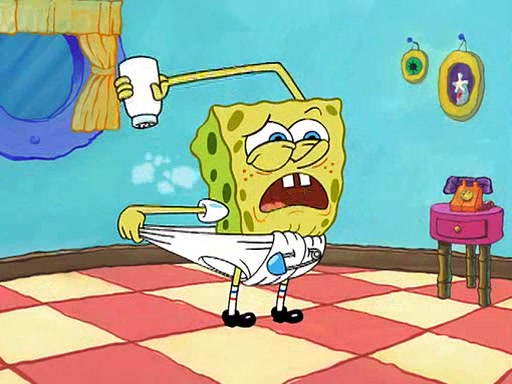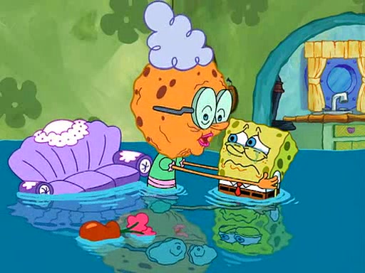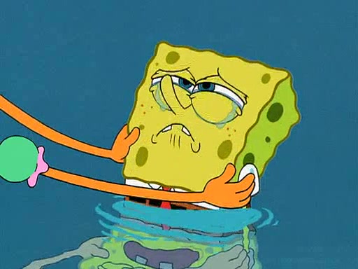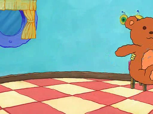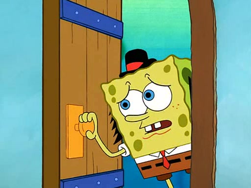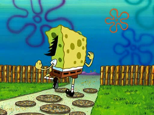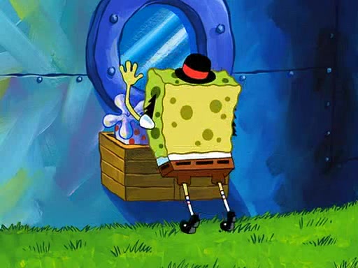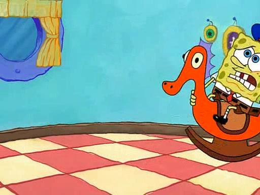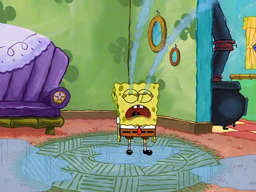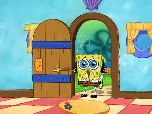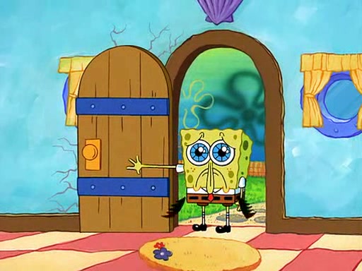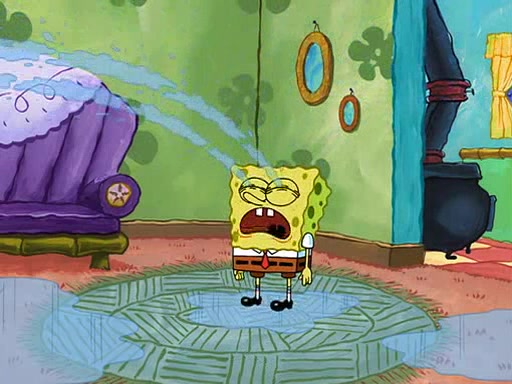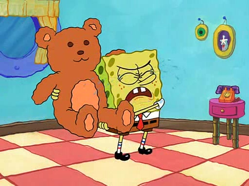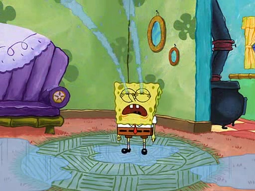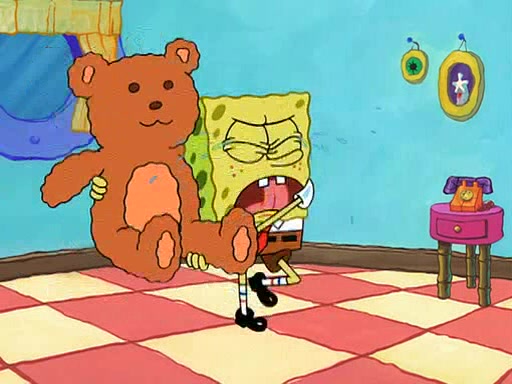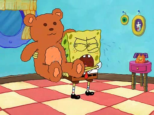 SpongeBob starts walking toward the door and starts to leave as his Grandma lays Patrick down for a nap. Before he leaves, he talks to Grandma, who shushes him because Patrick is asleep. However, SpongeBob soon returns, crying and saying that he doesn't want to grow up, and wants to become a baby again and do all the stuff he did when he was treated like a baby like eating cookies, drink out of a bottle with milk, wear a sweater "with love in every stitch," wear diapers, ride in his wagon, cuddle with a teddy bear named Mr. Stuffykins, rocking on his seahorse, and get a kiss on his boo-boo. He then cries so intensely that he floods the house.