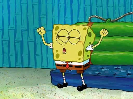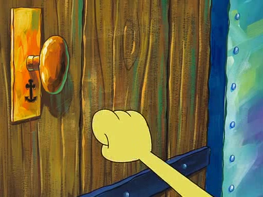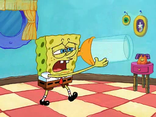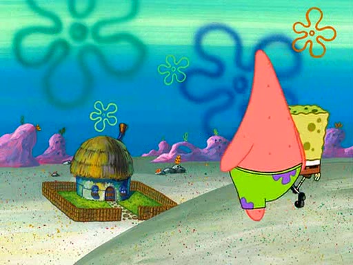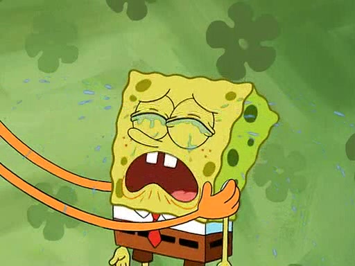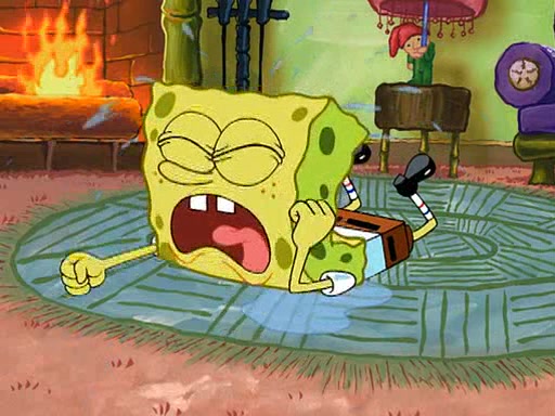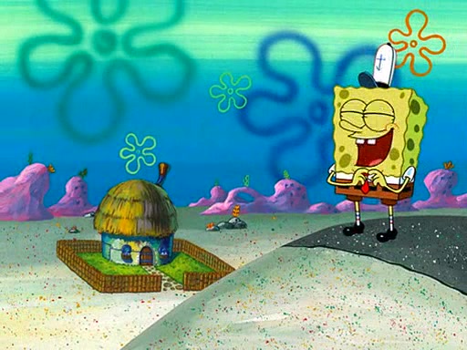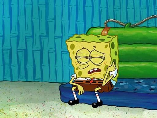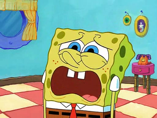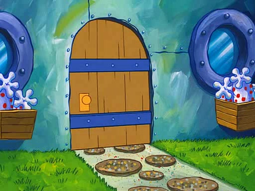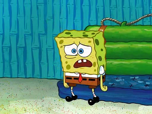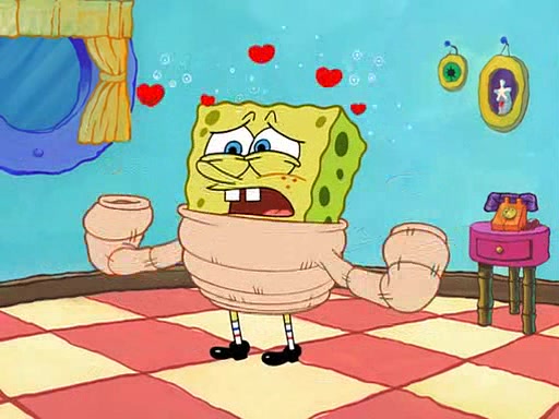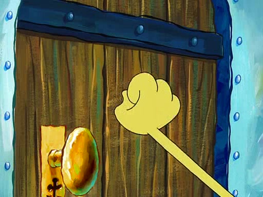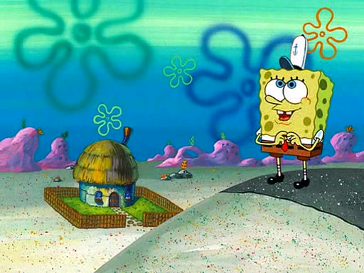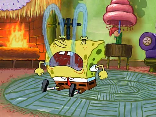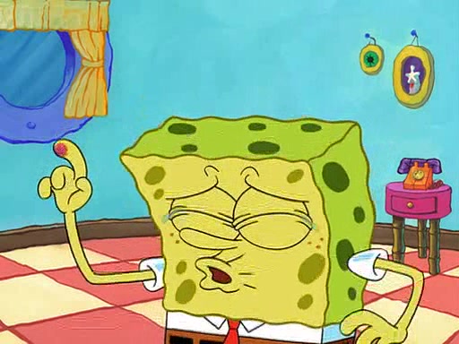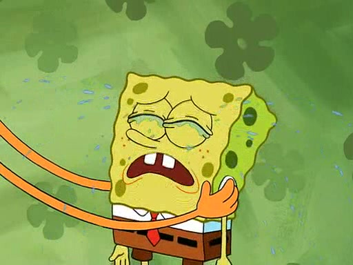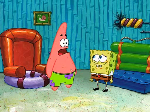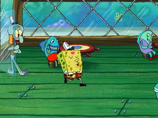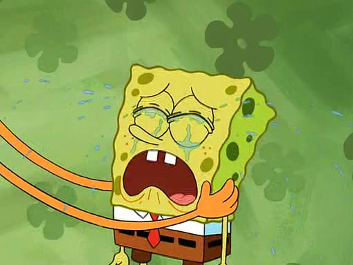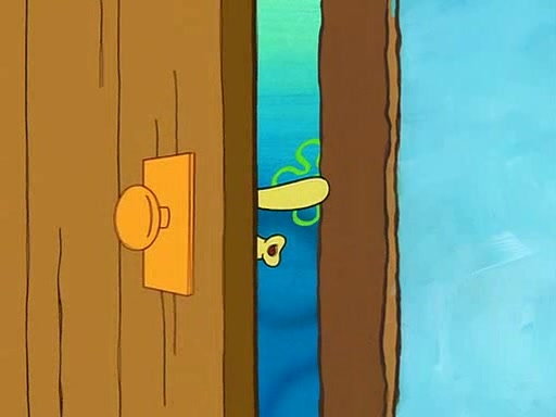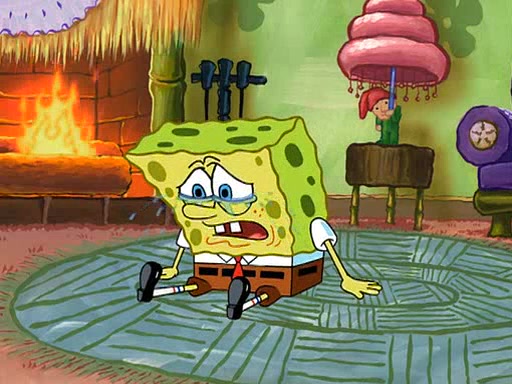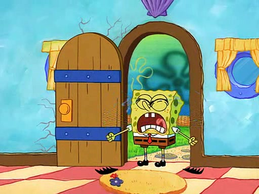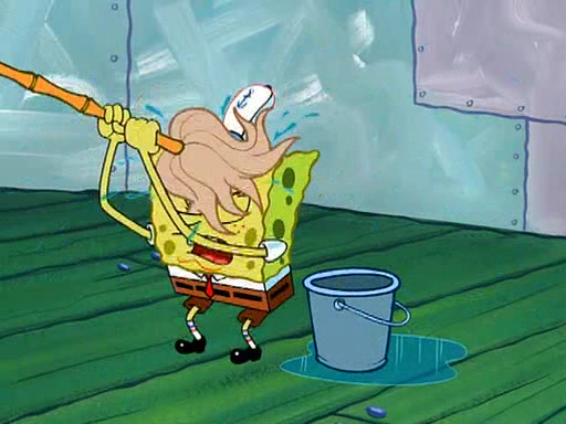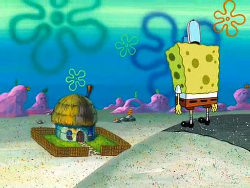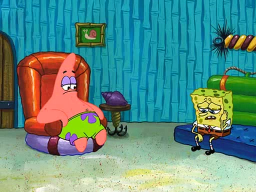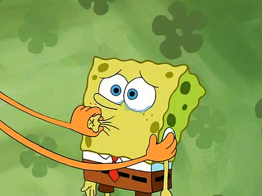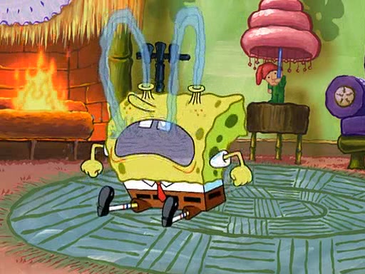 SpongeBob starts walking toward the door and starts to leave as his Grandma lays Patrick down for a nap. Before he leaves, he talks to Grandma, who shushes him because Patrick is asleep. However, SpongeBob soon returns, crying and saying that he doesn't want to grow up, and wants to become a baby again and do all the stuff he did when he was treated like a baby like eating cookies, drink out of a bottle with milk, wear a sweater "with love in every stitch," wear diapers, ride in his wagon, cuddle with a teddy bear named Mr. Stuffykins, rocking on his seahorse, and get a kiss on his boo-boo. He then cries so intensely that he floods the house.