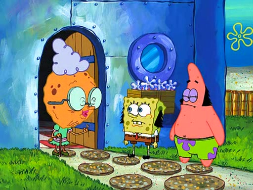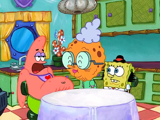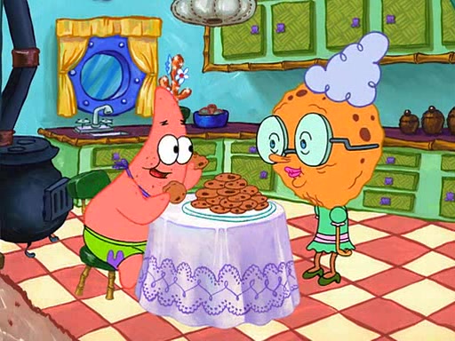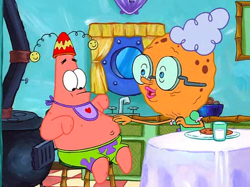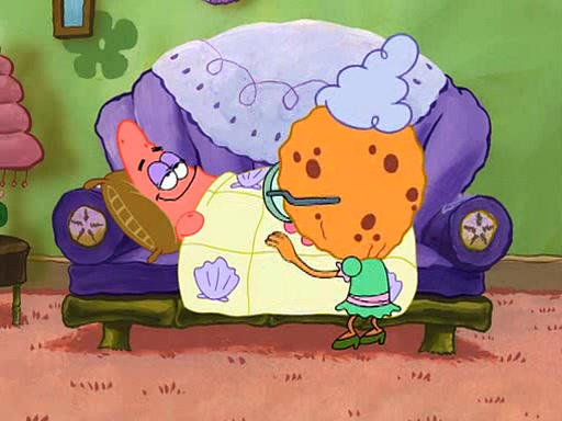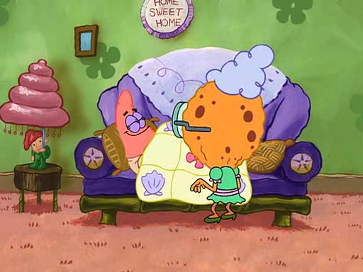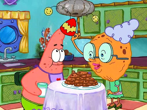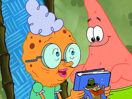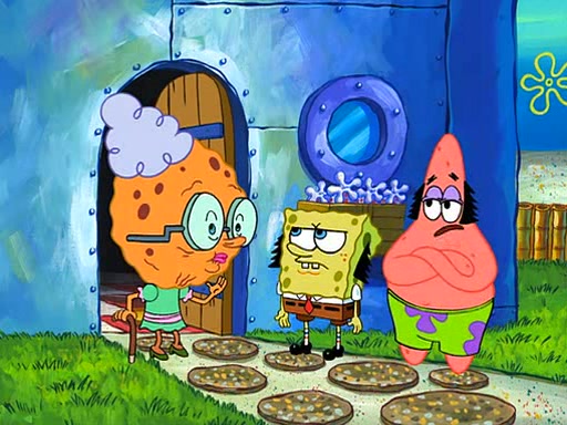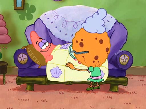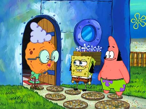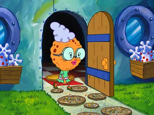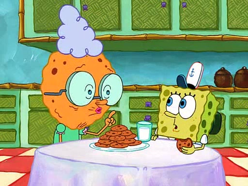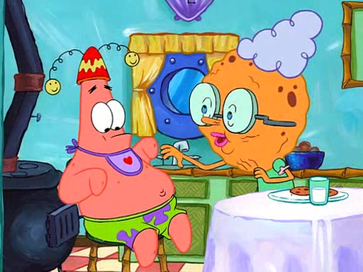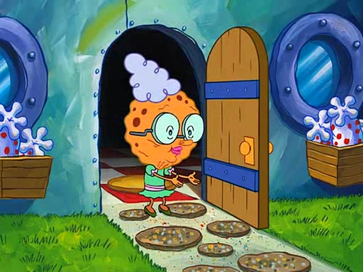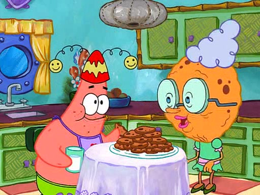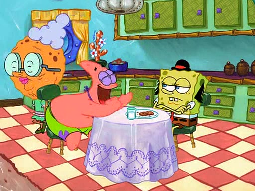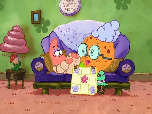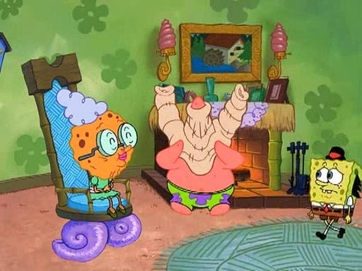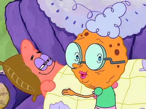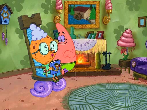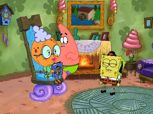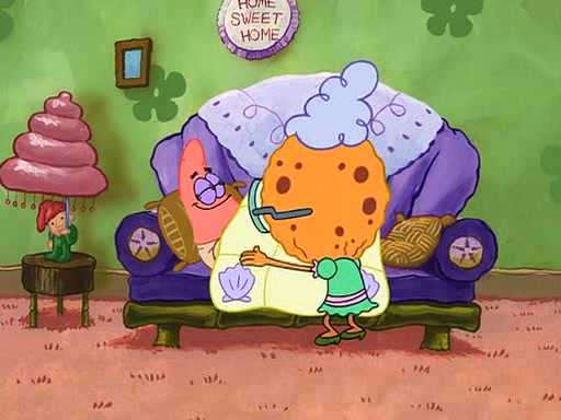 Grandma offers them cookies, which SpongeBob refuses, but Patrick gladly accepts. Patrick begins acting like a baby and when SpongeBob confronts him, he says that being a "grown-up" is boring and that he likes being a baby. SpongeBob attempts to eat a cookie, but Grandma stops him, instead giving him steamed coral from his grandma. Then she tells Patrick a baby story and gives SpongeBob a giant technical manual; later she gives Patrick a sweater "with love in every stitch," and gives SpongeBob unwrapped office supplies. Soon, the clock strikes 3:00 PM., time for SpongeBob to go to work.