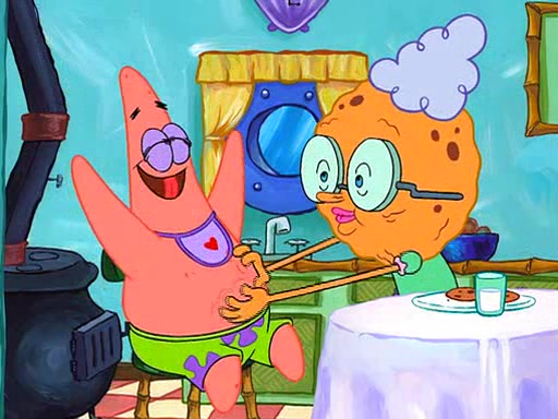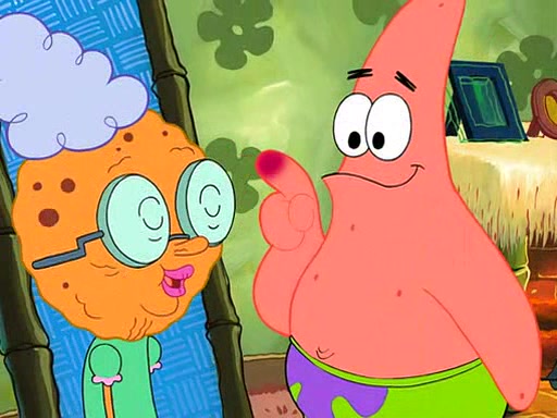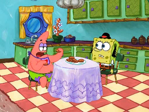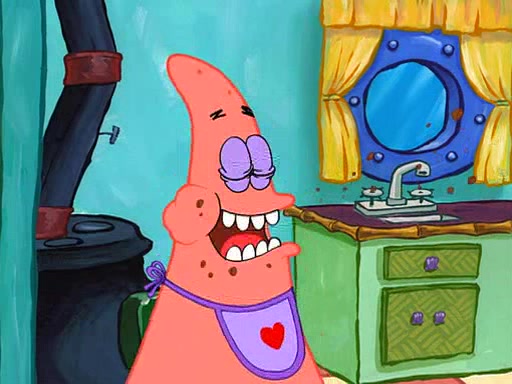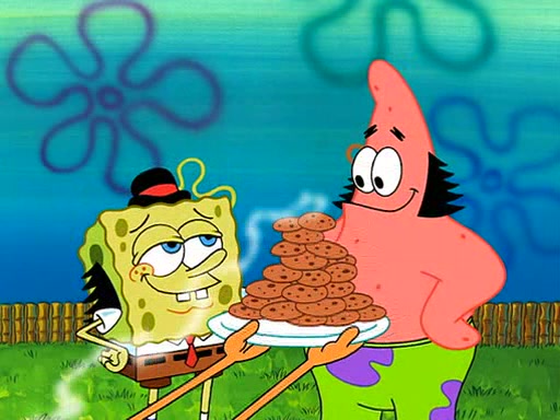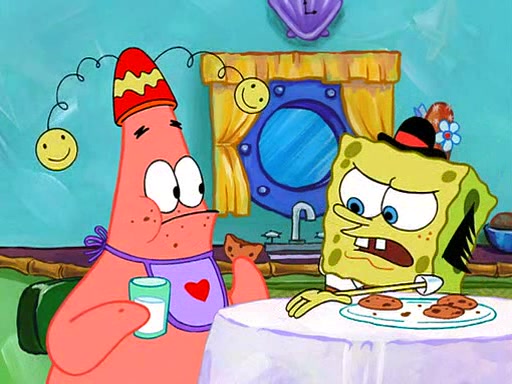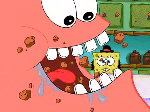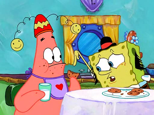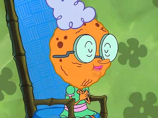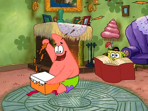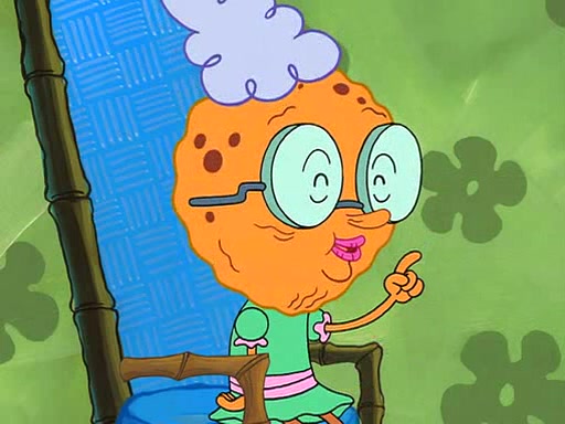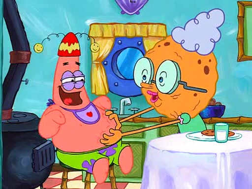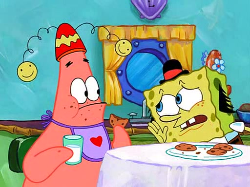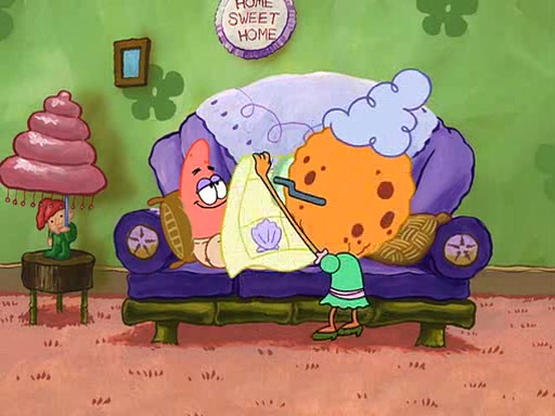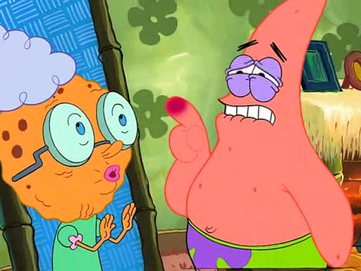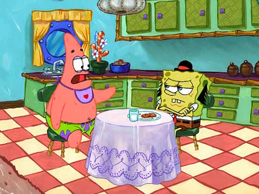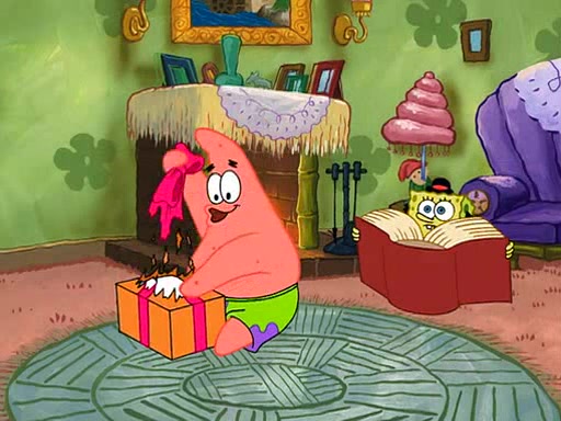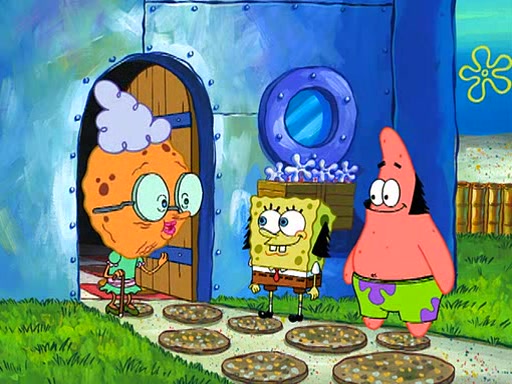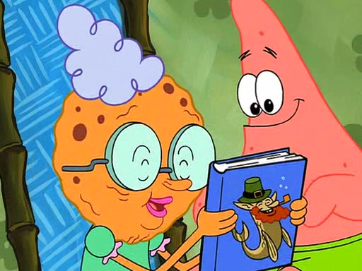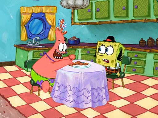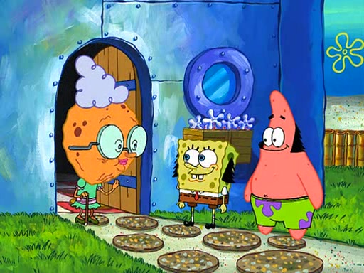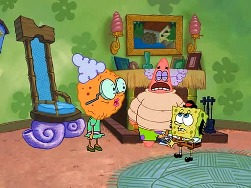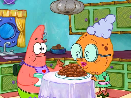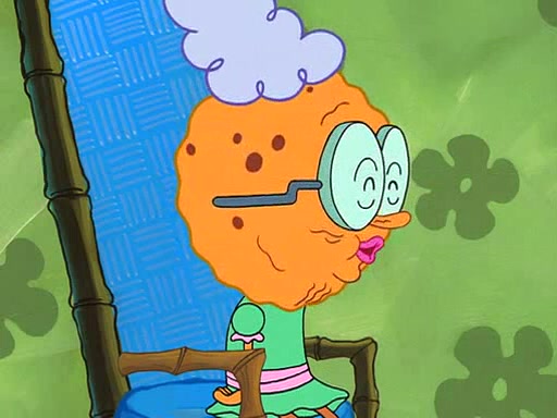 Grandma offers them cookies, which SpongeBob refuses, but Patrick gladly accepts. Patrick begins acting like a baby and when SpongeBob confronts him, he says that being a "grown-up" is boring and that he likes being a baby. SpongeBob attempts to eat a cookie, but Grandma stops him, instead giving him steamed coral from his grandma. Then she tells Patrick a baby story and gives SpongeBob a giant technical manual; later she gives Patrick a sweater "with love in every stitch," and gives SpongeBob unwrapped office supplies. Soon, the clock strikes 3:00 PM., time for SpongeBob to go to work.
