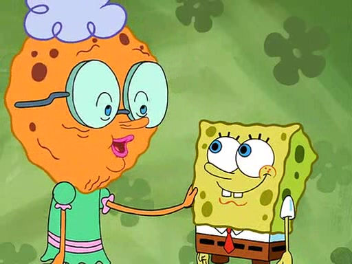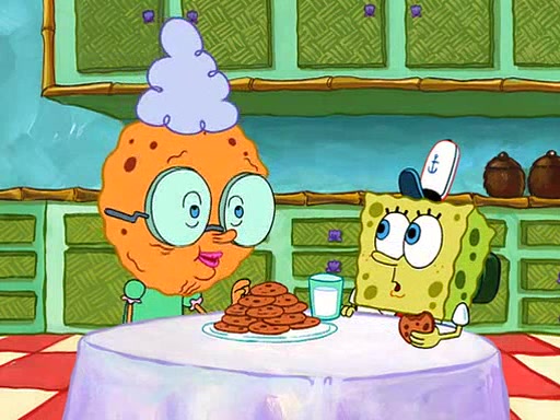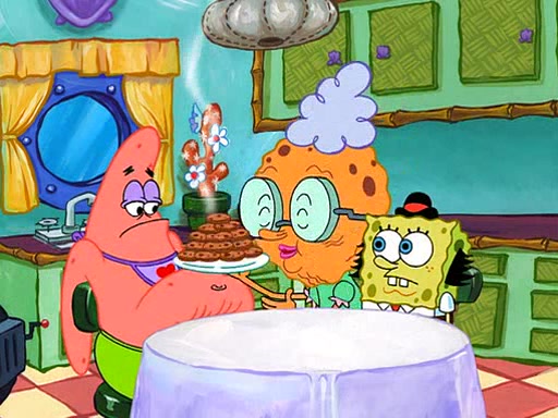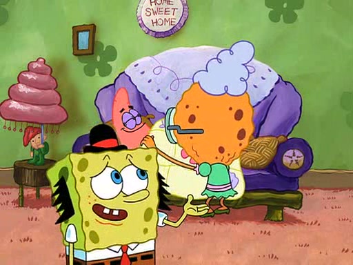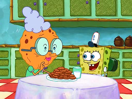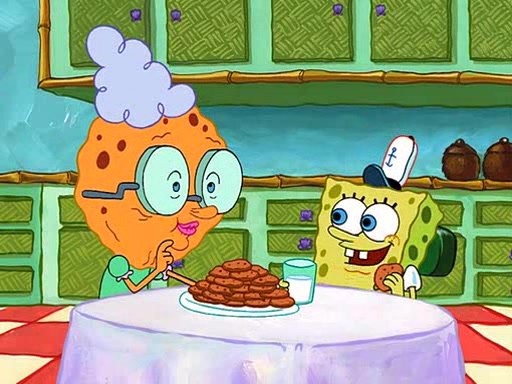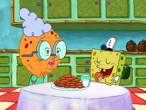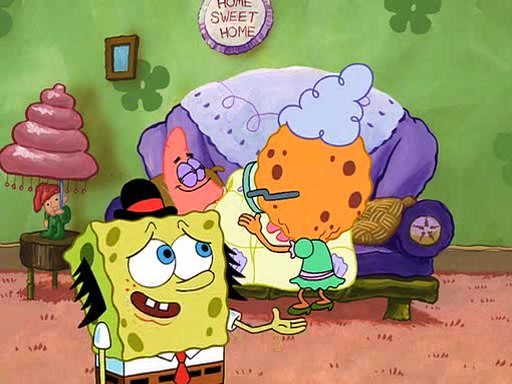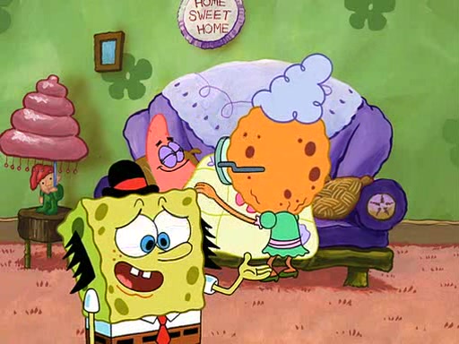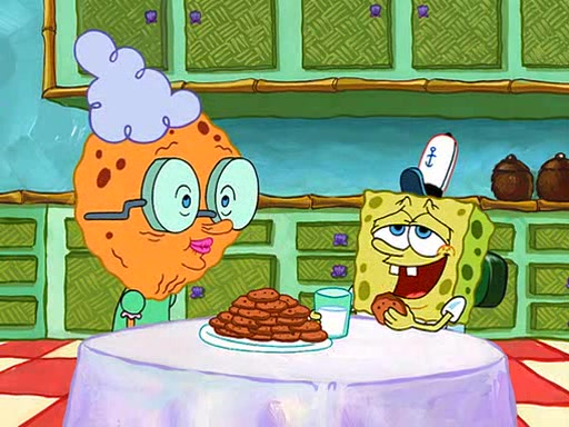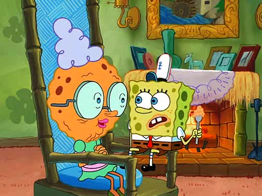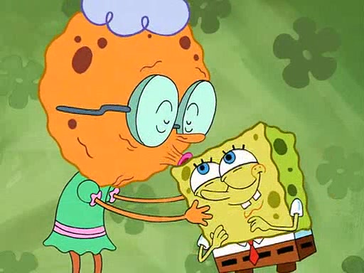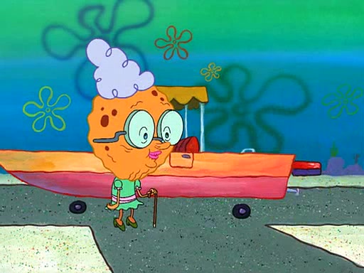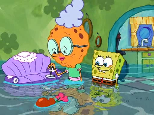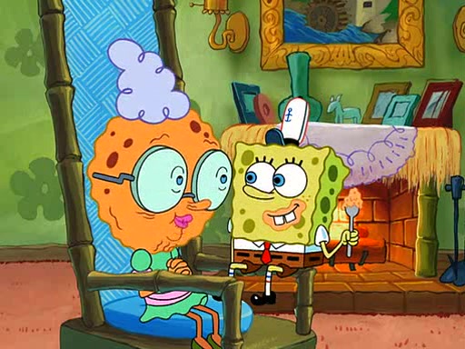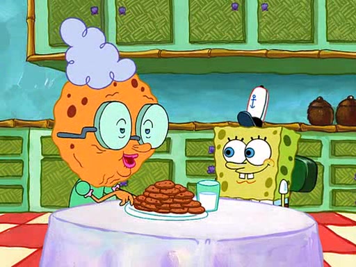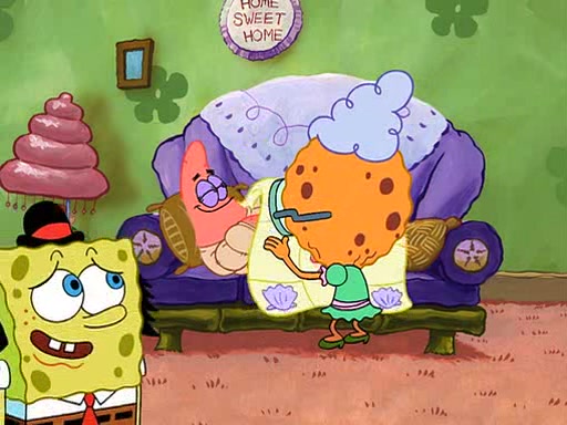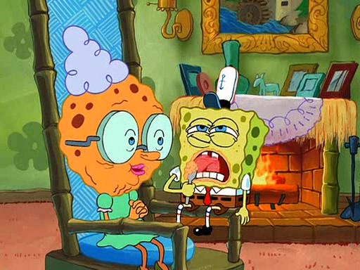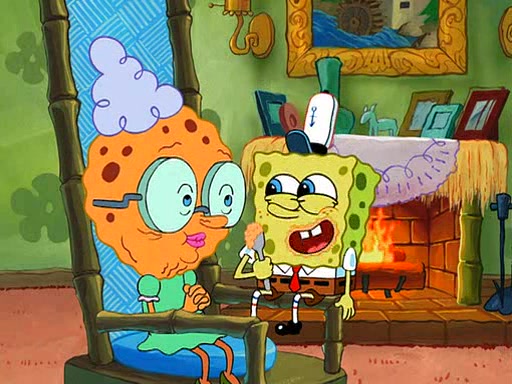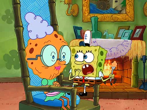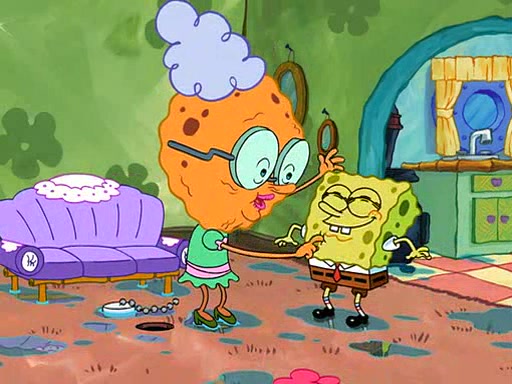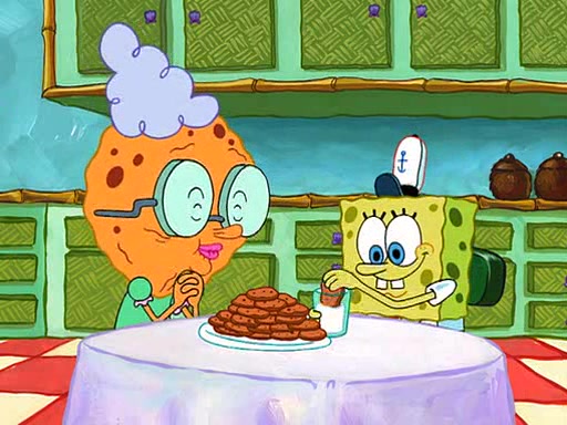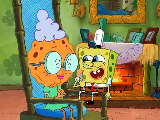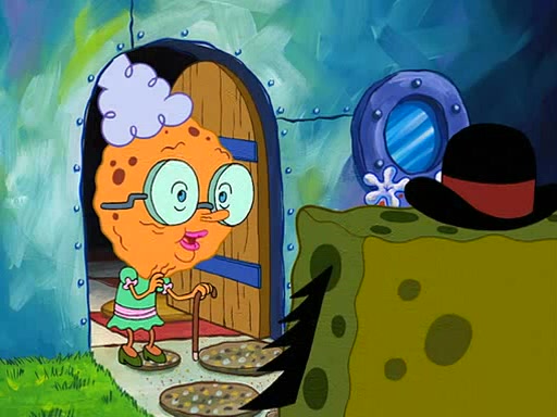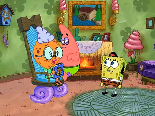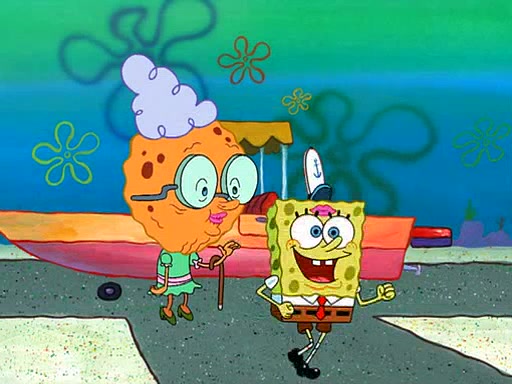 SpongeBob visits his Grandmother's house, where he acts and is treated like a small child, engaging in such babyish activities as eating cookies and being read stories. As soon as the clock strikes 3:00 PM, SpongeBob has to go back to work and is given a ride there by his Grandma. When they get there, she kisses him goodbye, leaving a kissy mark that is visible on his forehead.
