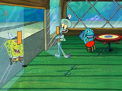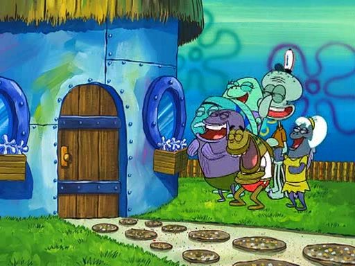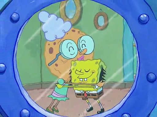 But Grandma calms him down and pulls a drain to remove the water. She tells SpongeBob that he doesn't have to be a baby to get her love, and that he will always be her baby boy no matter how grown up he gets. She gives him a cookie and hugs him. SpongeBob asks her to "not mention this to the guys down at the Krusty Krab," to which she replies "No problem." Then Grandma gives SpongeBob a hug. However, Squidward and the people from the Krusty Krab are standing outside the window and watching this, and start laughing as the episode ends.