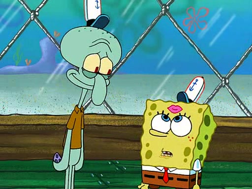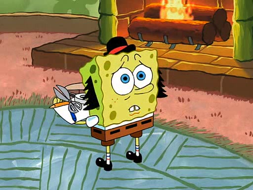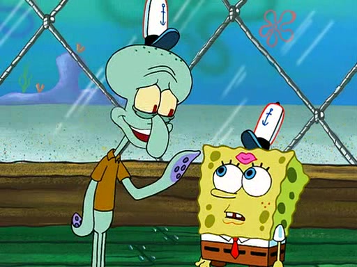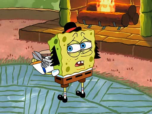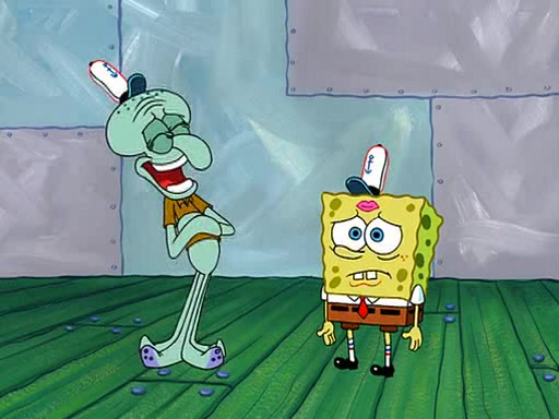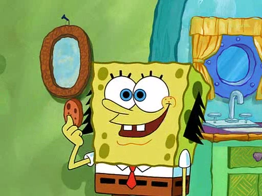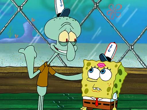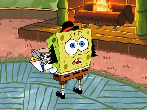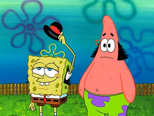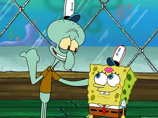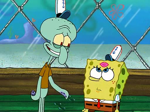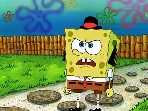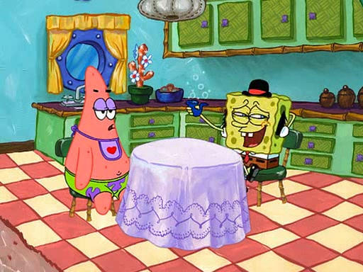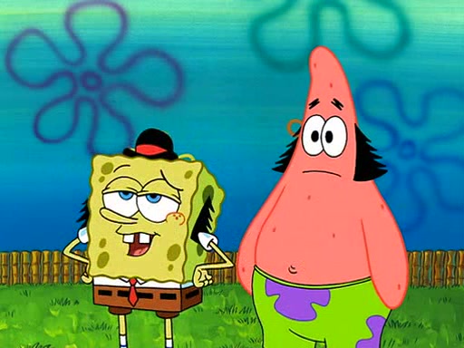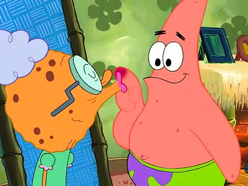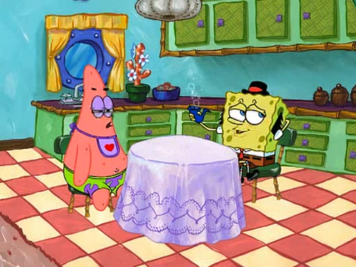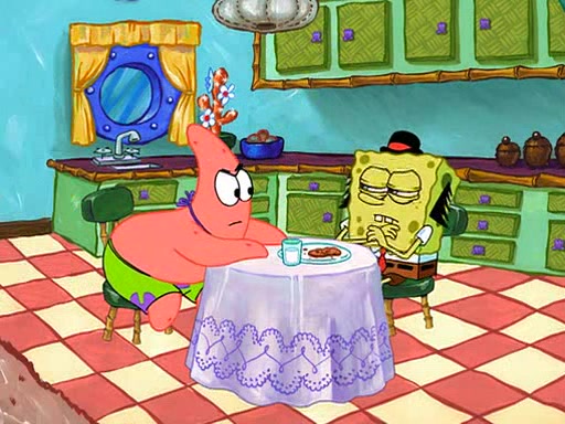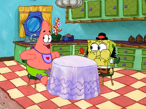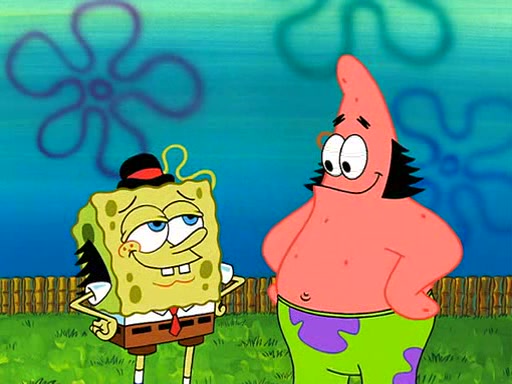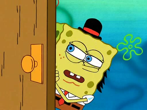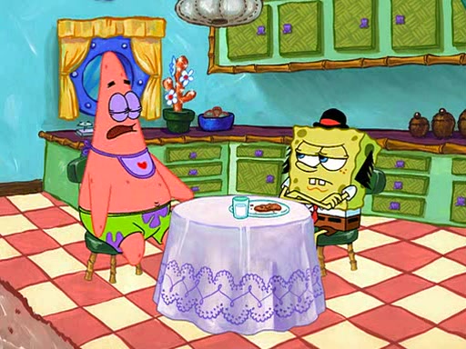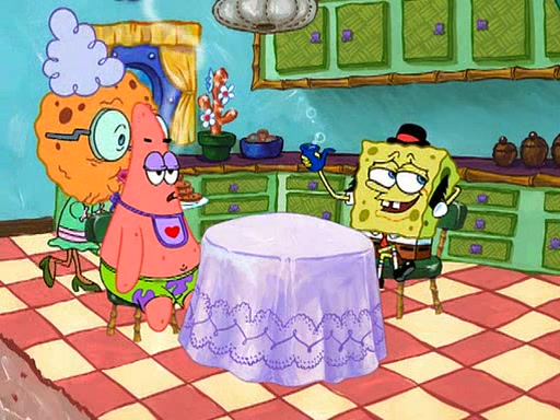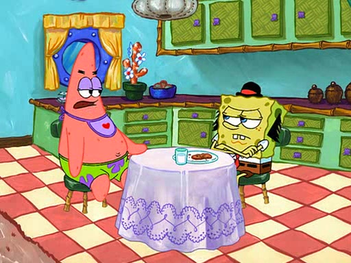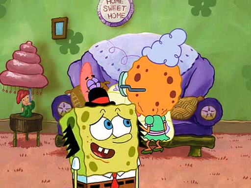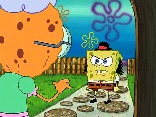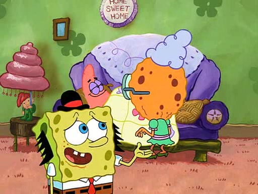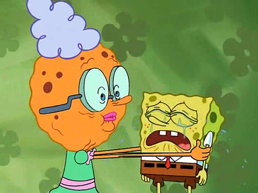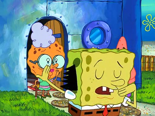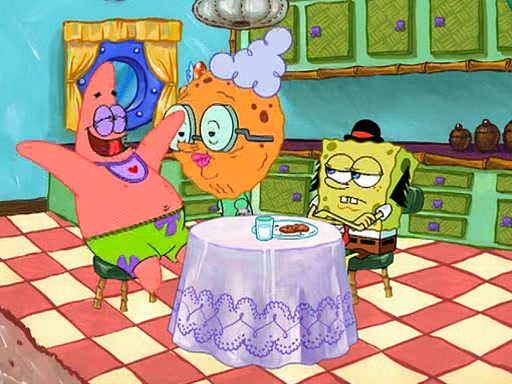 SpongeBob is then teased by everyone at the Krusty Krab, and runs home crying. At home, SpongeBob consoles Patrick about this, and Patrick tells him that he should show his Grandma that he is not a baby anymore by acting like an adult. SpongeBob and Patrick go to Grandma's house wearing fake sideburns, and when she answers the door and tries to kiss him, he refuses to be kissed, explaining to her that he is an adult now.