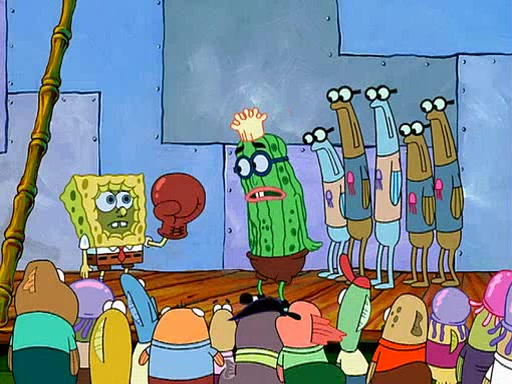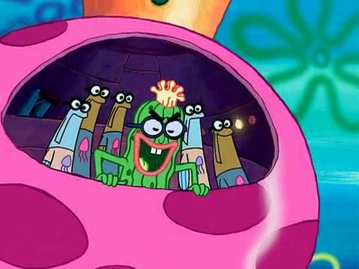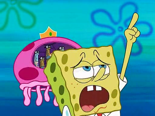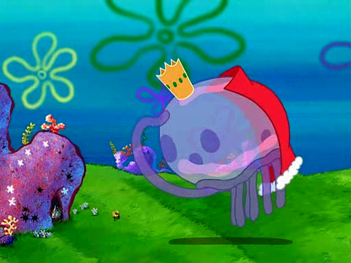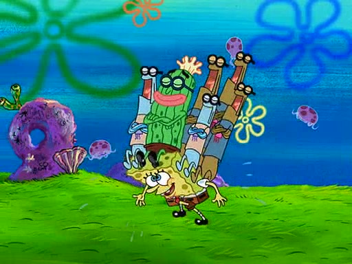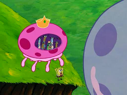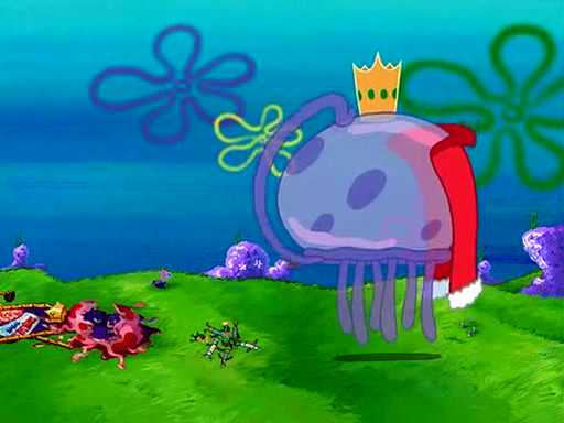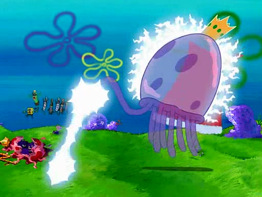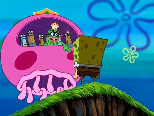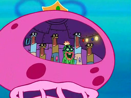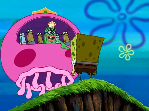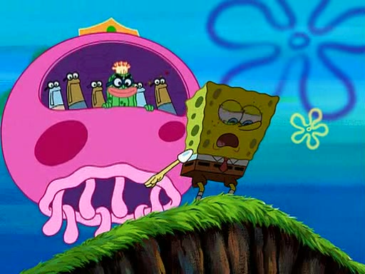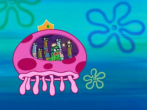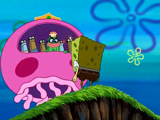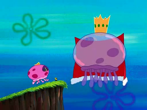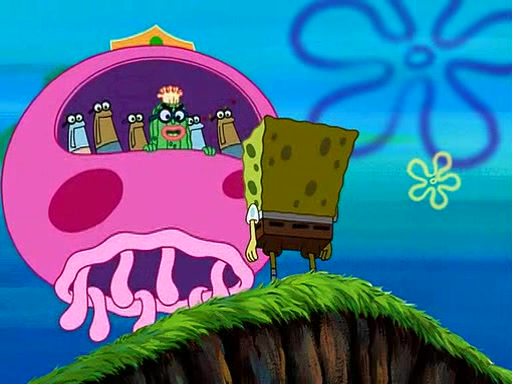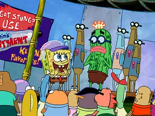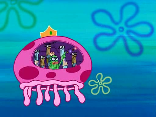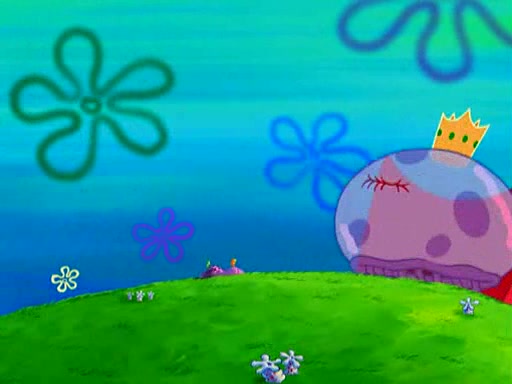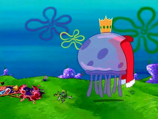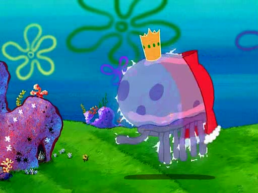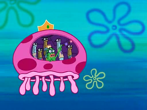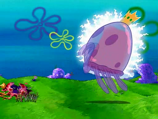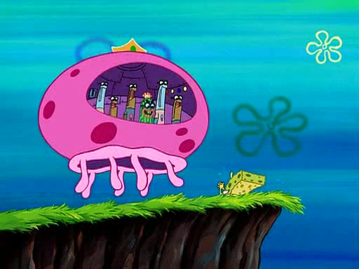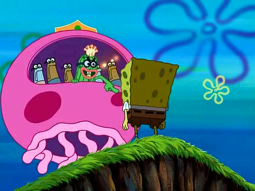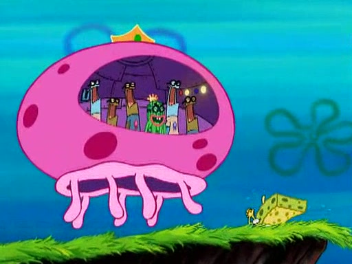 Four Hours Later, SpongeBob is very tired and prepared to give up. He tries to tell Kevin that the call isn't working, but finds that he is gone. Suddenly, a queen jellyfish appears above SpongeBob and begins chasing him. Eventually, the queen corners him at the edge of a cliff, where it is revealed that it is a robot controlled by Kevin and the anchovies, who reveals his true intentions to SpongeBob and shows him several other people at the bottom of the pit below, who were his former "biggest fan"s. Before he can force SpongeBob off the cliff, however, King Jellyfish appears and falls in love with the queen jellyfish. He tries to kiss her, and they all start running away. Soon, the queen jellyfish crashes into a billboard, destroying it. When King Jellyfish sees this, he becomes angry and chases down SpongeBob, Kevin, and the anchovies, eventually cornering them in a cave. Kevin panics, and admits that he has no actual expertise in dealing with jellyfish (because he was just in it for the fashion) . SpongeBob is the only person brave enough to confront him, and blows a giant pie bubble, which King Jellyfish takes and leaves. Kevin asks how was he able to do it. SpongeBob simply answers "Everyone loves pie!". The anchovies congratulate SpongeBob for saving them all, but Kevin says that SpongeBob is still not in the club because he did not catch a queen jellyfish. The anchovies think that SpongeBob is a more worthy leader than Kevin, and tear off his headcap, giving it to SpongeBob as a "crown".