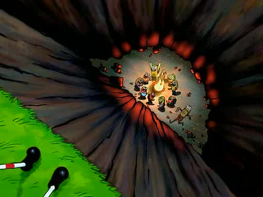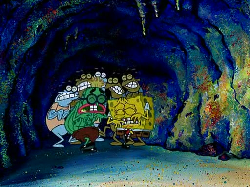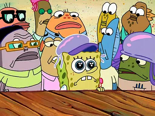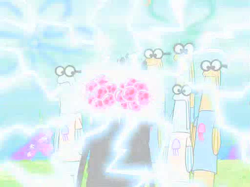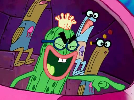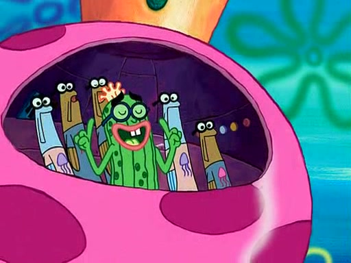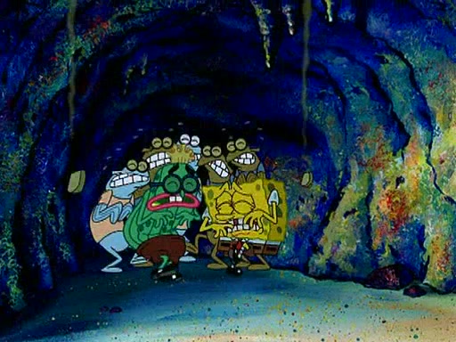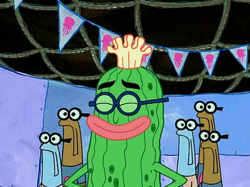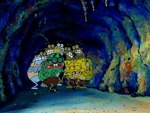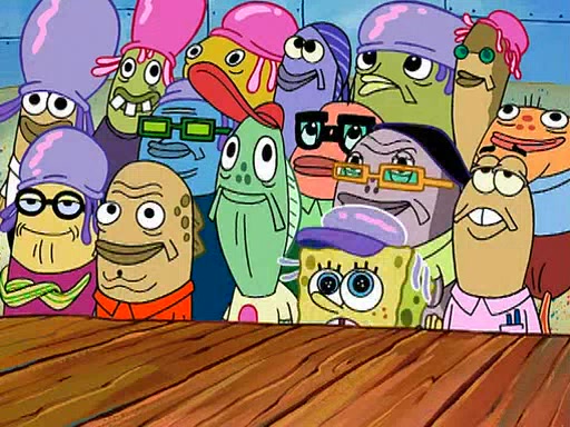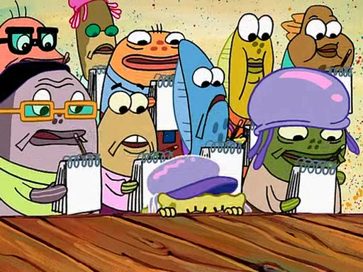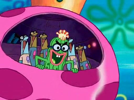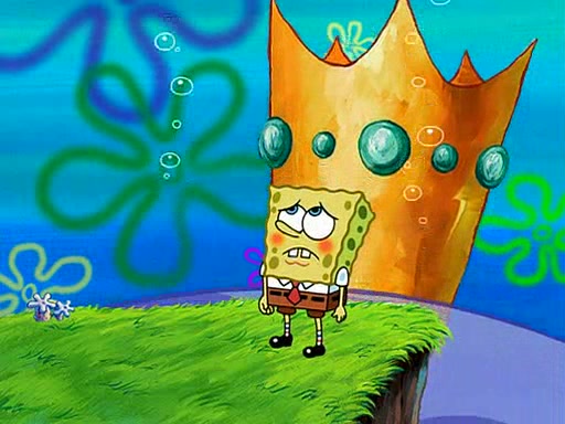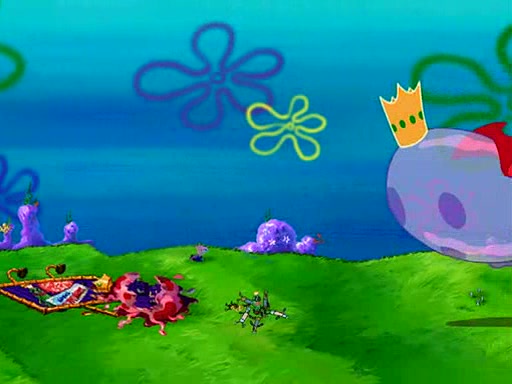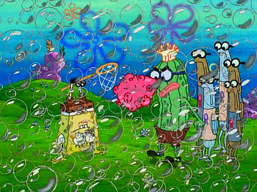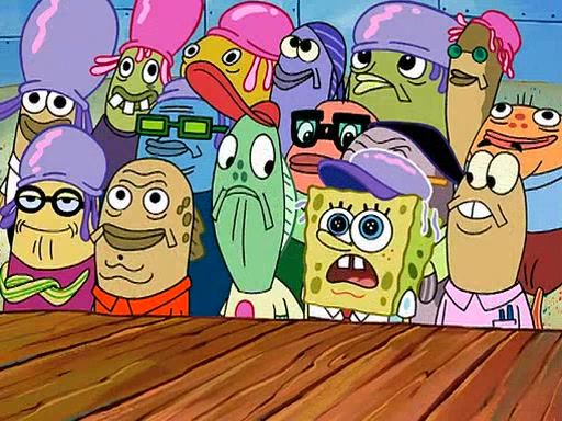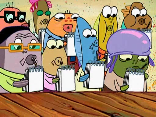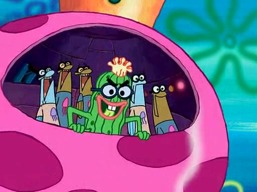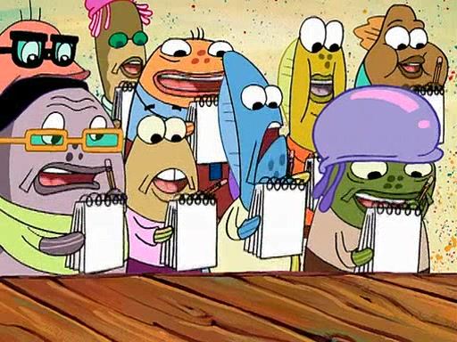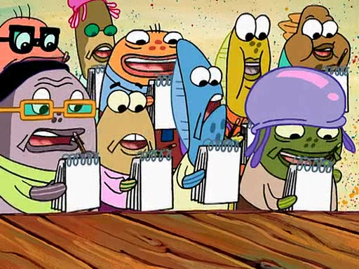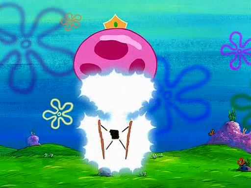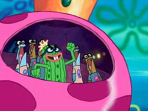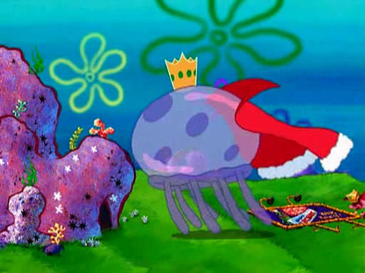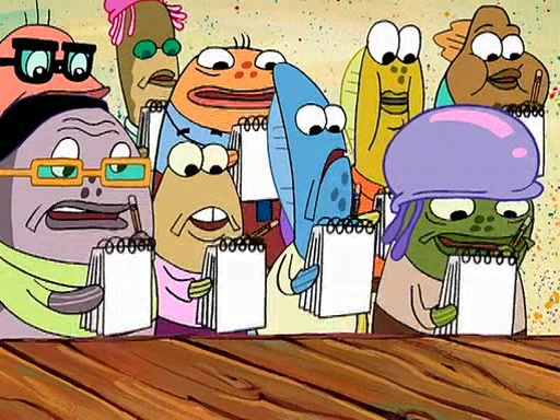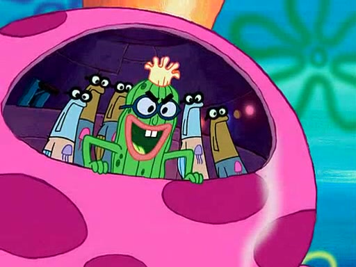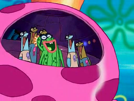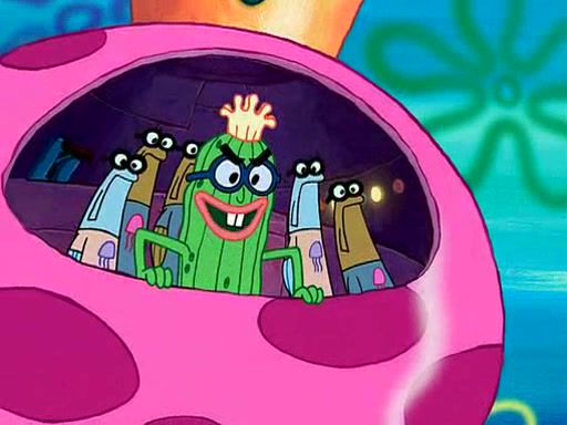Four Hours Later, SpongeBob is very tired and prepared to give up. He tries to tell Kevin that the call isn't working, but finds that he is gone. Suddenly, a queen jellyfish appears above SpongeBob and begins chasing him. Eventually, the queen corners him at the edge of a cliff, where it is revealed that it is a robot controlled by Kevin and the anchovies, who reveals his true intentions to SpongeBob and shows him several other people at the bottom of the pit below, who were his former "biggest fan"s. Before he can force SpongeBob off the cliff, however, King Jellyfish appears and falls in love with the queen jellyfish. He tries to kiss her, and they all start running away. Soon, the queen jellyfish crashes into a billboard, destroying it. When King Jellyfish sees this, he becomes angry and chases down SpongeBob, Kevin, and the anchovies, eventually cornering them in a cave. Kevin panics, and admits that he has no actual expertise in dealing with jellyfish (because he was just in it for the fashion) . SpongeBob is the only person brave enough to confront him, and blows a giant pie bubble, which King Jellyfish takes and leaves. Kevin asks how was he able to do it. SpongeBob simply answers "Everyone loves pie!". The anchovies congratulate SpongeBob for saving them all, but Kevin says that SpongeBob is still not in the club because he did not catch a queen jellyfish. The anchovies think that SpongeBob is a more worthy leader than Kevin, and tear off his headcap, giving it to SpongeBob as a "crown".