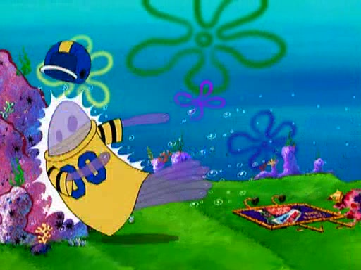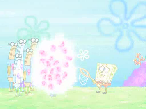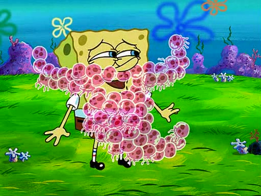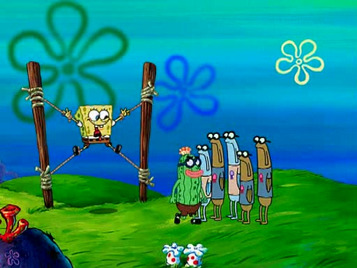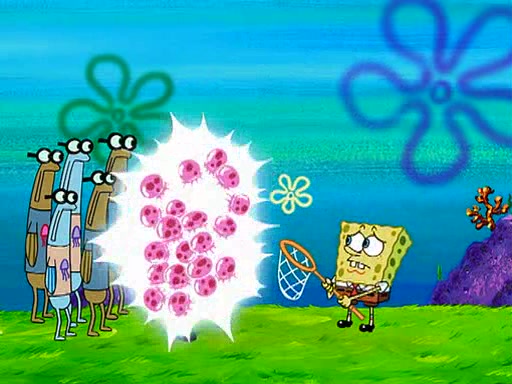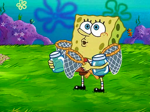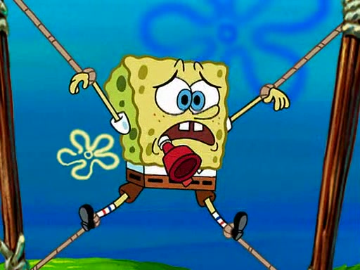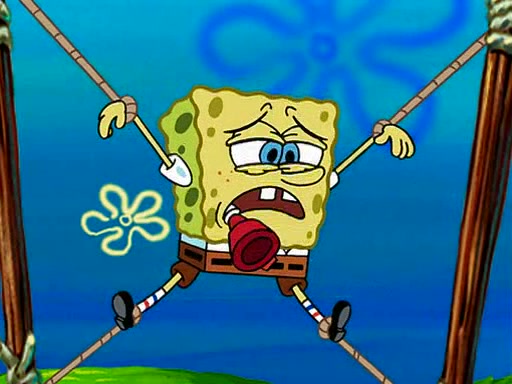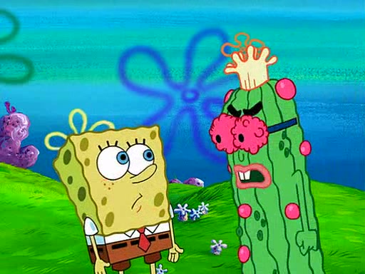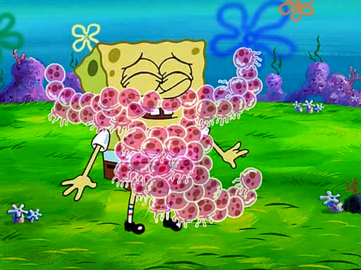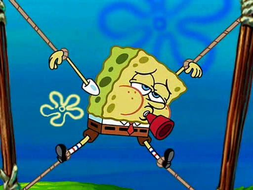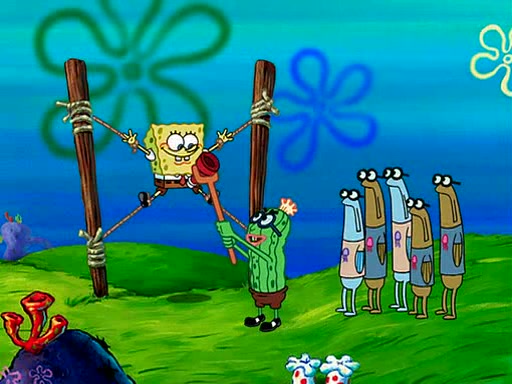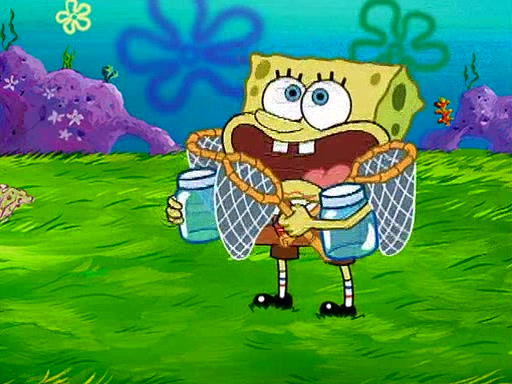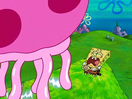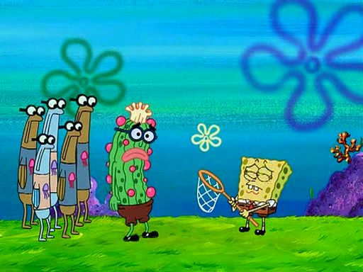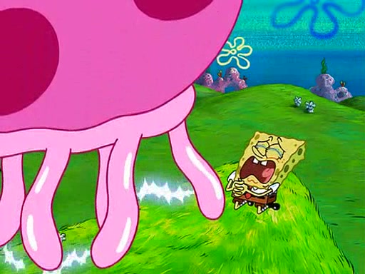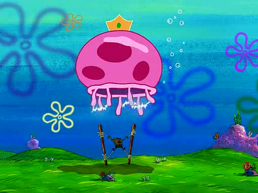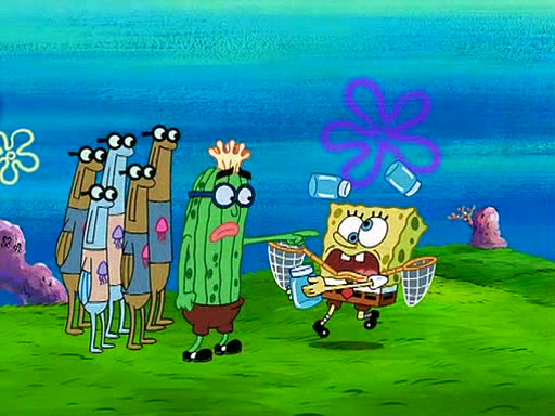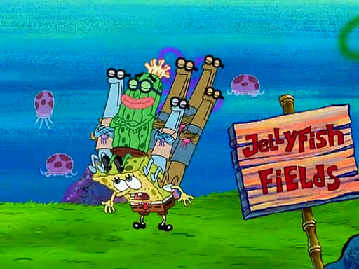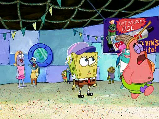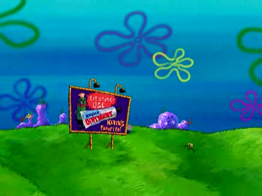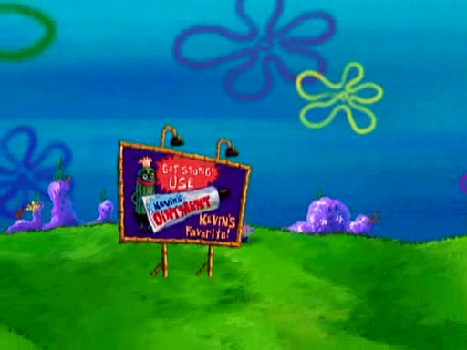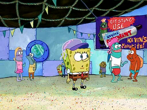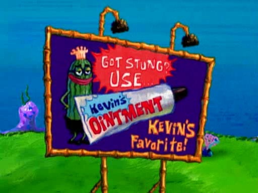 At Jellyfish Fields, Kevin's first test for SpongeBob is to catch a jellyfish, which immediately flies into SpongeBob's net. Kevin smacks it out and it stings him. He says to catch two jellyfish, and two jellyfish fly into SpongeBob's net. Kevin then says 20 jellyfish, and then 18 jellyfish fly into SpongeBob's net. Angry, Kevin kicks the net, making all the jellyfish sting him. Kevin continues to give SpongeBob many more "tests," all of which he passes effortlessly, with Kevin getting stung each time as a result. Eventually, Kevin was now covered in stings and frustrated at SpongeBob. He tells him that the final test is to catch a queen jellyfish. They tie him to a post, give him a "queen jellyfish call," which produces the sound "loser," and leave him there.