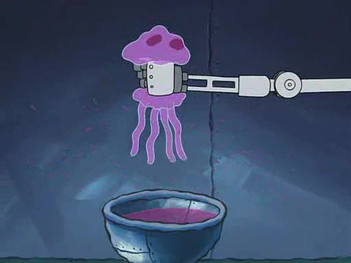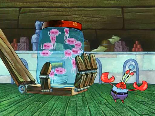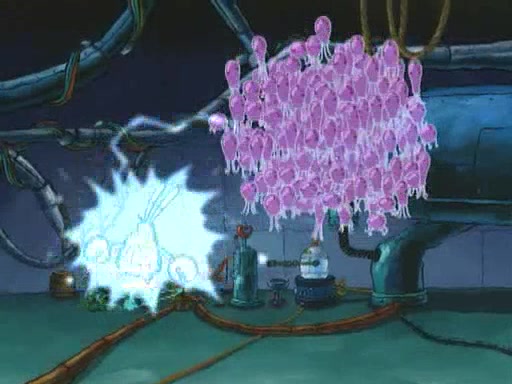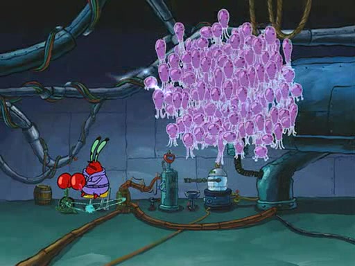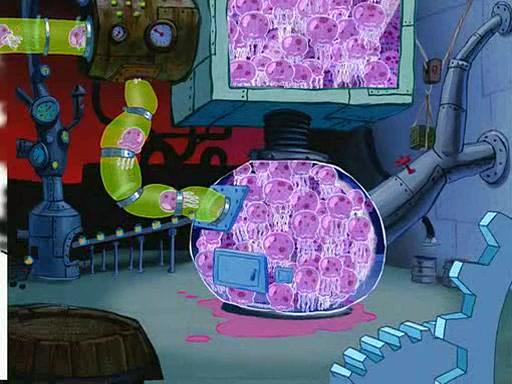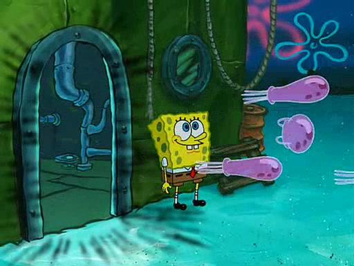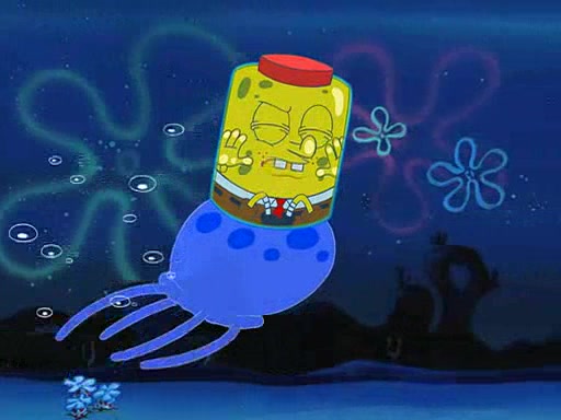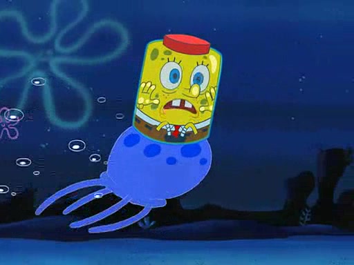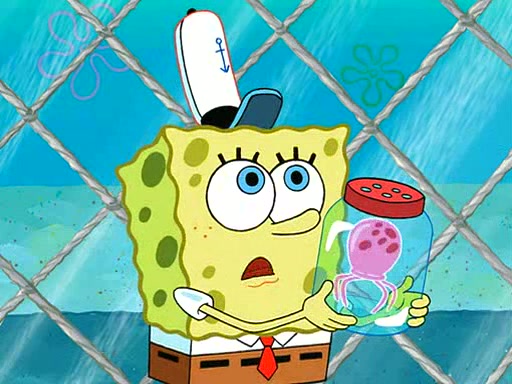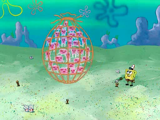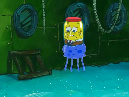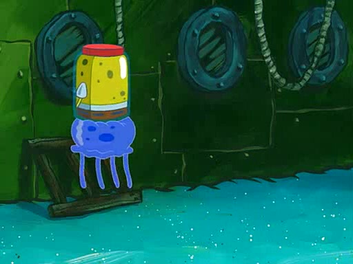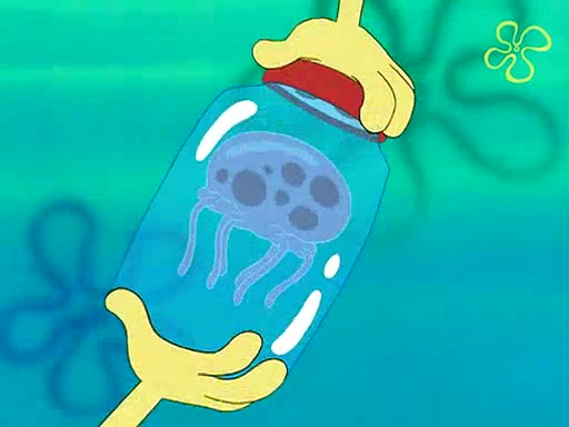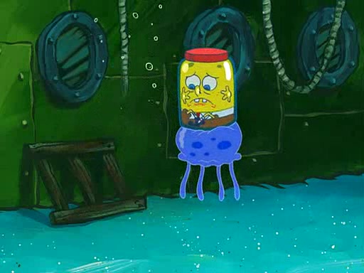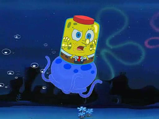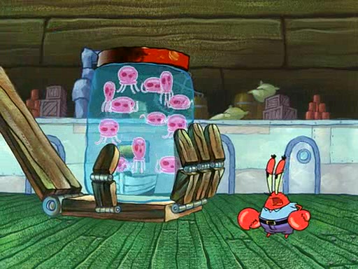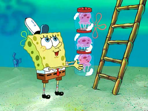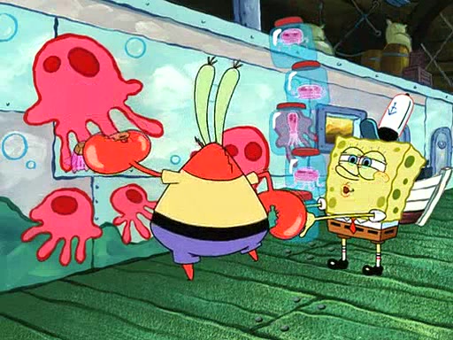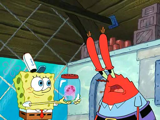 After several close encounters and strange events, No Name captures him in a jar much in the way that SpongeBob catches jellyfish. No Name then takes SpongeBob to a secret factory farm, where he discovers that Mr. Krabs is cruelly treating the jellyfish to increase profit.