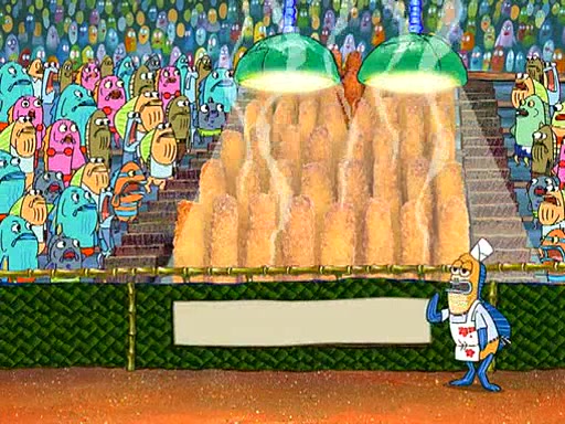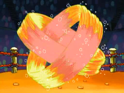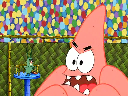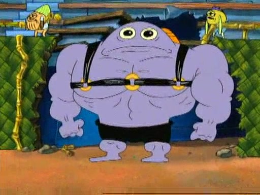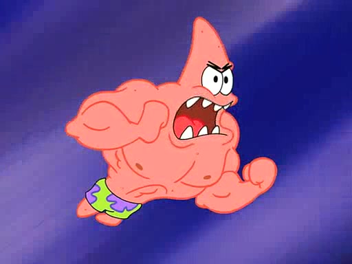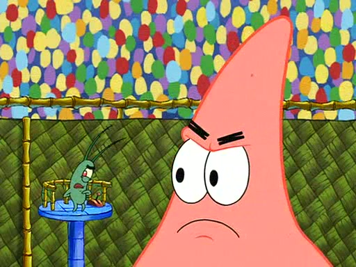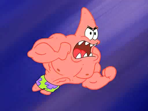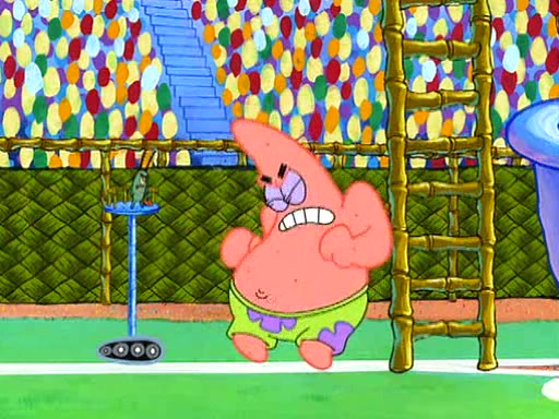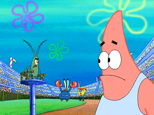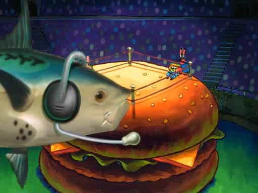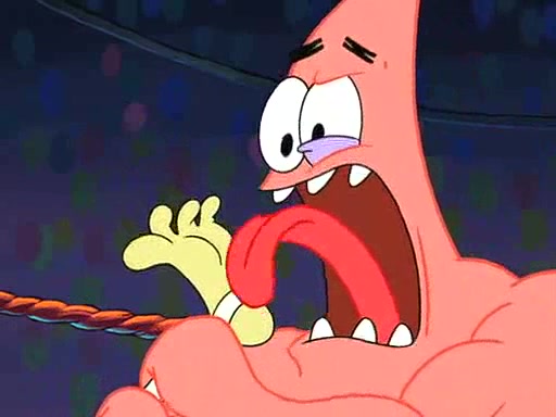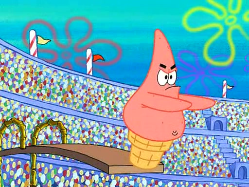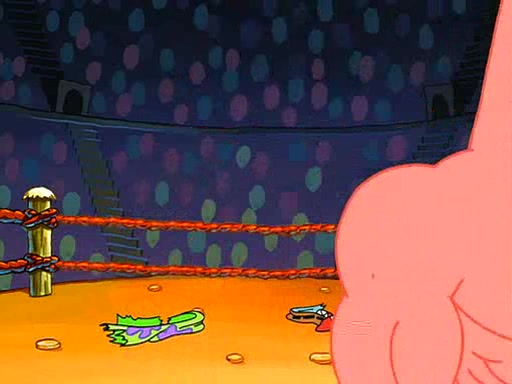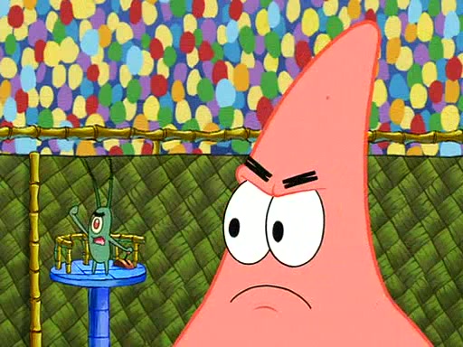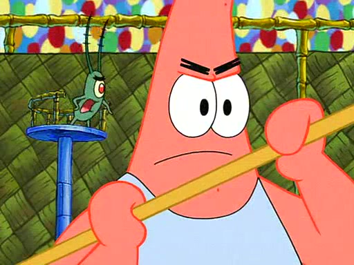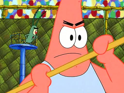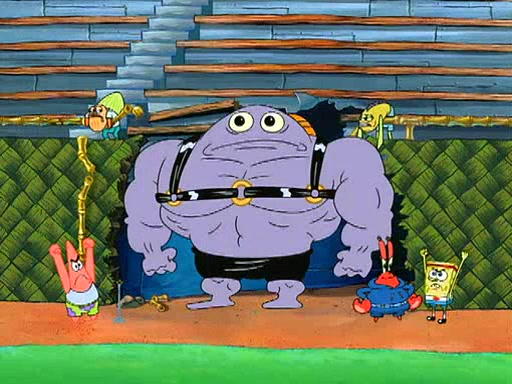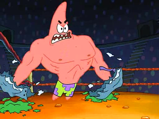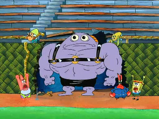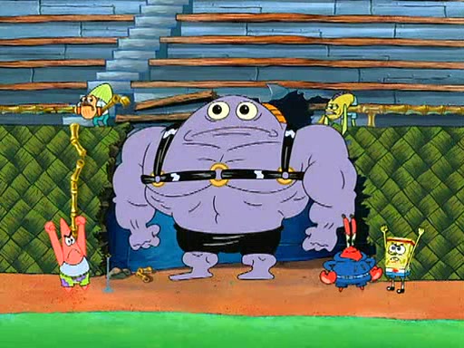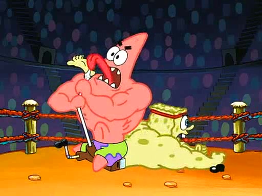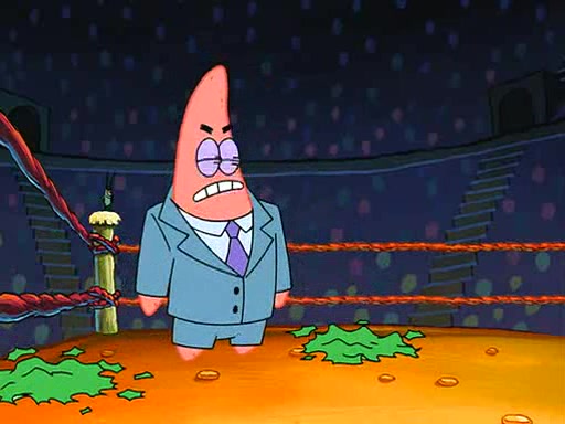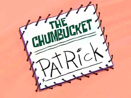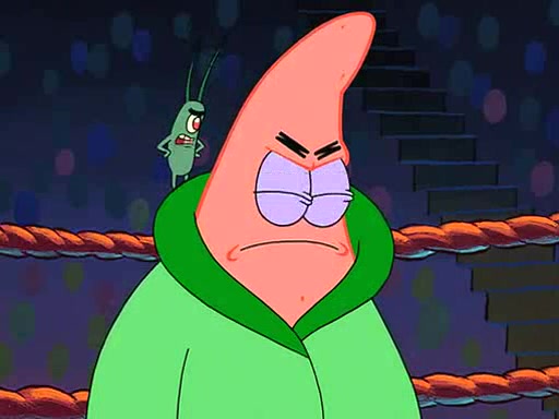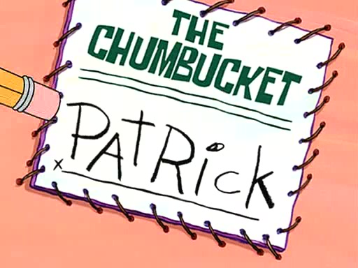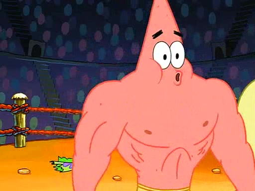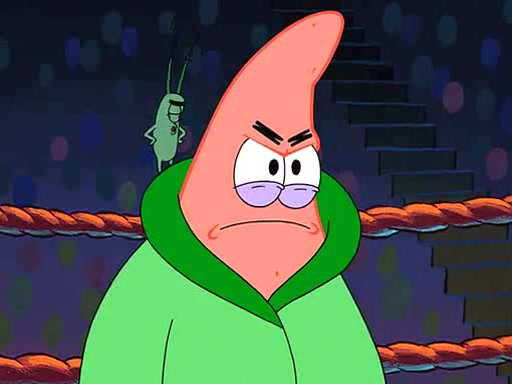 Plankton then appears and introduces his competitor, who at first appears to be a terrifyingly huge and muscular fish which the audience is even scared of, but he is only carrying the real contestant strapped on his back, who is none other than Patrick Star himself, who got a job at the Chum Bucket in order to compete, only having worked there for 5 minutes.