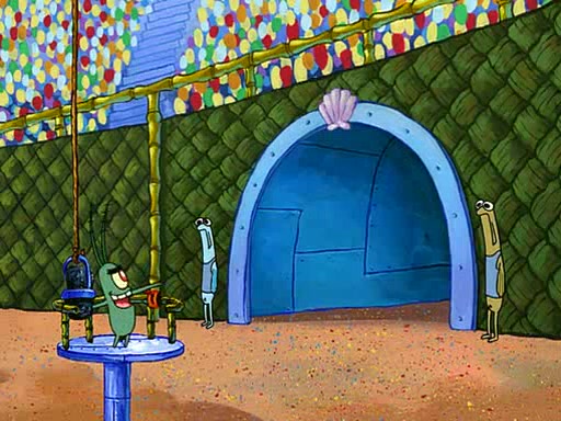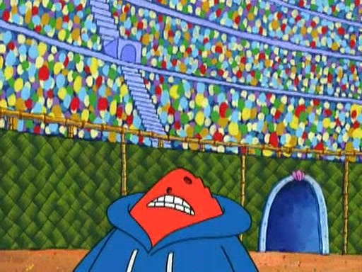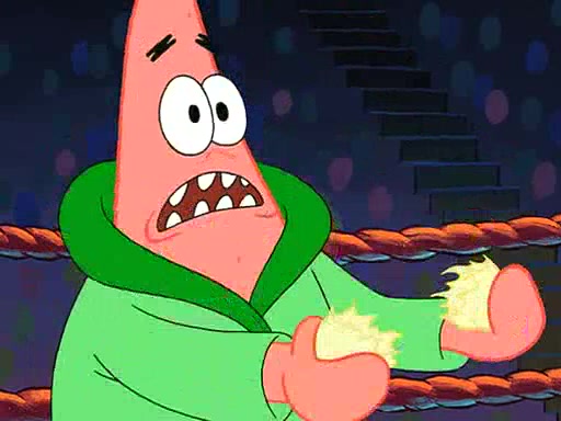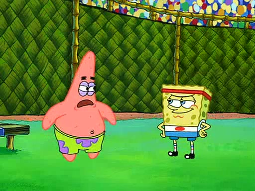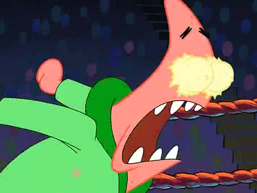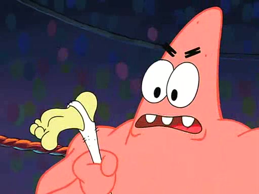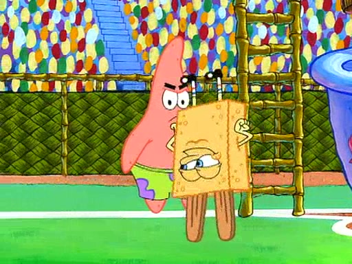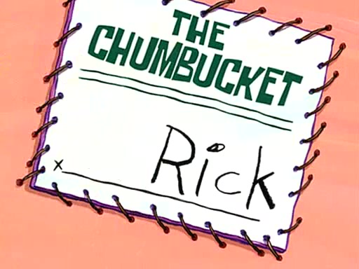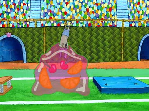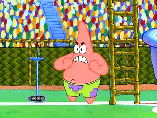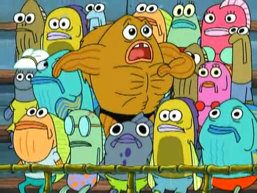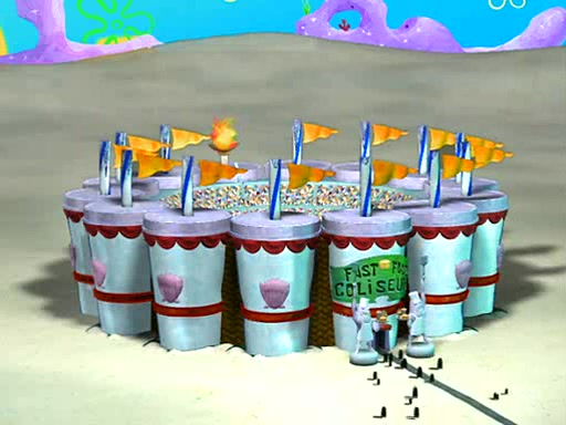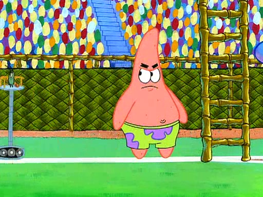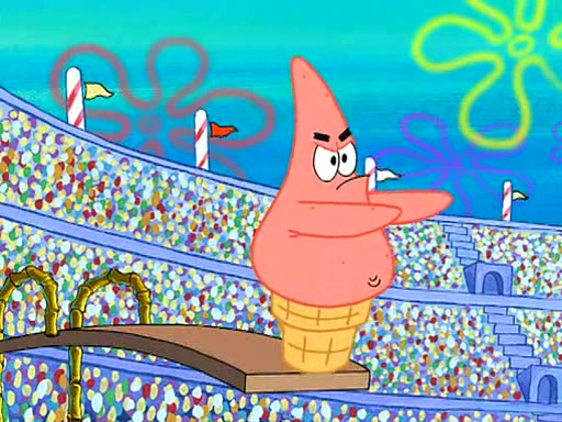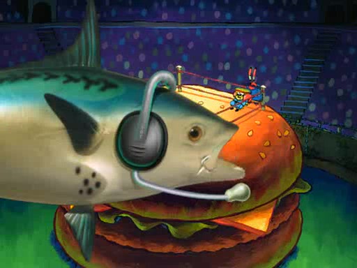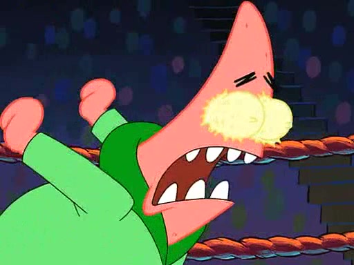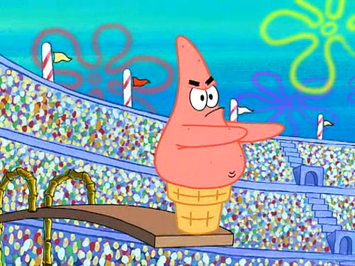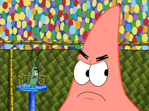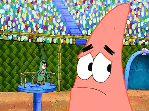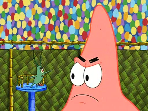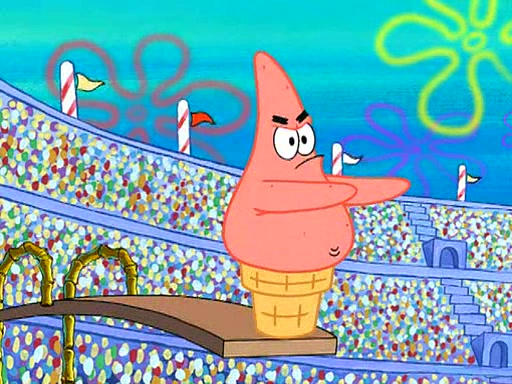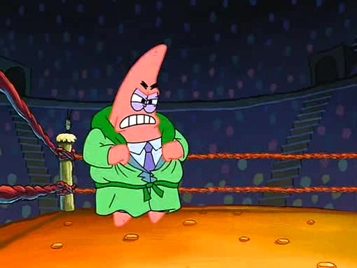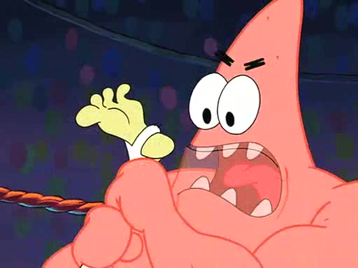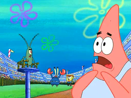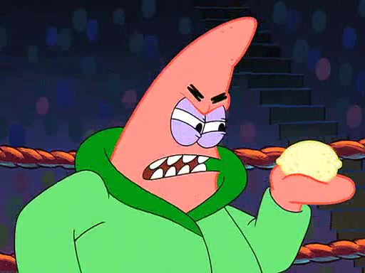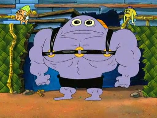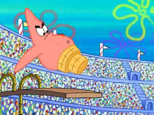 Plankton then appears and introduces his competitor, who at first appears to be a terrifyingly huge and muscular fish which the audience is even scared of, but he is only carrying the real contestant strapped on his back, who is none other than Patrick Star himself, who got a job at the Chum Bucket in order to compete, only having worked there for 5 minutes.