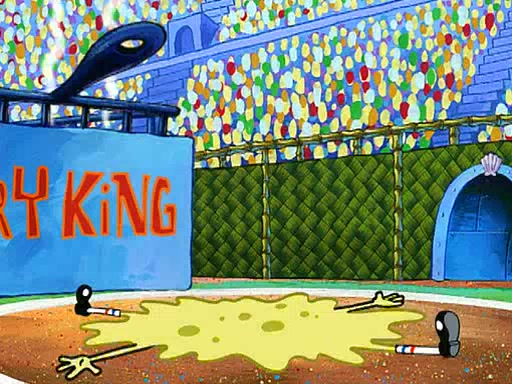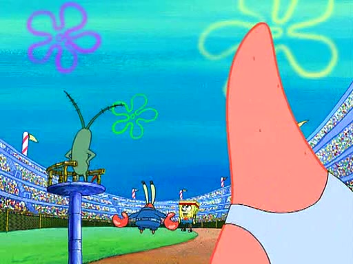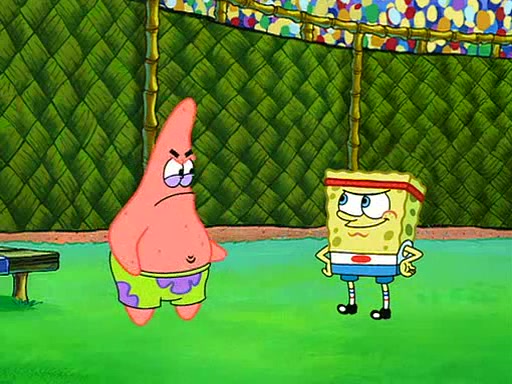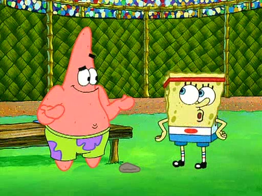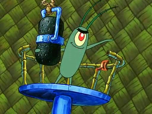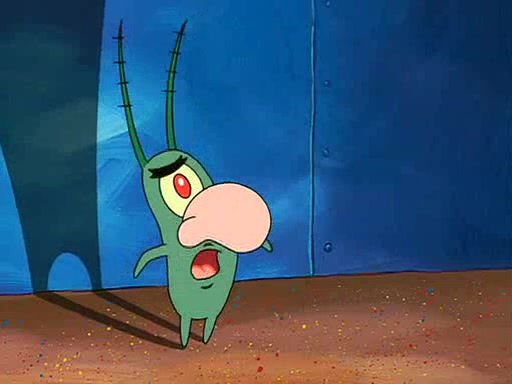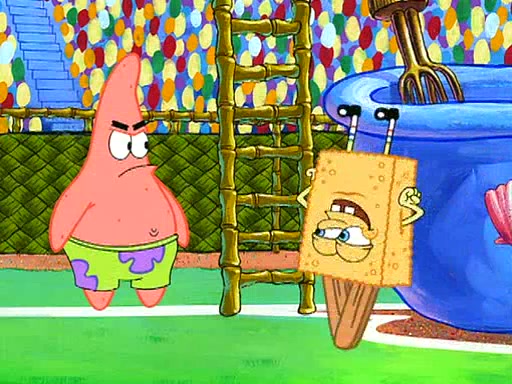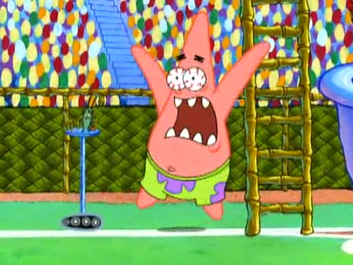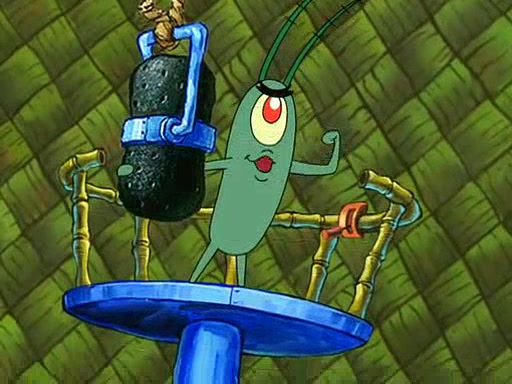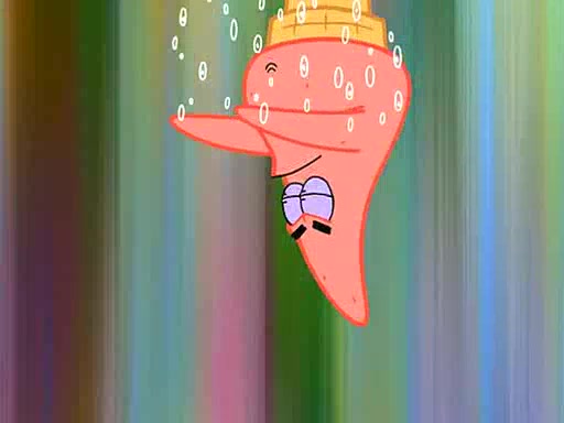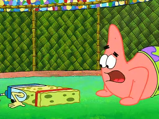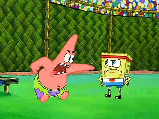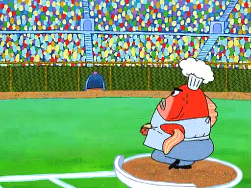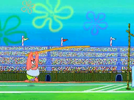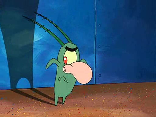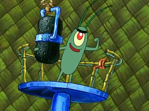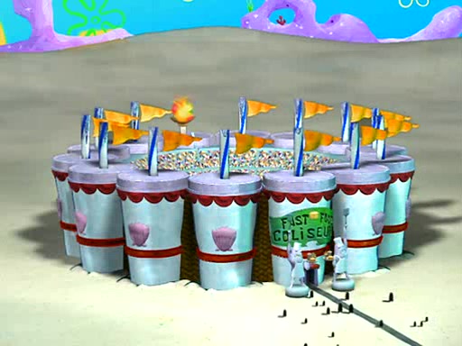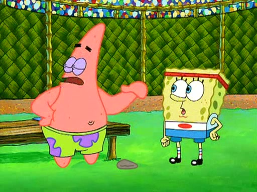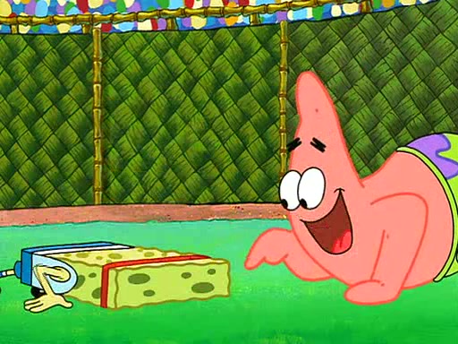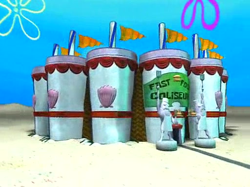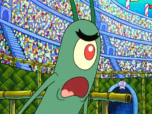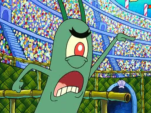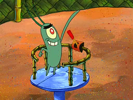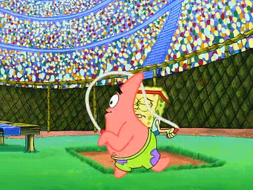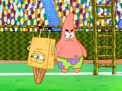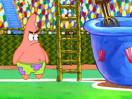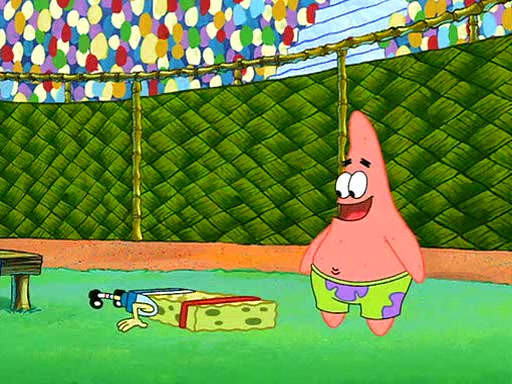 Plankton then appears and introduces his competitor, who at first appears to be a terrifyingly huge and muscular fish which the audience is even scared of, but he is only carrying the real contestant strapped on his back, who is none other than Patrick Star himself, who got a job at the Chum Bucket in order to compete, only having worked there for 5 minutes.