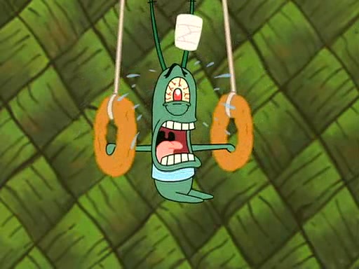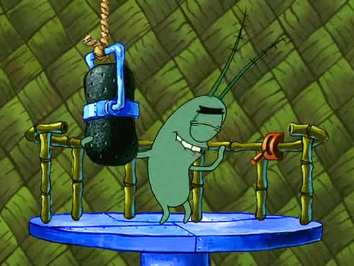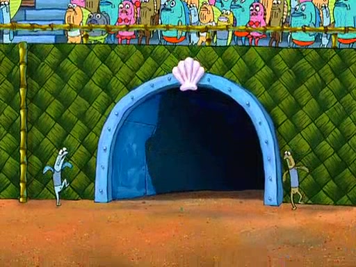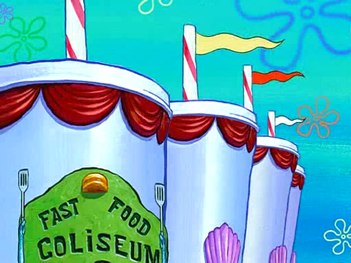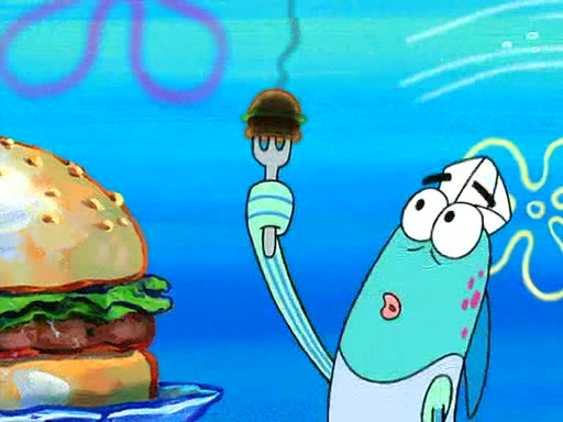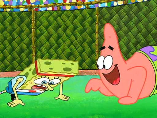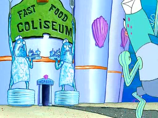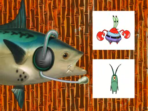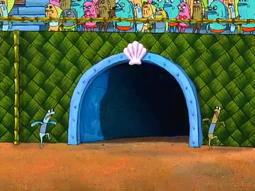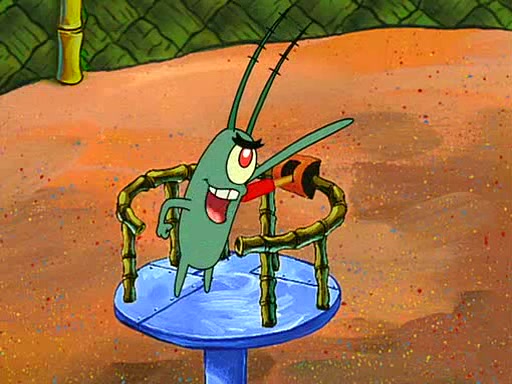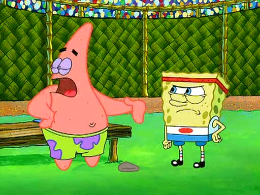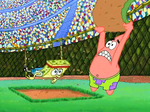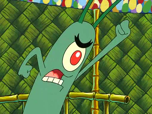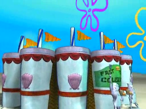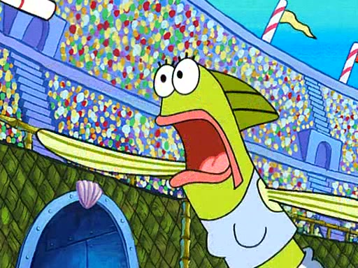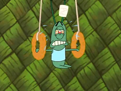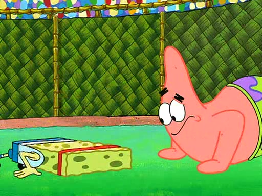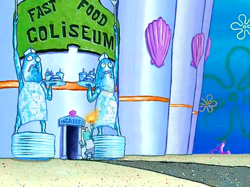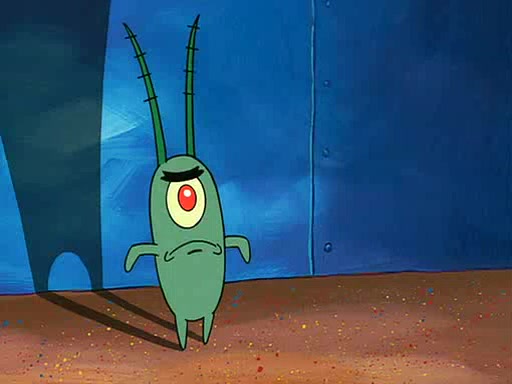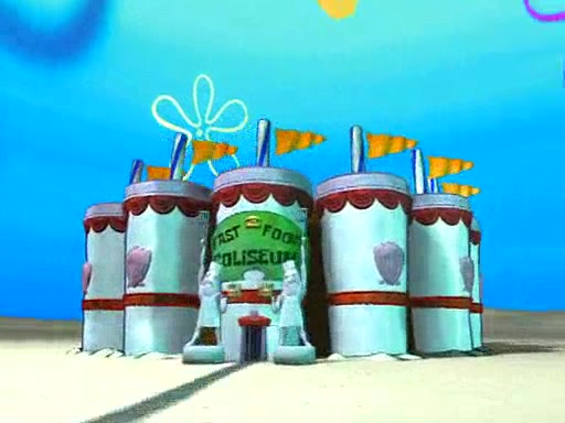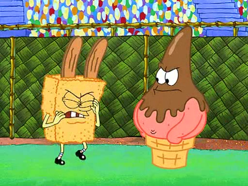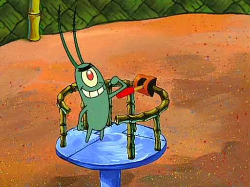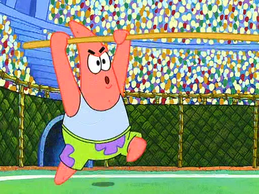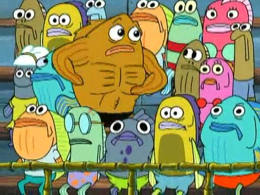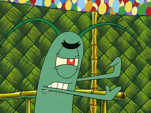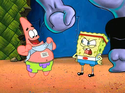 Plankton then appears and introduces his competitor, who at first appears to be a terrifyingly huge and muscular fish which the audience is even scared of, but he is only carrying the real contestant strapped on his back, who is none other than Patrick Star himself, who got a job at the Chum Bucket in order to compete, only having worked there for 5 minutes.