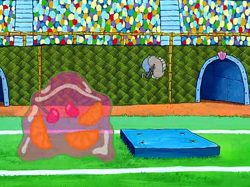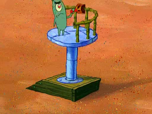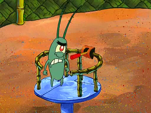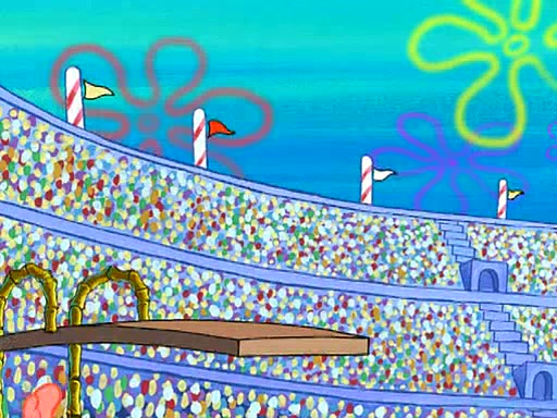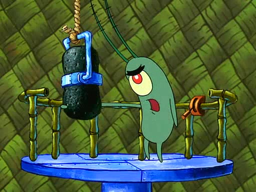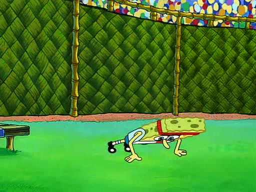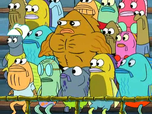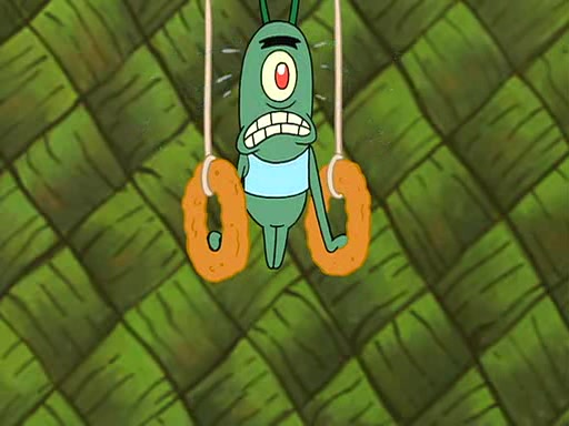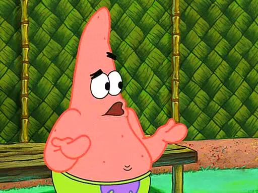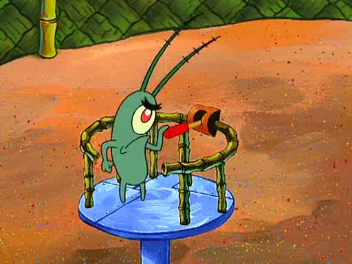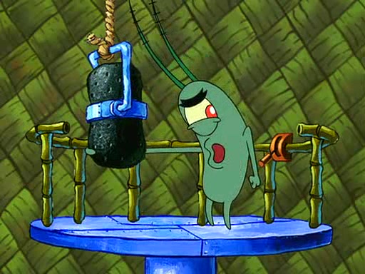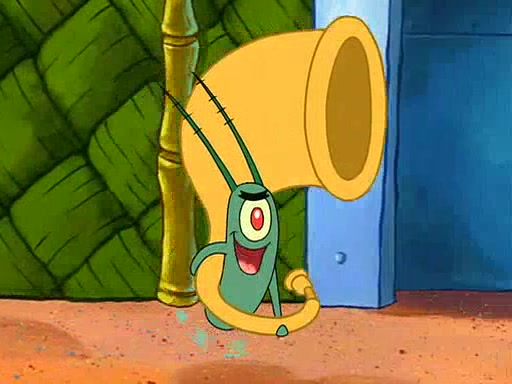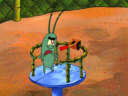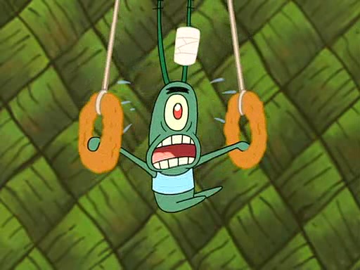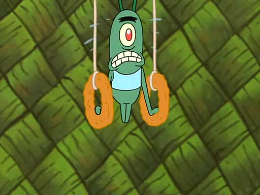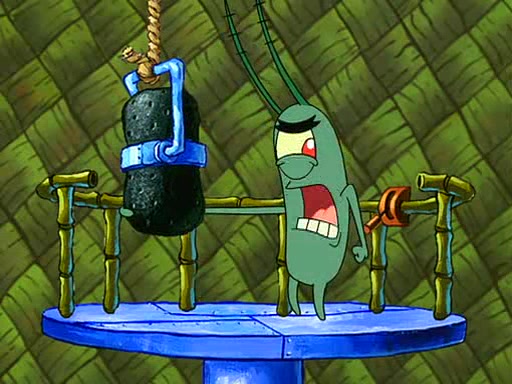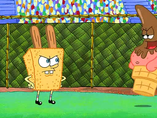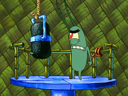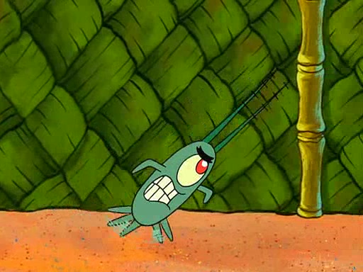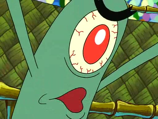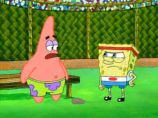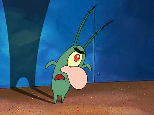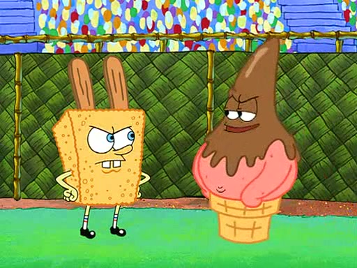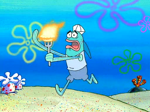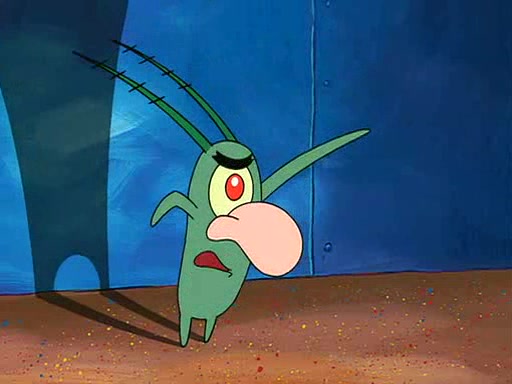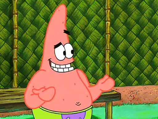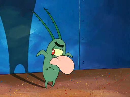 Plankton then appears and introduces his competitor, who at first appears to be a terrifyingly huge and muscular fish which the audience is even scared of, but he is only carrying the real contestant strapped on his back, who is none other than Patrick Star himself, who got a job at the Chum Bucket in order to compete, only having worked there for 5 minutes.