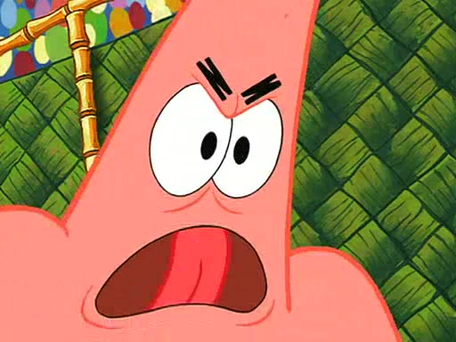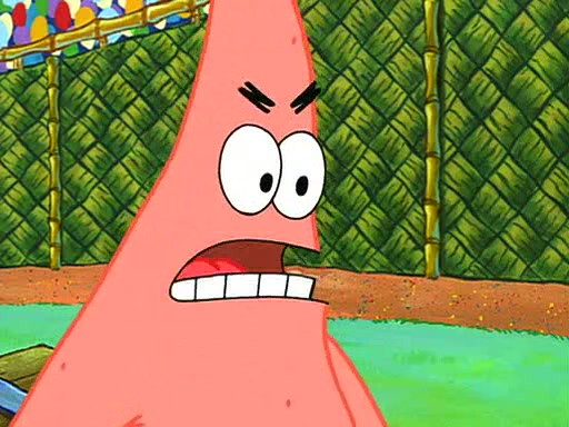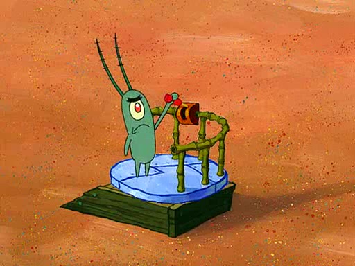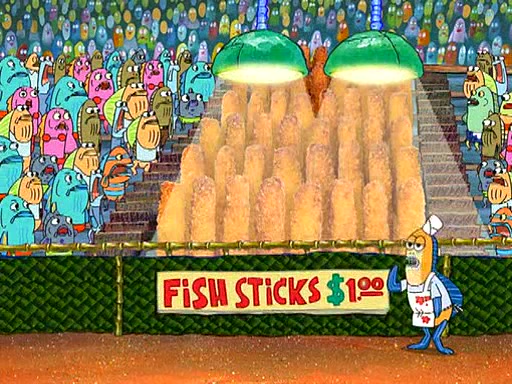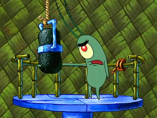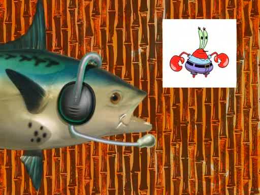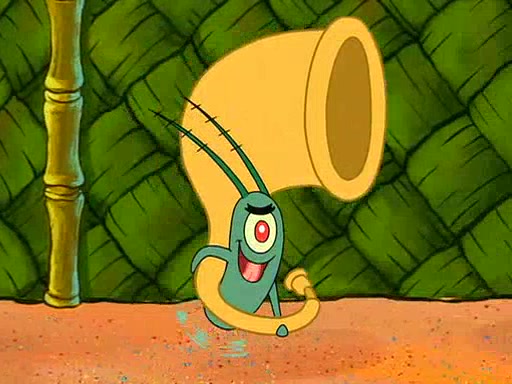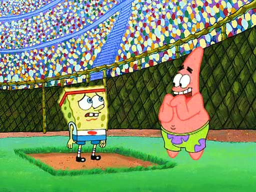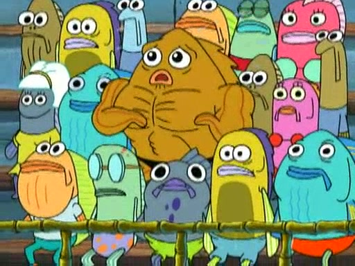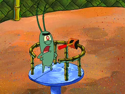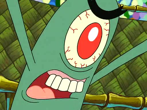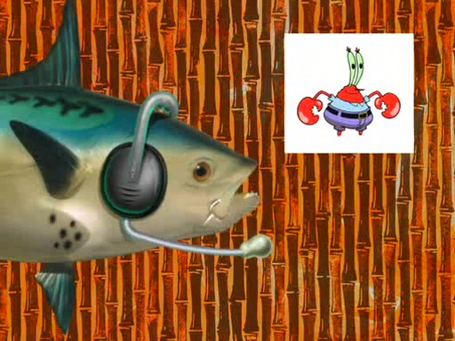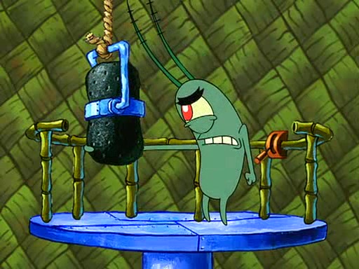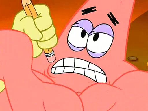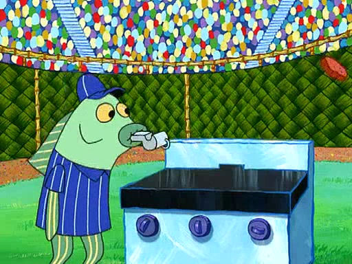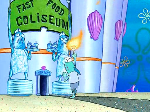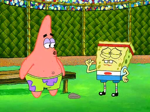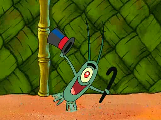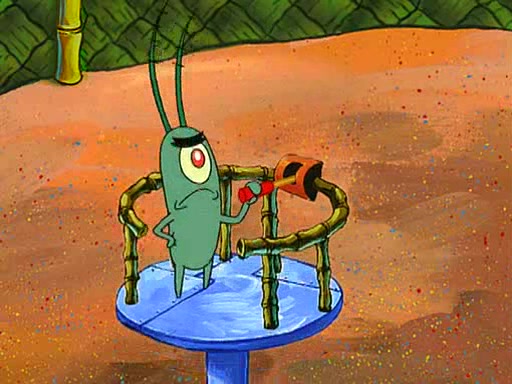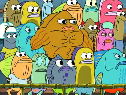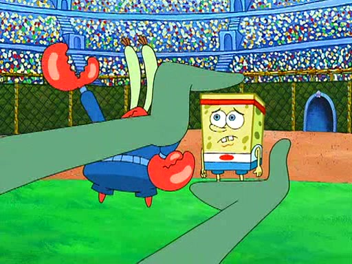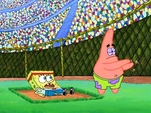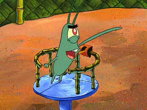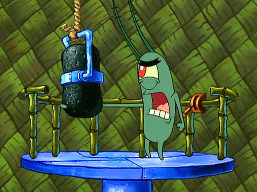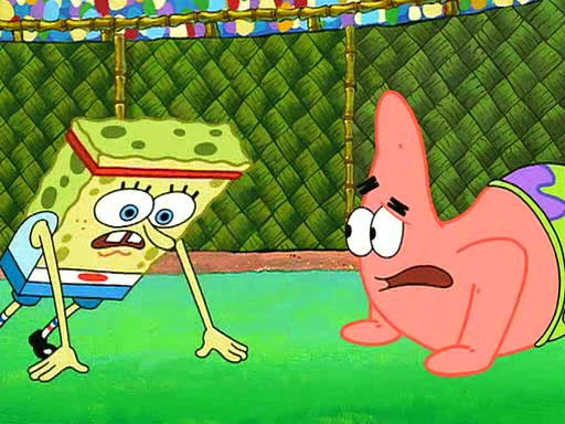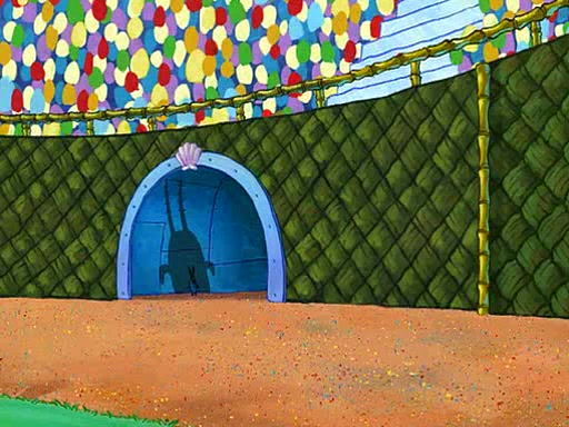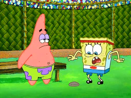 Plankton then appears and introduces his competitor, who at first appears to be a terrifyingly huge and muscular fish which the audience is even scared of, but he is only carrying the real contestant strapped on his back, who is none other than Patrick Star himself, who got a job at the Chum Bucket in order to compete, only having worked there for 5 minutes.