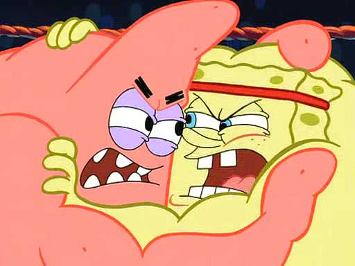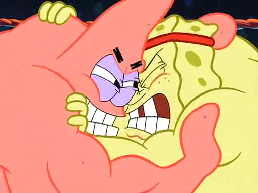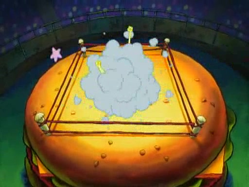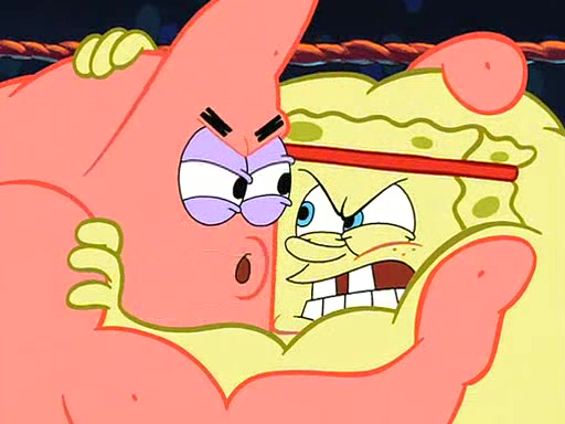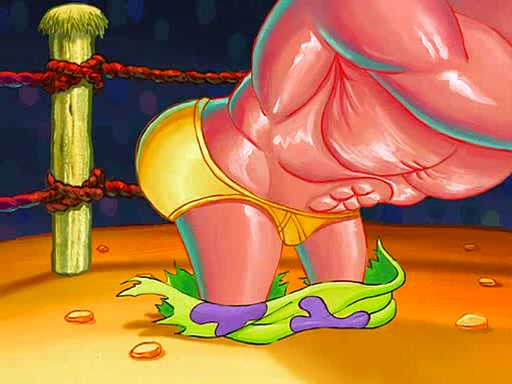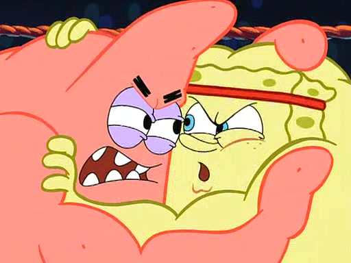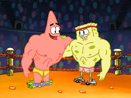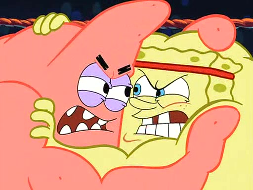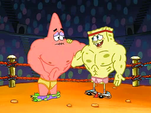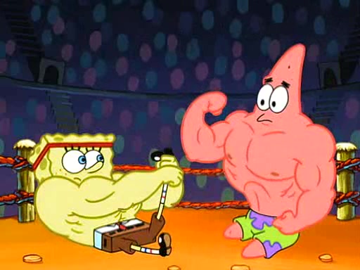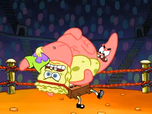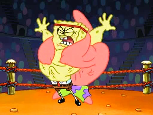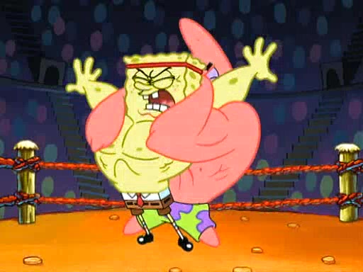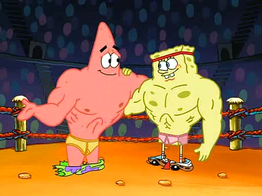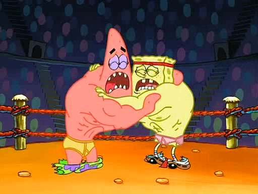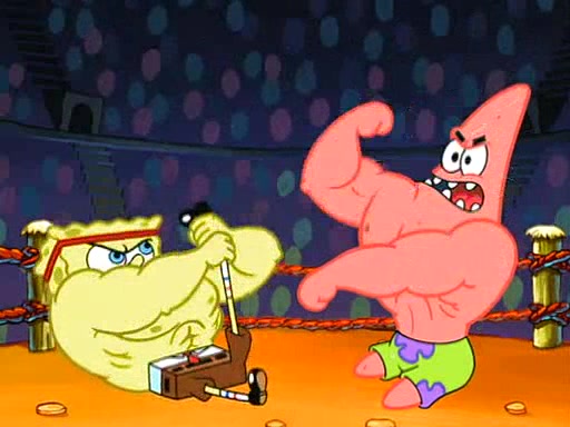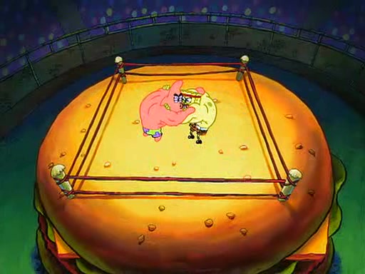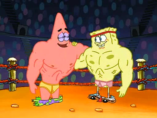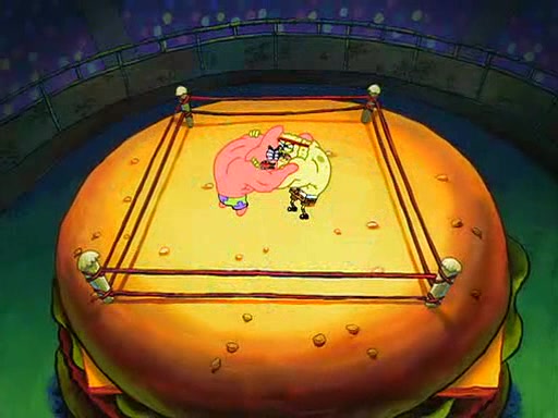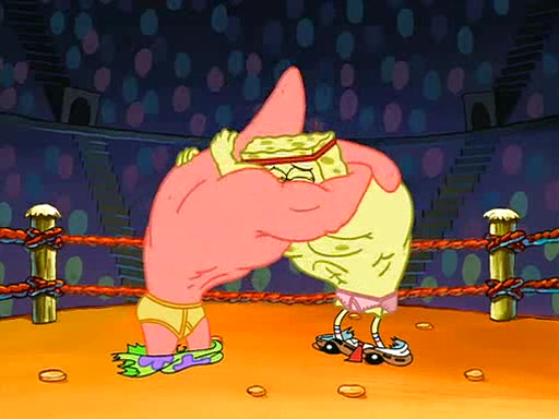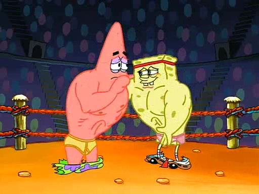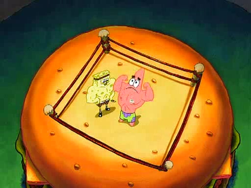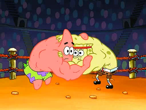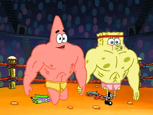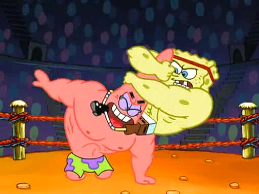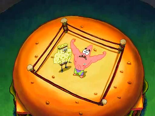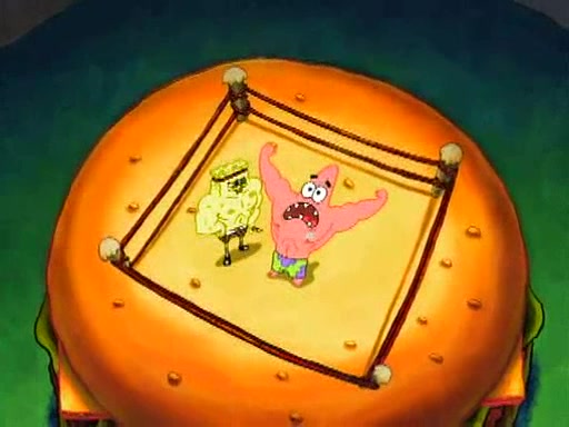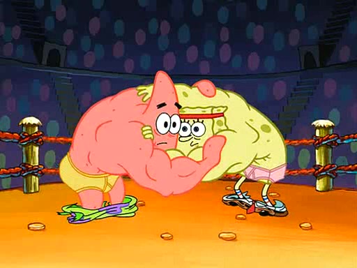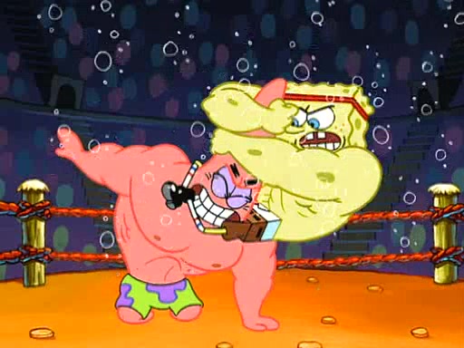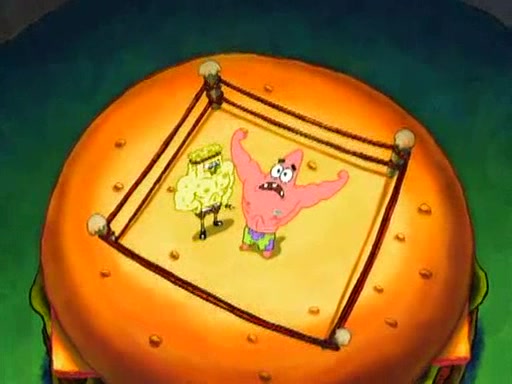 Finally, after a short montage, SpongeBob and Patrick's scores are tied when they face off against each other in the final event, "Bun Wrestling," which is just regular wrestling only on a bun. Mr. Krabs and Plankton instigate by saying: (Mr. Krabs) "Don't forget he called ye yellow" and (Plankton) "Don't forget, he called you pink!" To intimidate Patrick, SpongeBob bites a chain and grins with the chains wrapped around his teeth looking similar to braces. To intimidate SpongeBob, Patrick rips a lemon in half an pushes the halves into his eyes, then screams. SpongeBob rips his robe off revealing a large muscular body. Patrick follows by ripping his robe off, revealing only a business outfit. He realizes his mistake and tears of the suit revealing a body similar to SpongeBob's. As the bell sounds for the fight to begin, they jump into the air yelling. They collide and begin fighting.